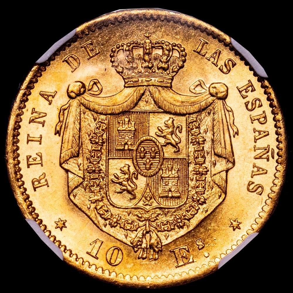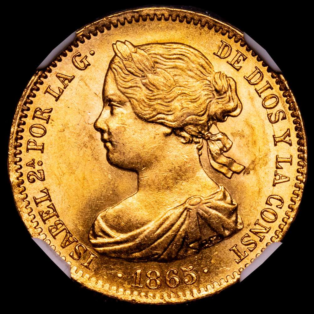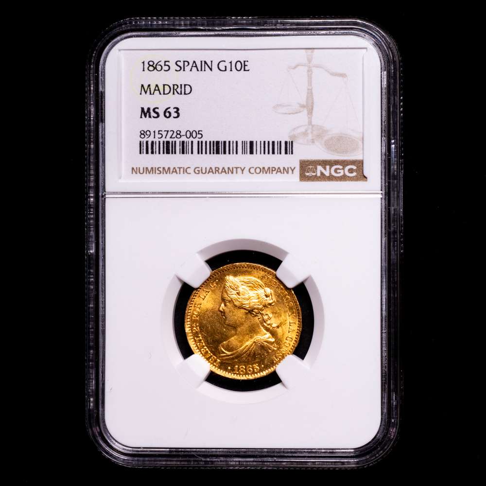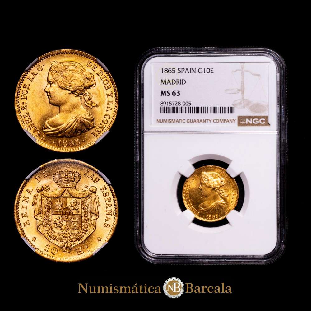 Numismática Barcala > Productos > Isabel II (1833-1868). 10 escudos. 1865. Madrid. (Cal-810). Au. 8,41 g. Brillo original. Encapsulada por NGC como MS 63.