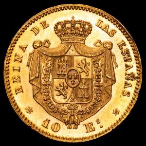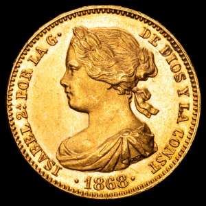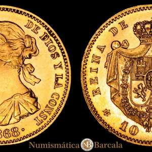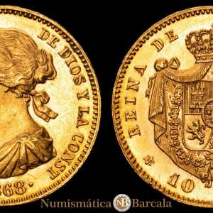 Numismática Barcala > Productos > Isabel II (1833-1868). 10 escudos. 1868*18-68. Madrid. (Cal-815). Au. 8,35 g. Bonito color. Brillo original. UNC.