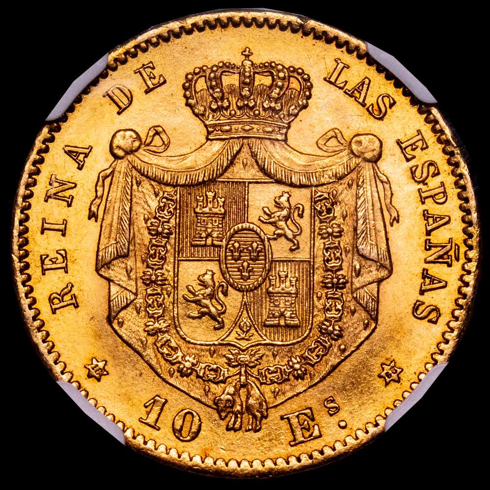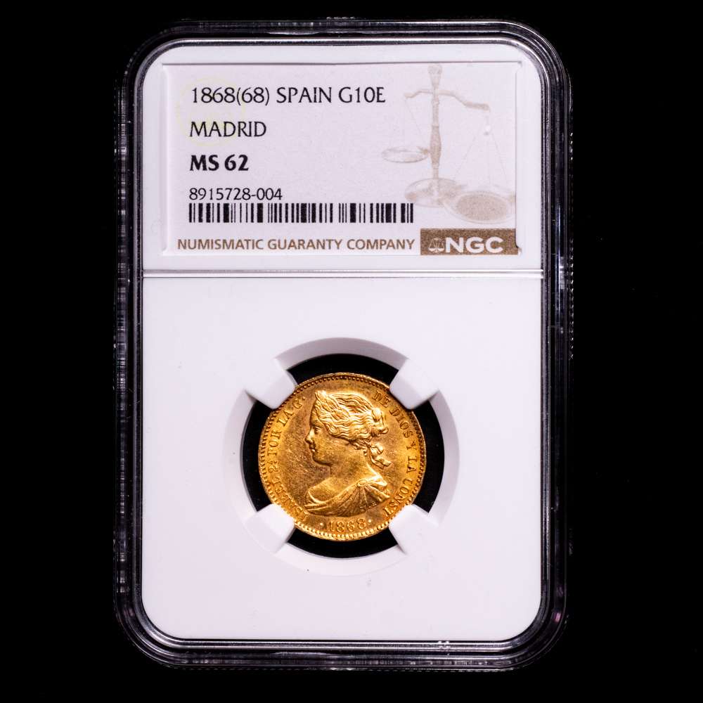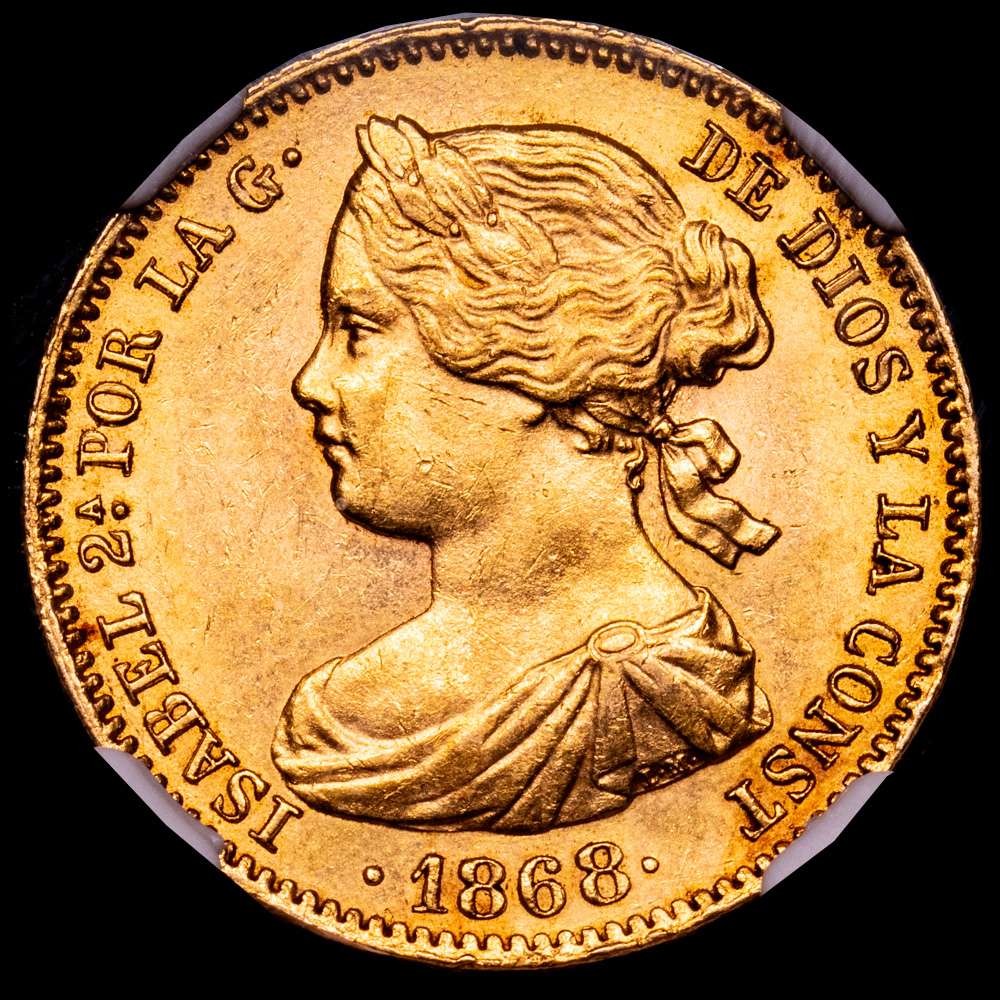 Isabel II (1833-1868). 10 escudos. 1868*18-68. Madrid. (Cal-815). Au. Brillo original. Encapsulada por NGC como MS 62.