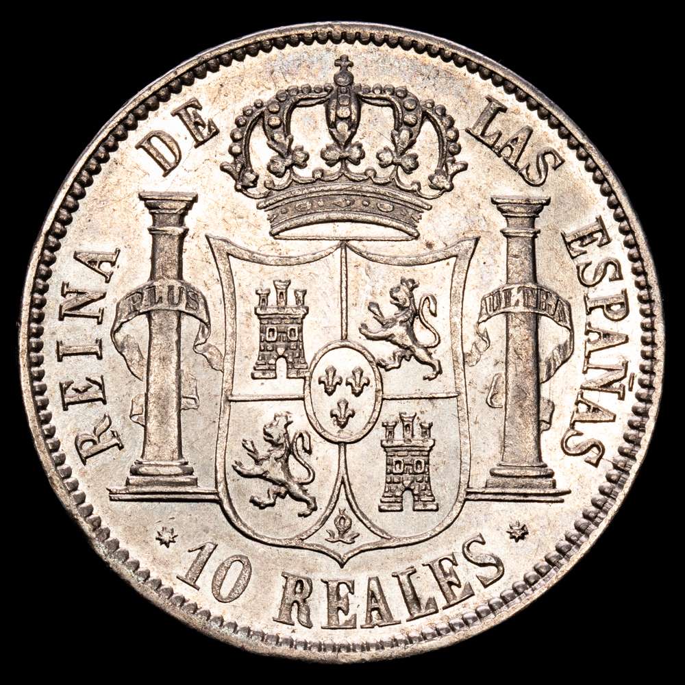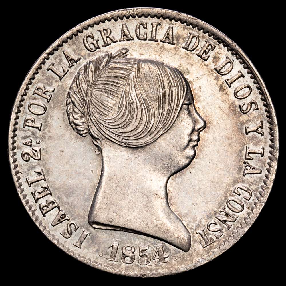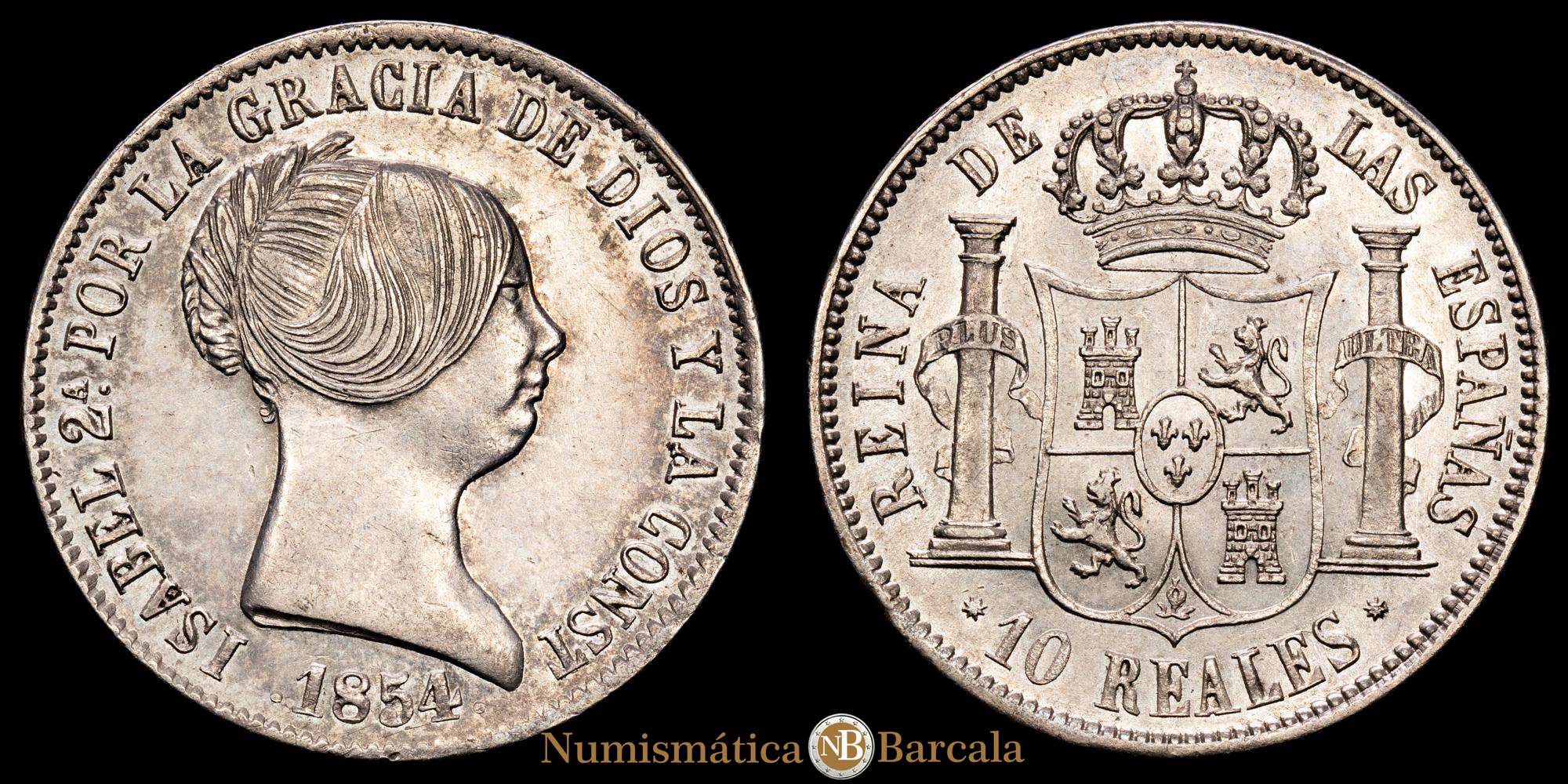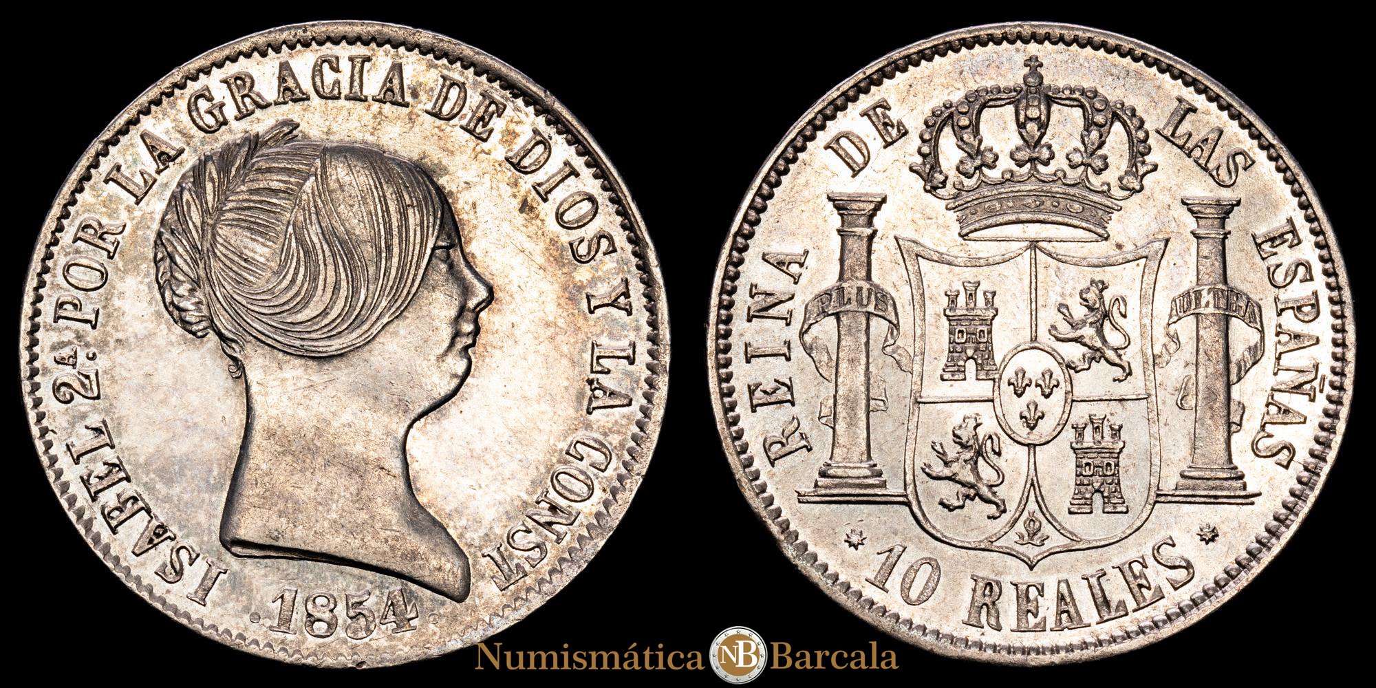 Isabel II (1833-1868). 10 reales. 1854. Barcelona. (Cal-509). Peso: 13,05 g. Restos de brillo original. Escasa. EBC.