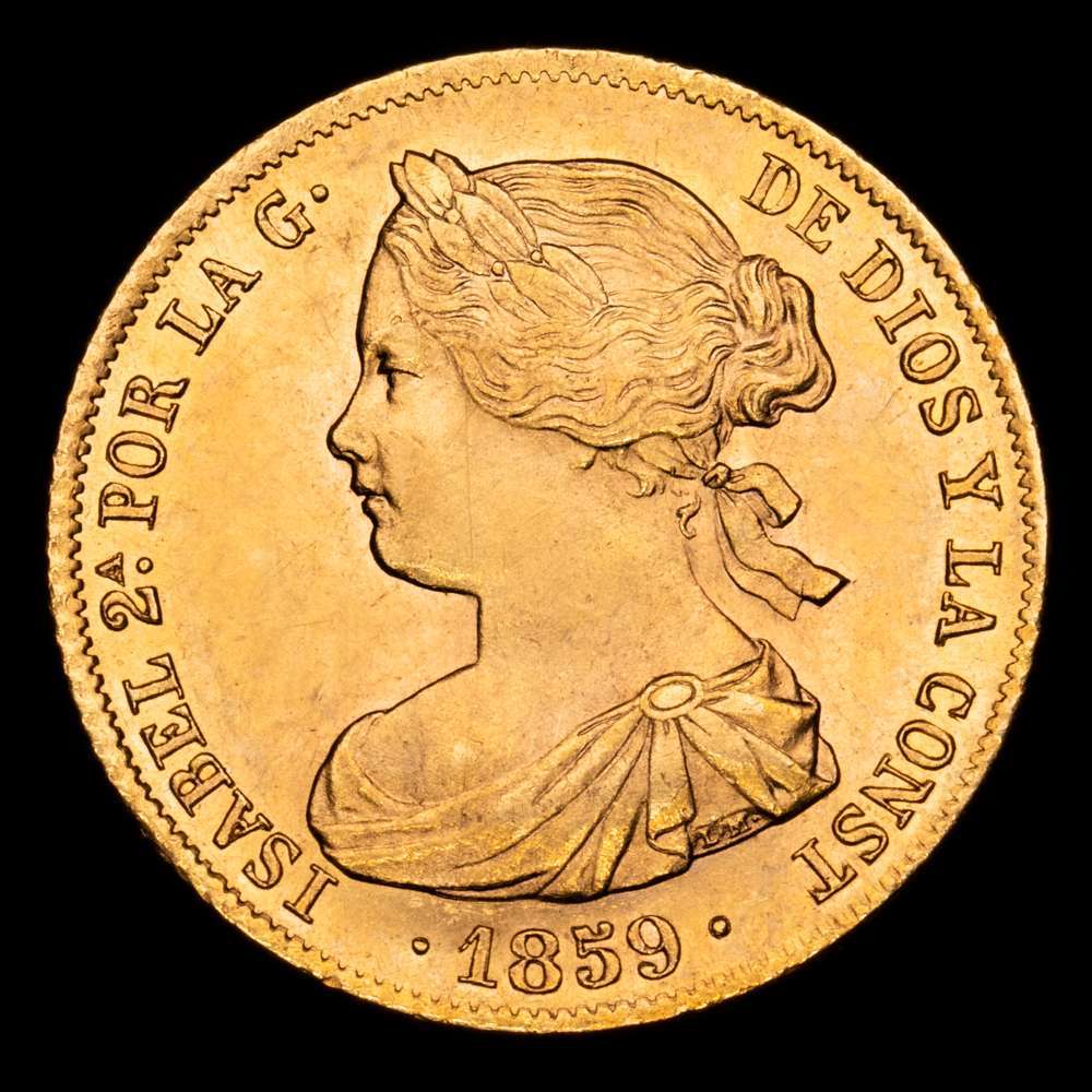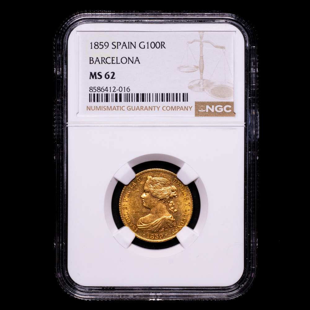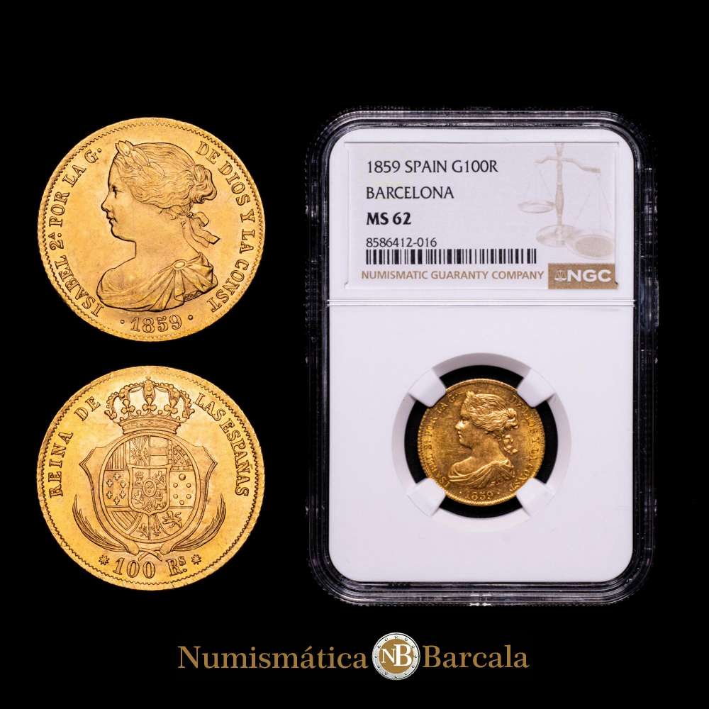 Numismática Barcala > Productos > Isabel II (1833-1868). 100 reales. 1859. Barcelona. (Cal-770). Au. 8,37 g. Precioso color. Pleno brillo original. Encapsulada por NGC como MS 62.