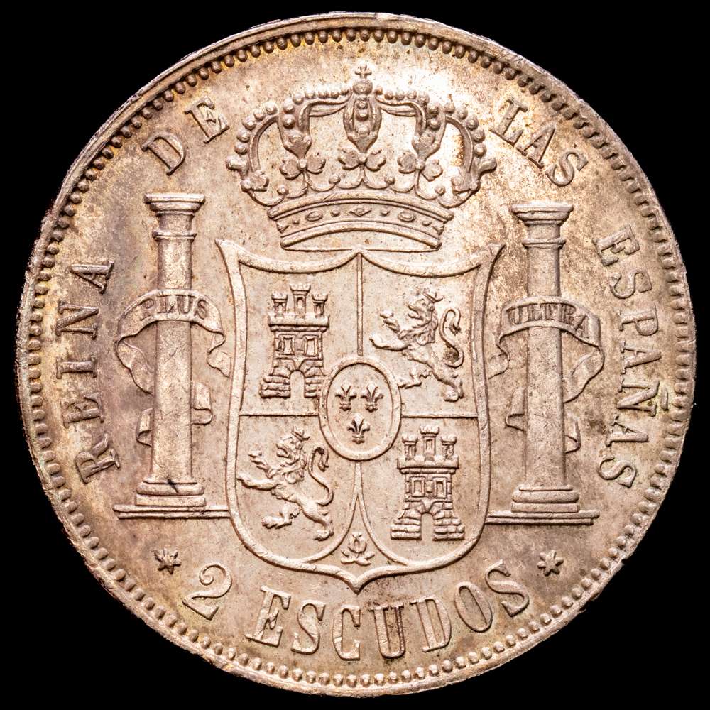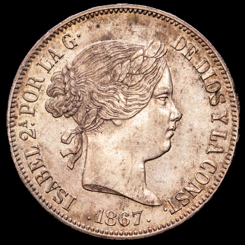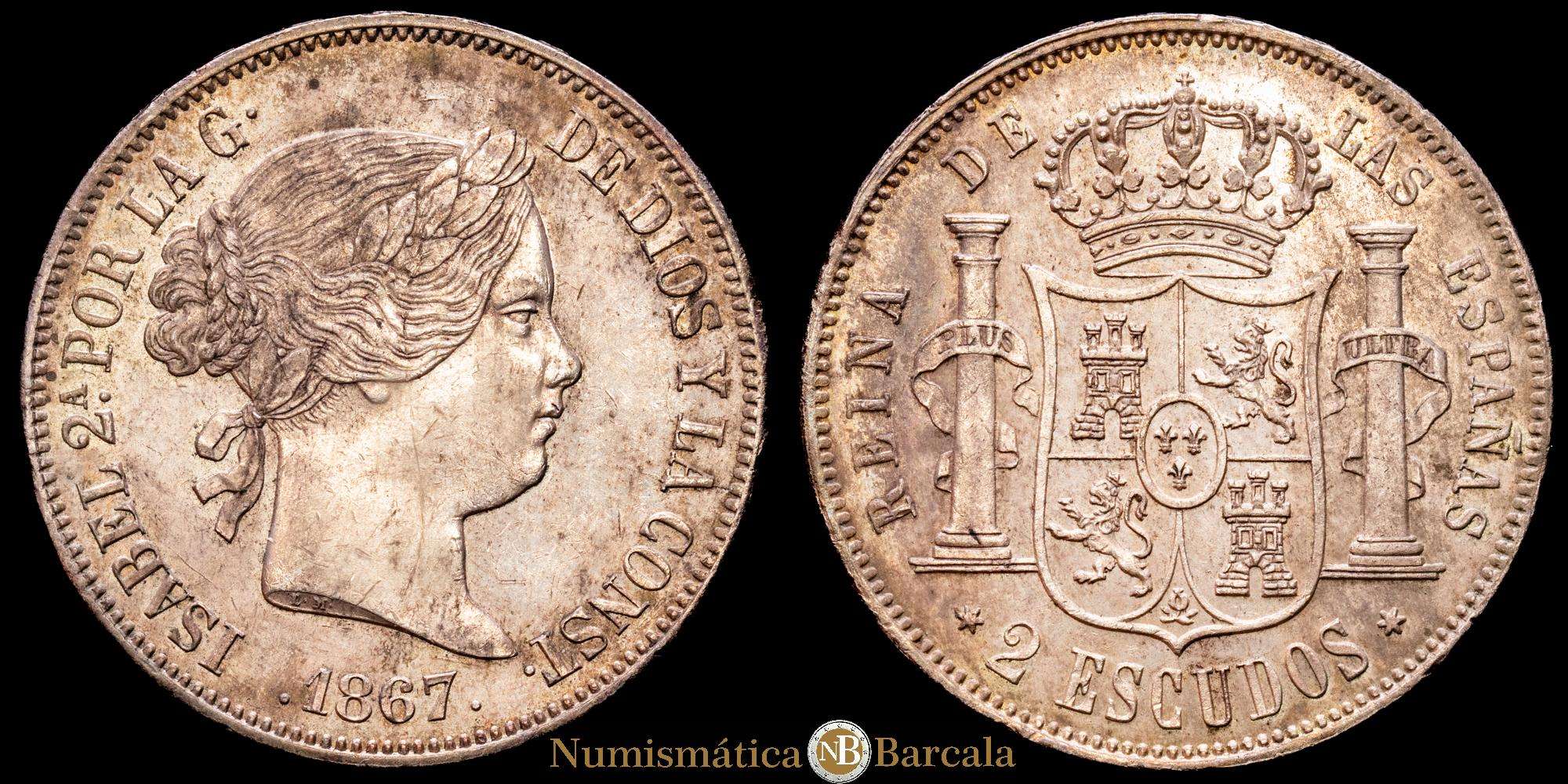 Numismática Barcala > Productos > Isabel II (1833-1868). 2 escudos. 1867. Madrid. (Cal-647). Ag. 25,89 g. Tono. EBC+/SC-.
