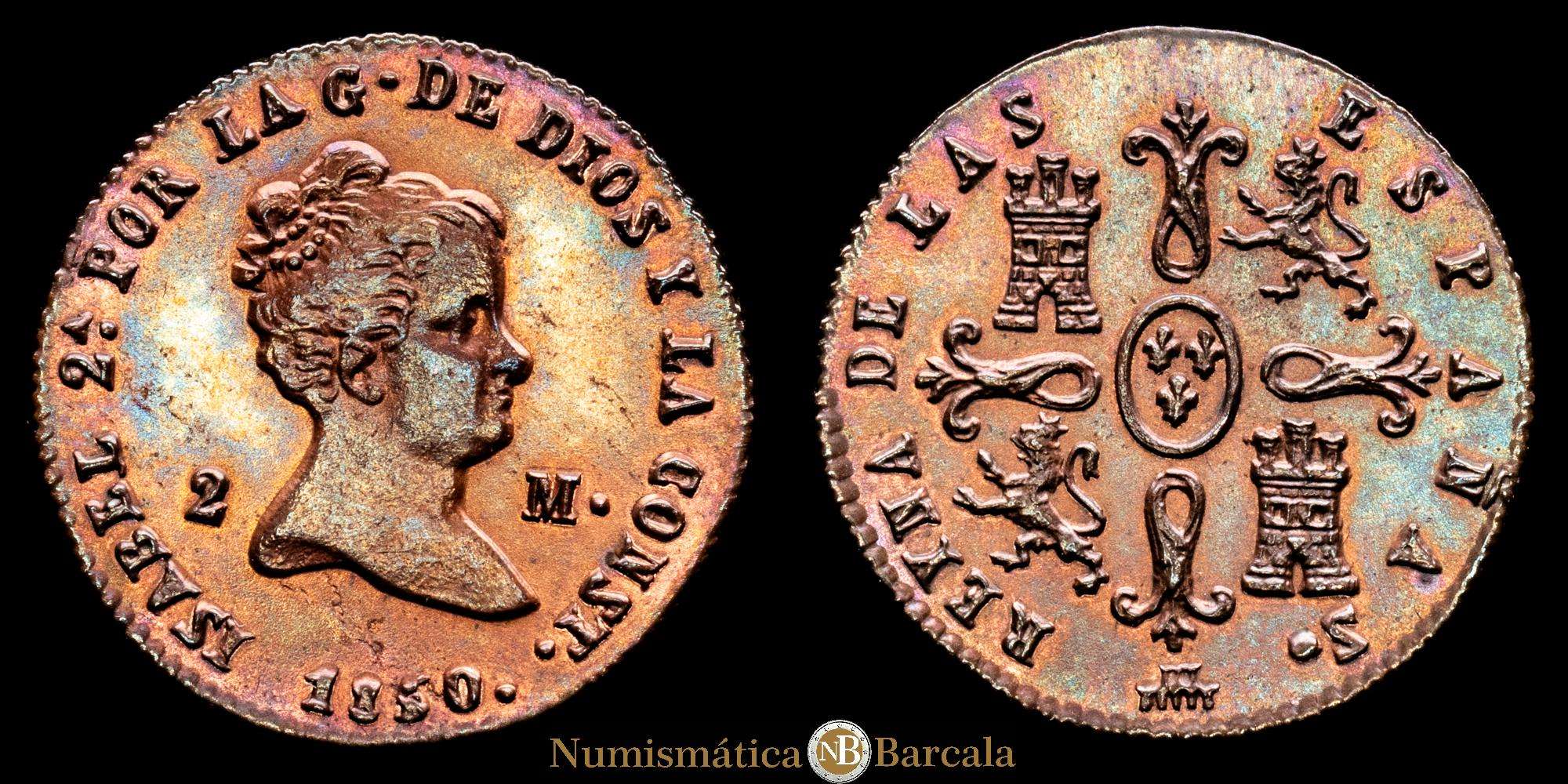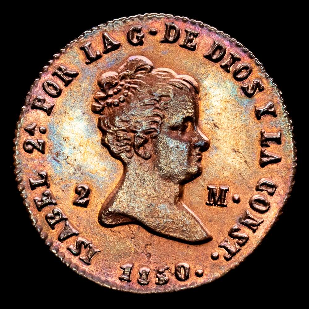 Numismática Barcala > Productos > Isabel II (1833-1868). 2 maravedís. 1850. Segovia. (Cal-63). Ae. 2,51 g. Restos de brillo original. SC-.