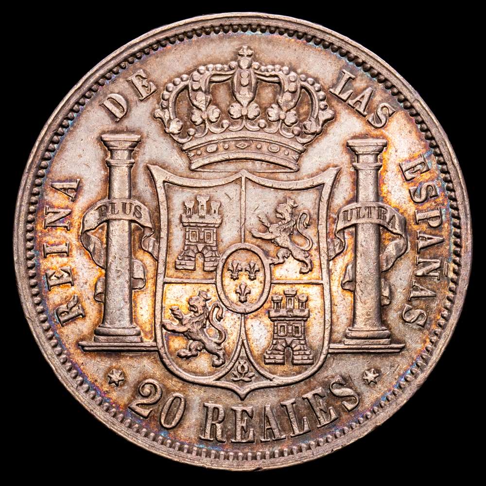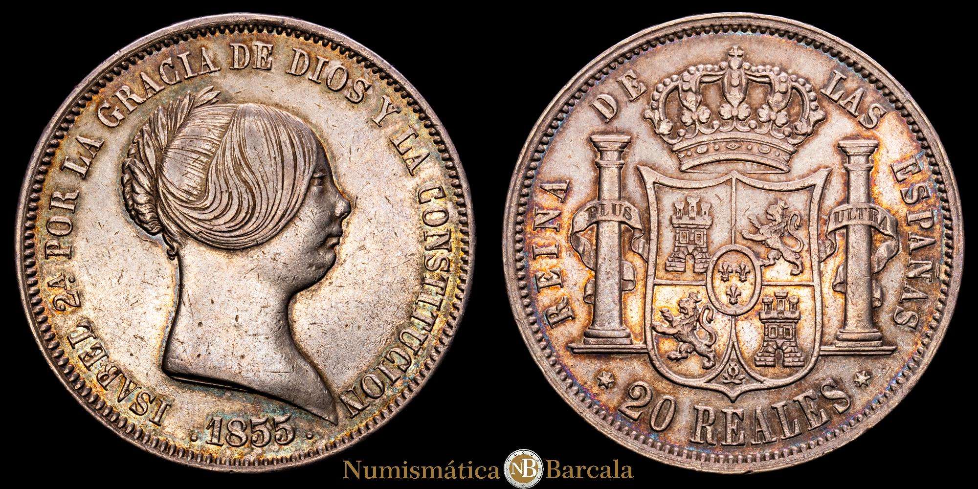 Numismática Barcala > Productos > Isabel II (1833-1868). 20 reales. 1855. Madrid. (Cal-597). Ag. 25,66 g. Pátina ligeramente iridiscente. EBC-/EBC.