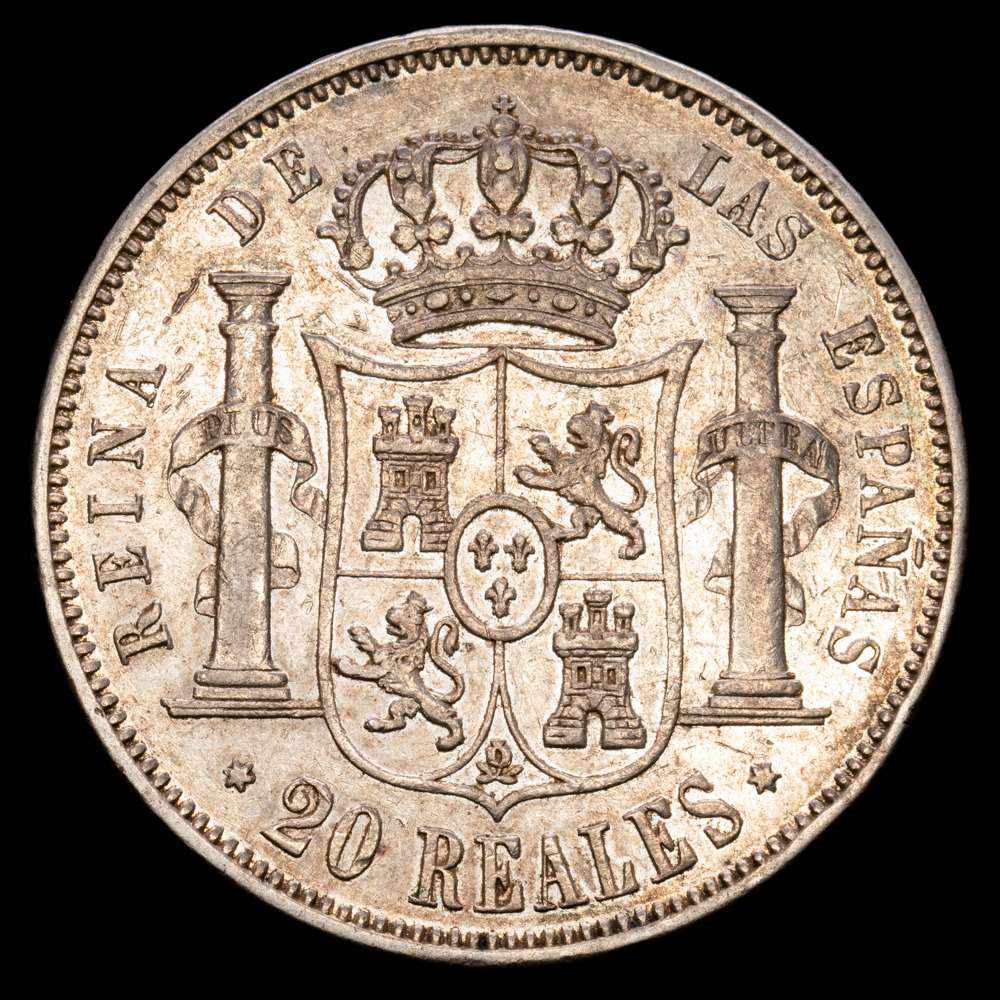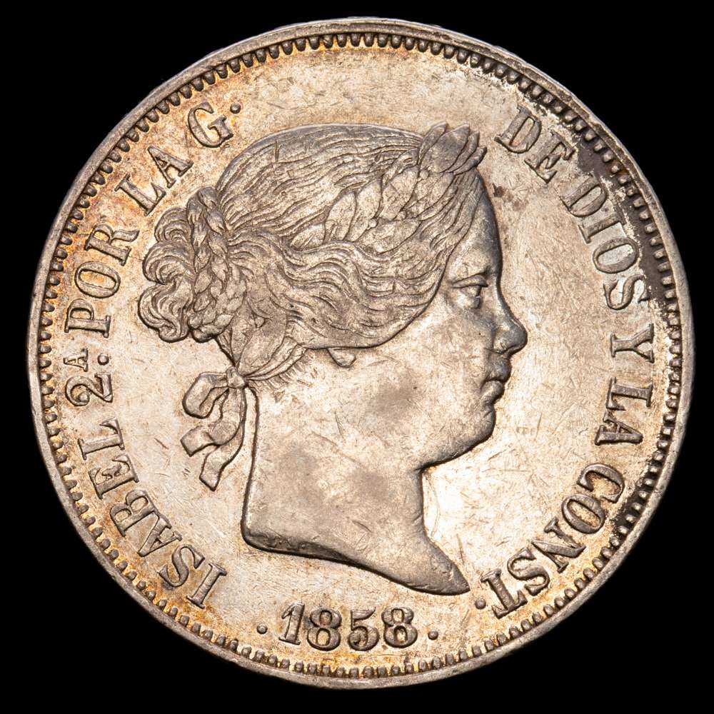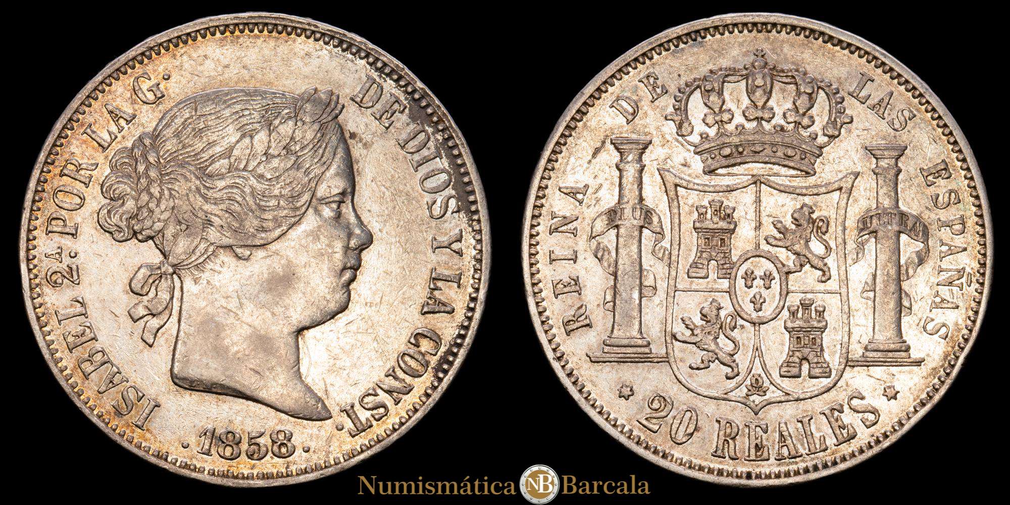 Numismática Barcala > Productos > Isabel II (1833-1868). 20 reales. 1858. Madrid. (Cal-615). Ag. 25,81 g. Golpecitos en el canto y en anverso. Tono. Escasa así. EBC-.