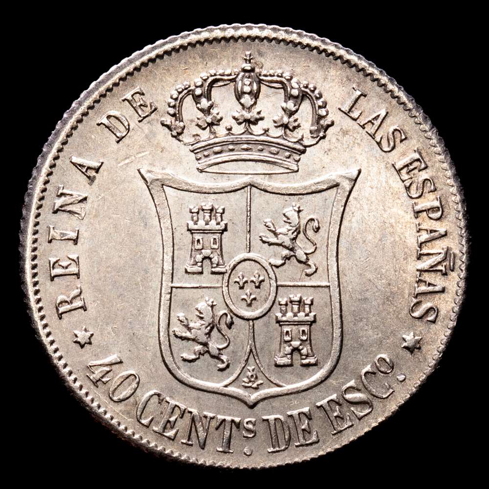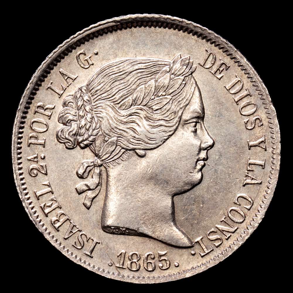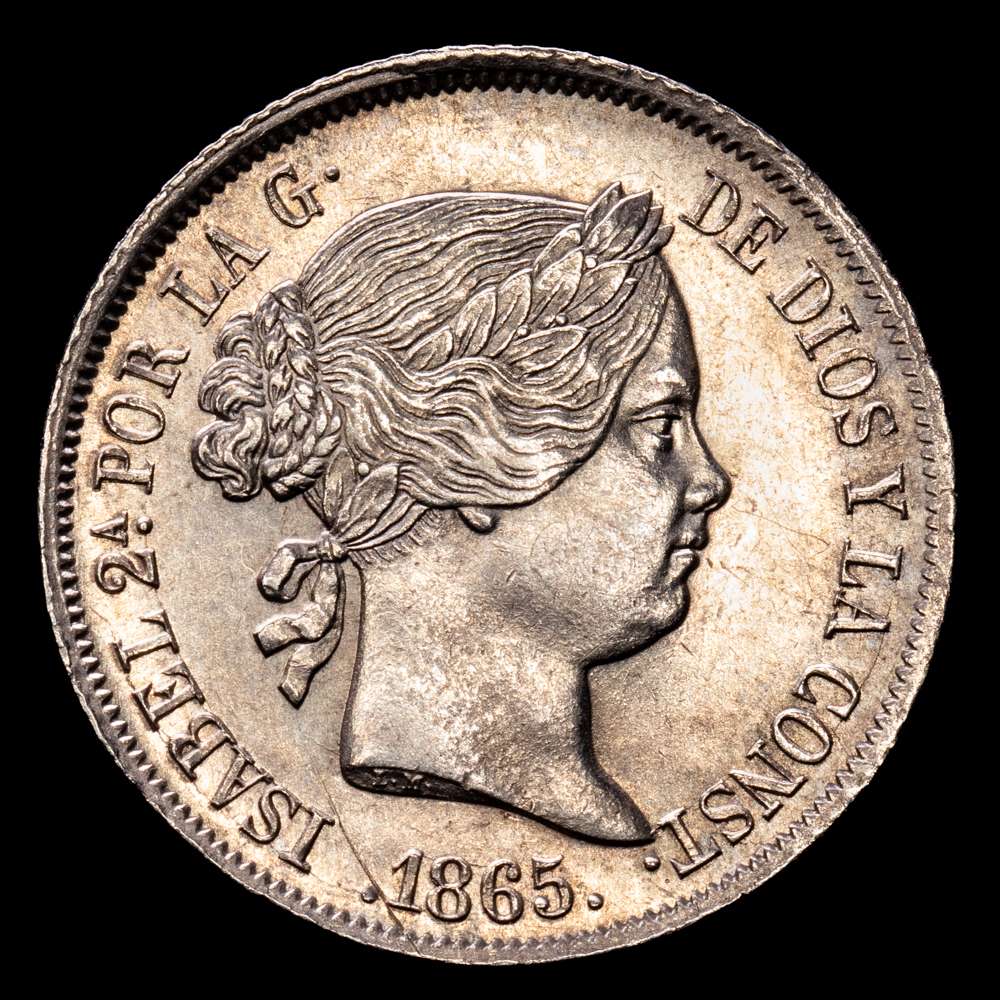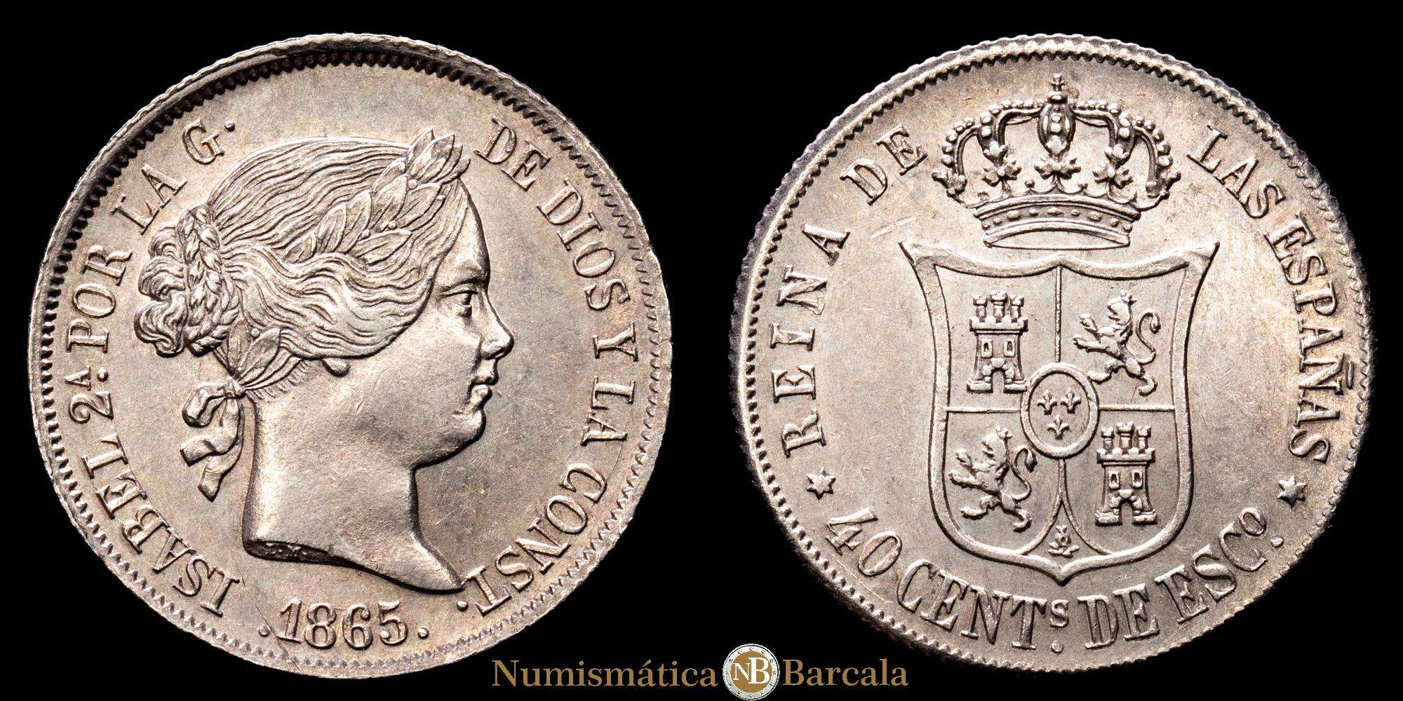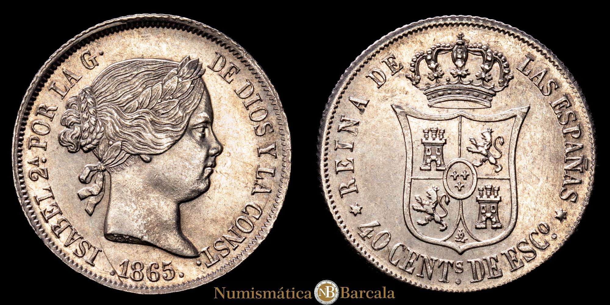Numismática Barcala > Productos > Isabel II (1833-1868). 40 céntimos de escudo. 1865. Madrid. (Cal-500). (5,22 g.). Ag. Restos de brillo original. Atractivo ejemplar. EBC+.