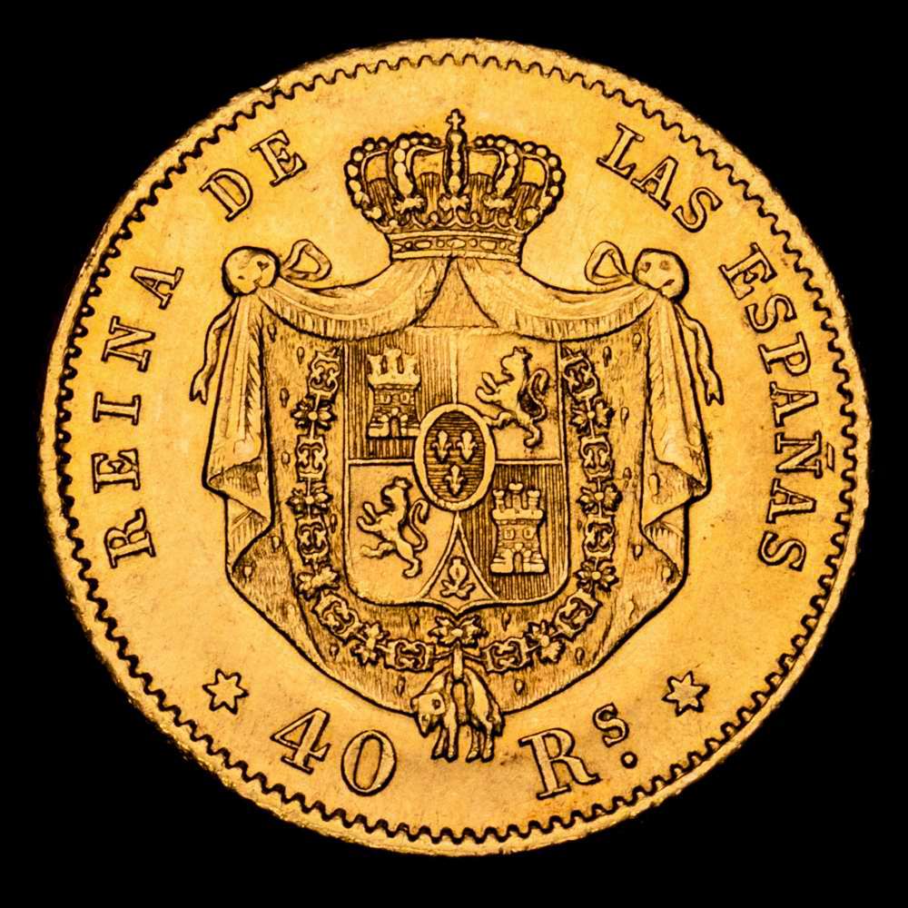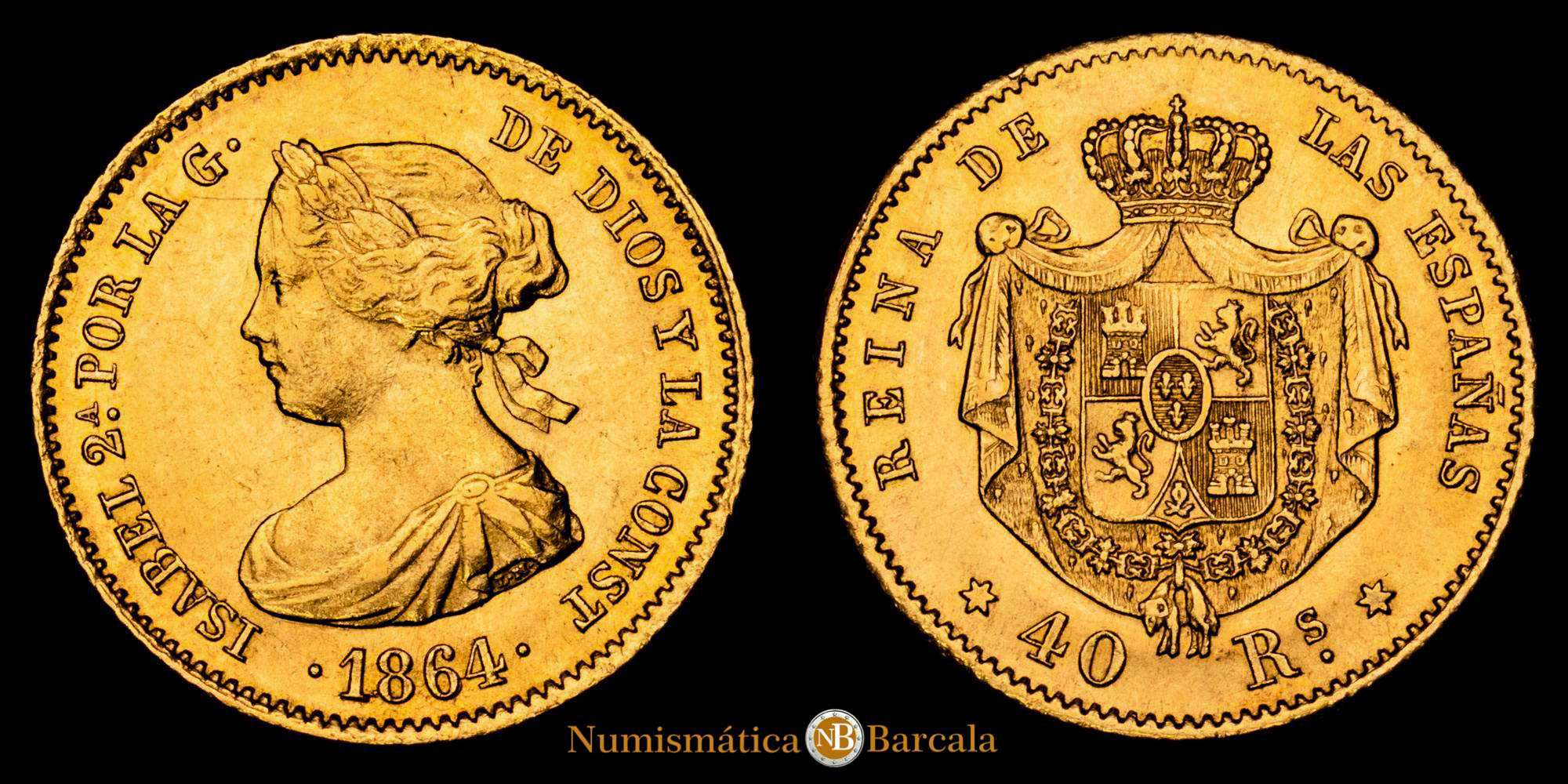 Isabel II (1833-1868). 40 reales. 1864. Madrid. (Cal-686). Au. 3,35 gramos. Parte del brillo original. EBC-.