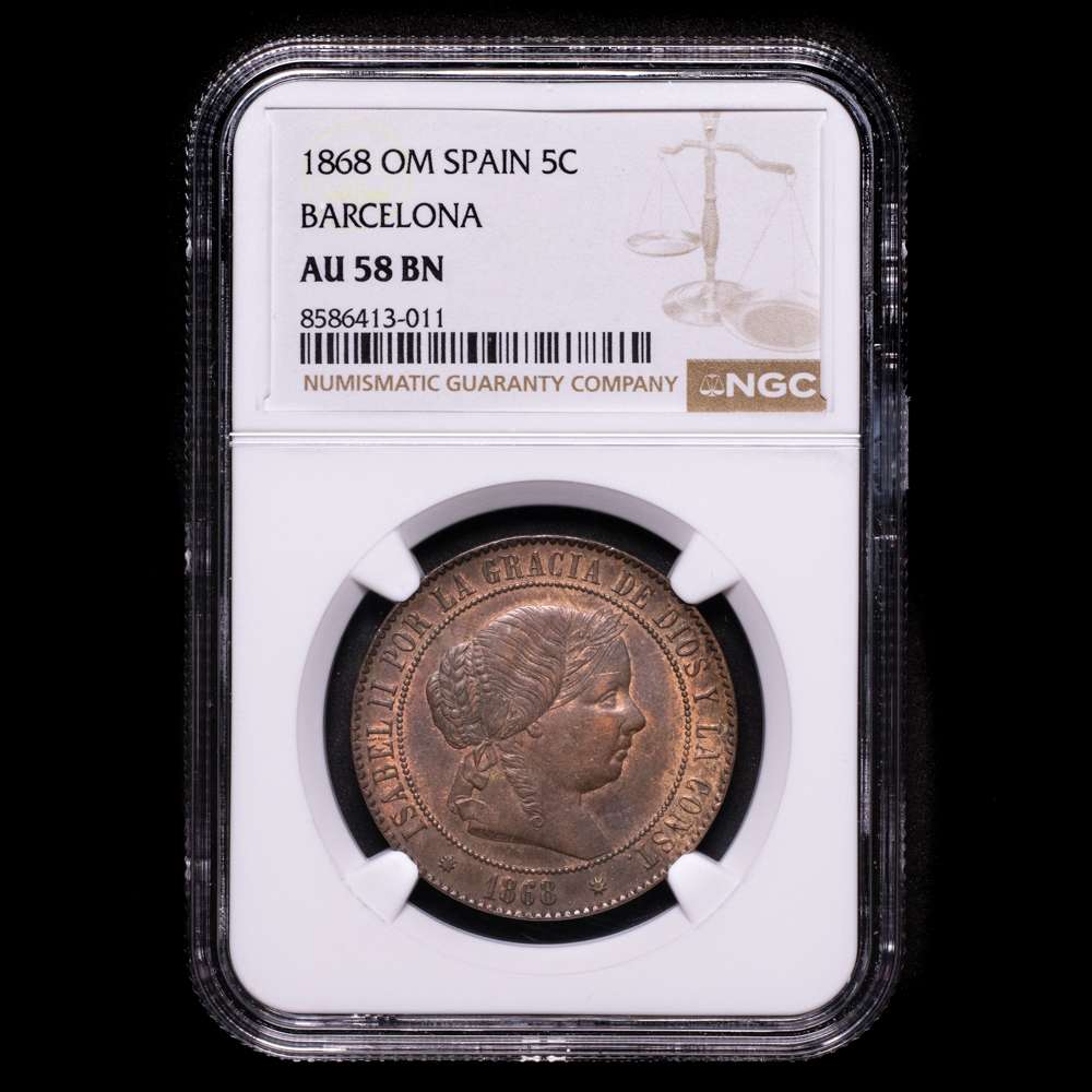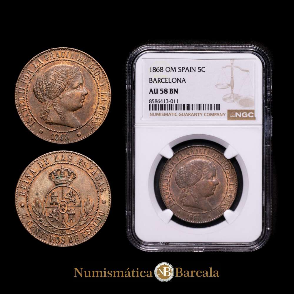 Numismática Barcala > Productos > Isabel II (1833-1868). 5 céntimos de escudo. 1868. Barcelona. (Cal-244). Ae. 12,59 g. Encapsulada por NGC como AU 58 BN.