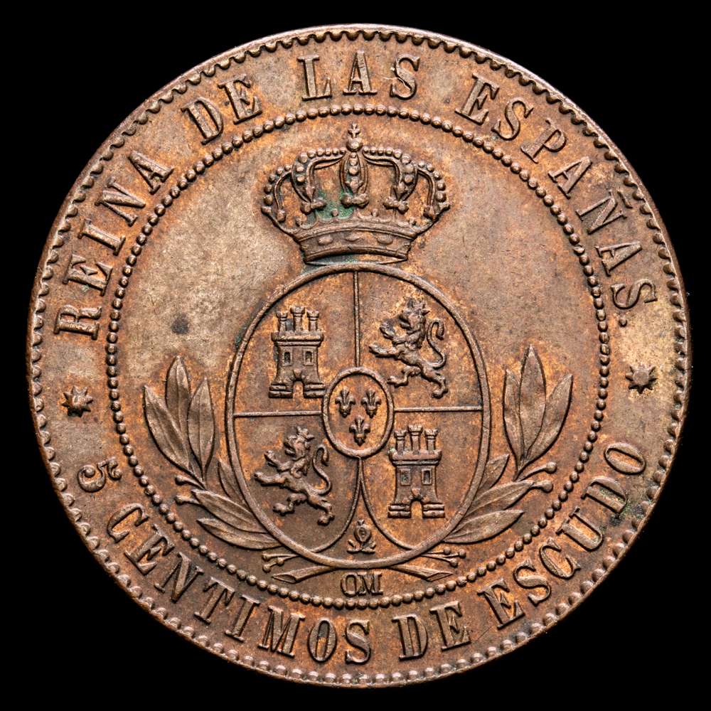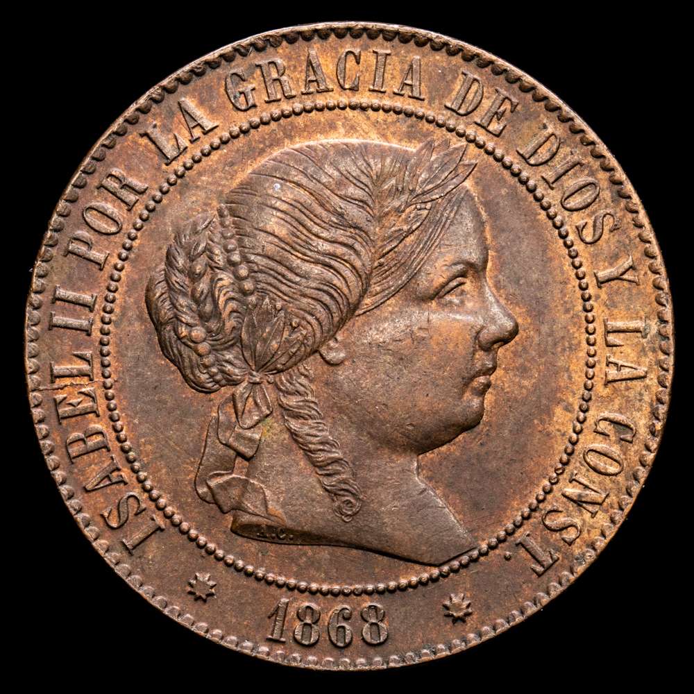 Isabel II (1833-1868). 5 céntimos de escudo. 1868. Barcelona. (Cal-244). Ae. 12,59 g. Encapsulada por NGC como AU 58 BN.