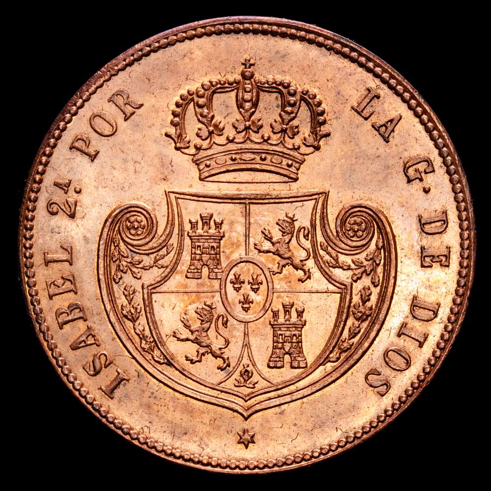 Isabel II. 2 Maravedís. (2,33g.). Barcelona. 1858. AC-37. SC. Muy rara en esta presentación!
