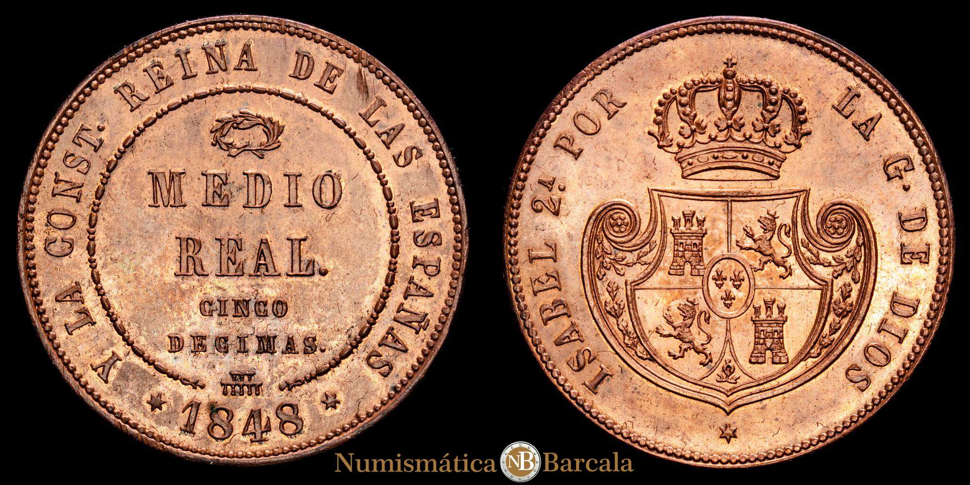 Numismática Barcala > Productos > Isabel II (1833-1868). Medio real. 1848. Segovia. (Cal-153). Ae. 19,43 gramos. Rarisísima. SC. Soberbio y bellísimo ejemplar. Rarísimo en esta sobresaliente presentación.