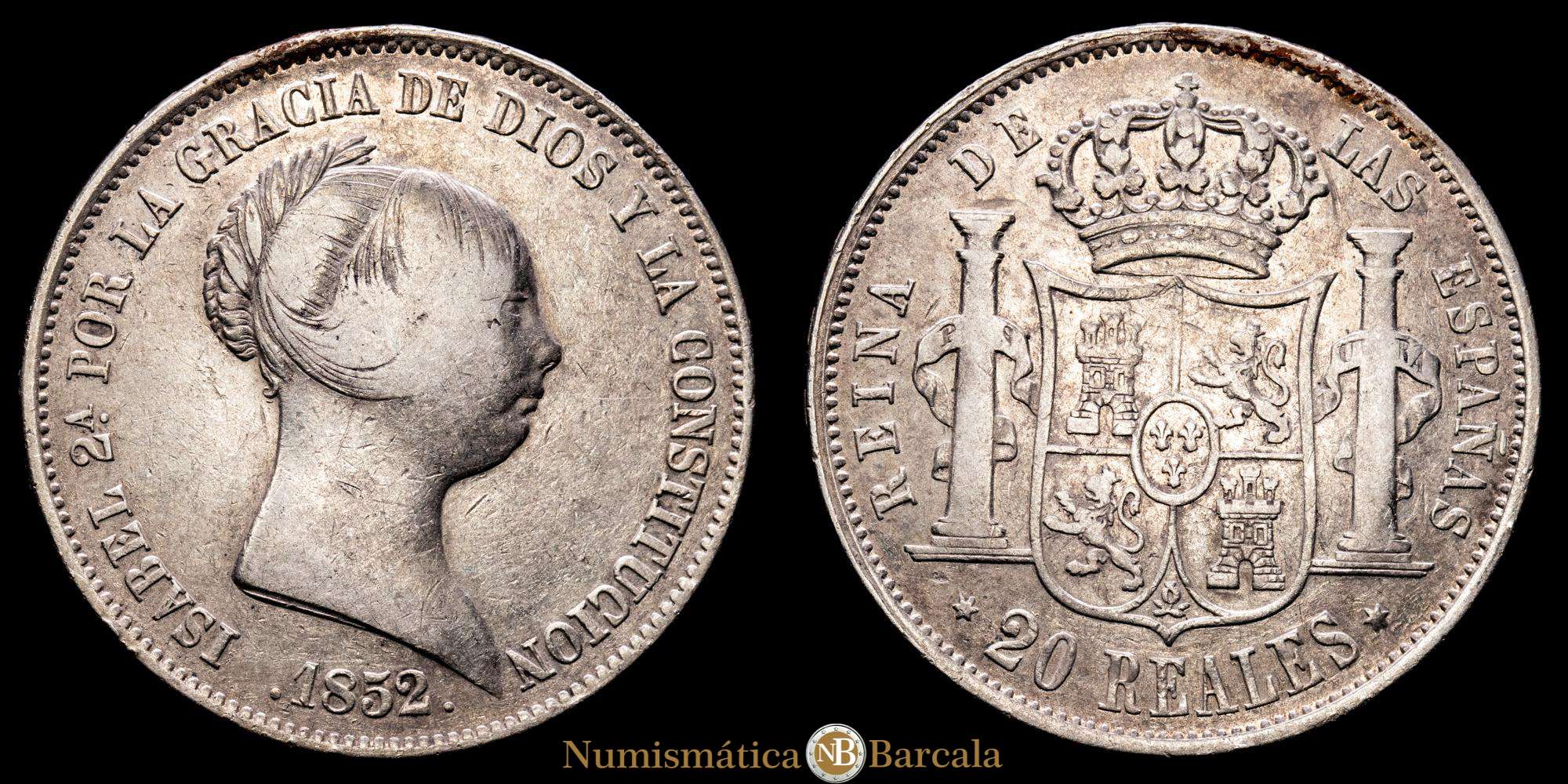 Numismática Barcala > Productos > Isabel II. 20 Reales. (25,9 g.). Madrid. 1852. AC-594. MBC-/MBC.