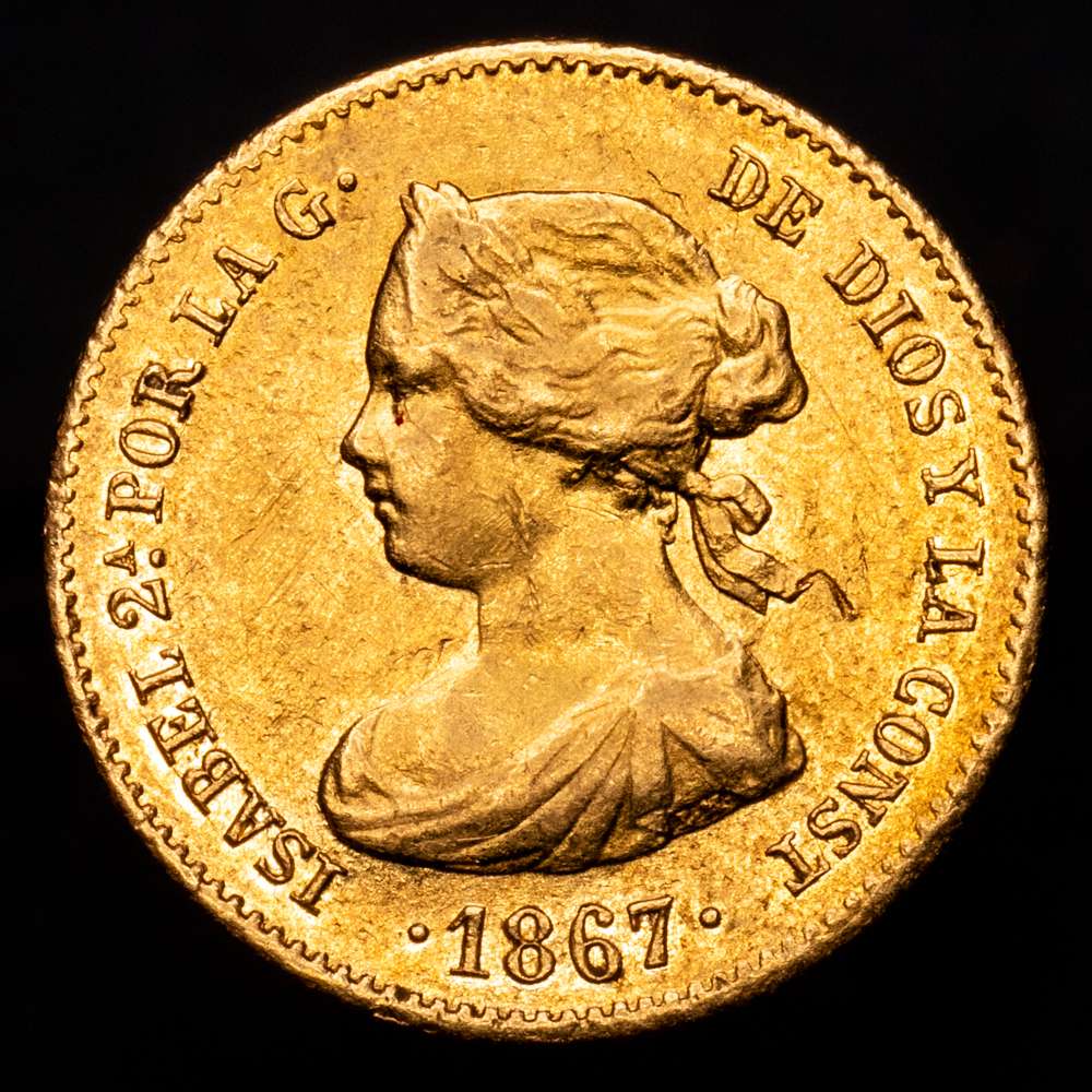 Isabel II. 4 Escudos. 1867. MADRID. 3,31 grs. Restos de brillo original. AC-691. MBC+/EBC.