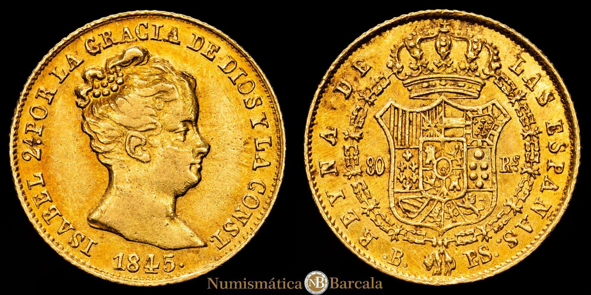 Numismática Barcala > Productos > Isabel II. 80 Reales. (6,75 g.). Barcelona. 1845. P·S. Leves restos de brillo original. AC-713. MBC+.
