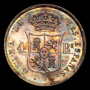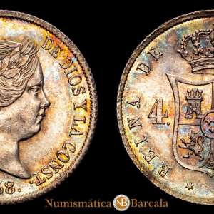 Numismática Barcala > Productos > Isabel II. Madrid. 4 reales. 1858. (AC.464). 5,26 gramos. Muy bella. Brillo original. Escasa así. Bonita pátina irisada. UNC-.