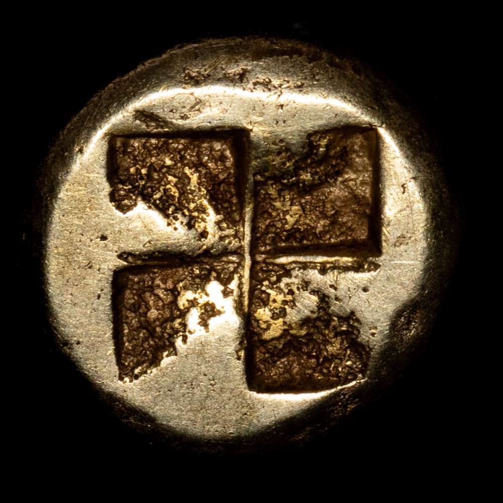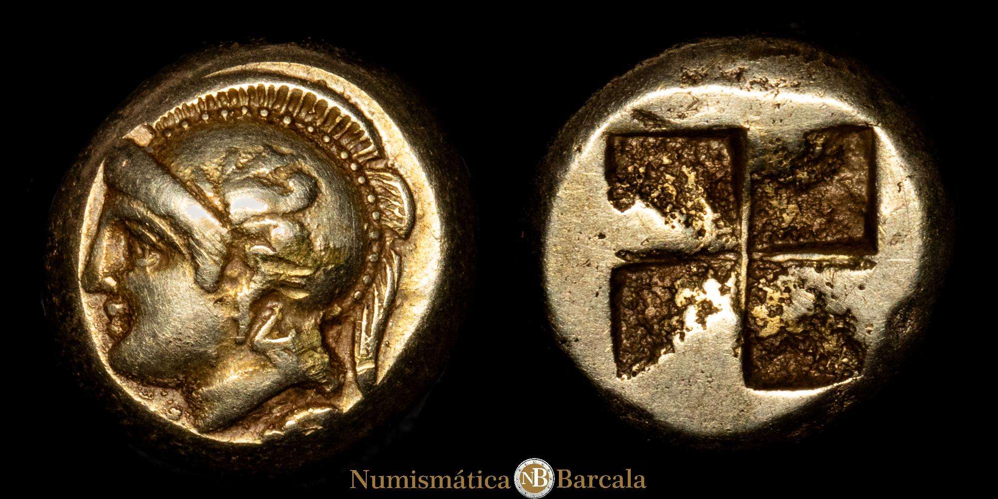 Jonia. Focea. El Hekte (c. 478-387 a.c.). Anv:Cabeza de Atenea con casco a la izquierda; debajo, pequeño sello a la izquierda. Rev: Cuadrado incuso cuatripartito. Bodenstedt 91. SNG Copenhague 1028. (2,55 g.). Muy bueno.