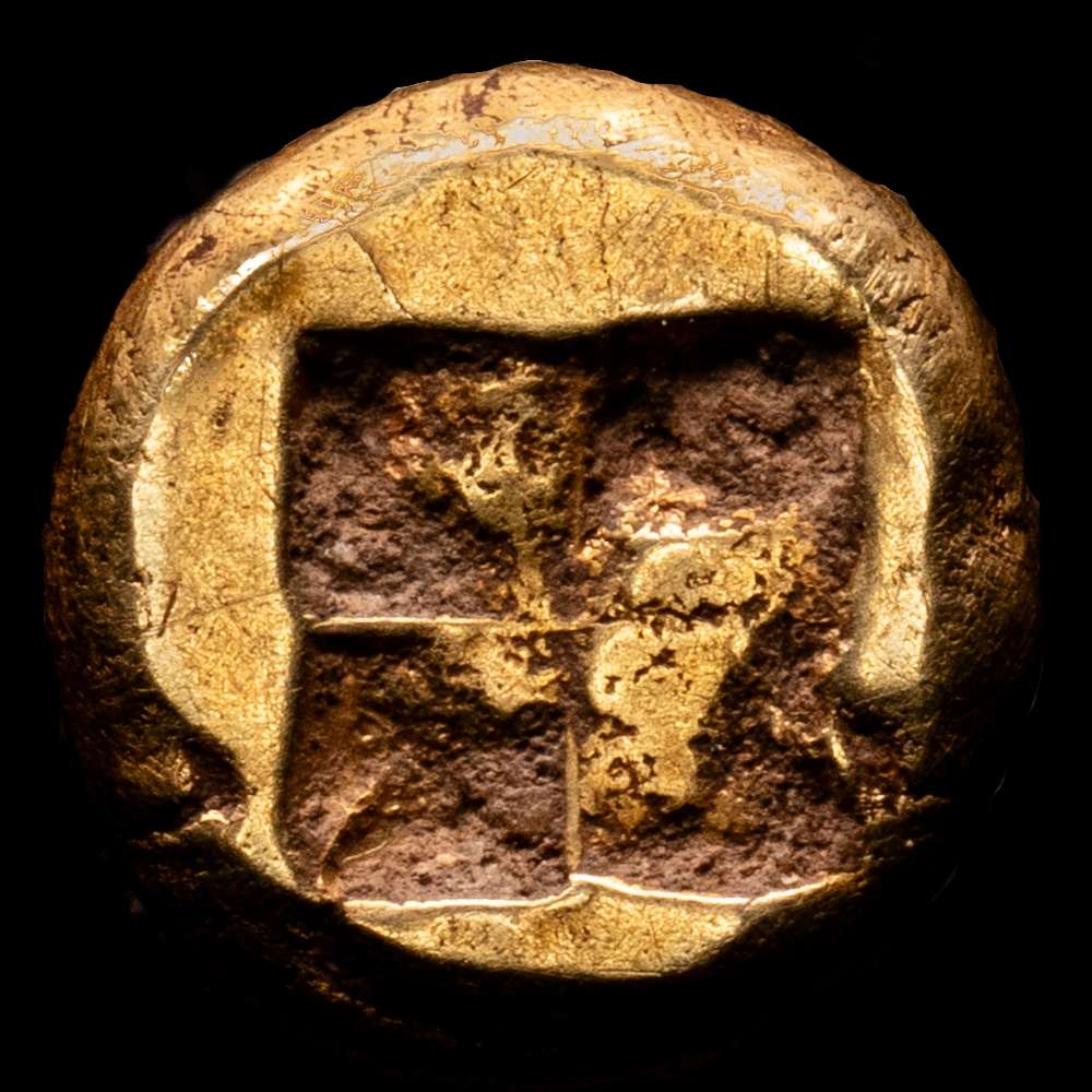 . Focea. Ca. 387-326 a. C. EL hecte (10 mm, 2,56 g). VF. Cabeza con cuernos del joven Pan a la izquierda, con corona de hiedra / Cuadrado incuso cuatripartito, parcialmente relleno. Bodenstedt 97. Situada en la costa occidental de la actual Turquía, Focea fue una antigua ciudad jónica célebre por su destreza marítima y perspicacia comercial. Este dinamismo mercantil se reflejó en la distintiva contribución de la ciudad a la historia de la acuñación de monedas. Focea fue una de las primeras ciudades en producir monedas de electro, una aleación natural de oro y plata, precursora de la posterior acuñación de monedas de oro y plata puros, más estandarizada. Esta moneda de electrum foceo, acuñada entre los siglos VI y IV a. C., se caracterizaba por una gama de diseños de gran simbolismo, que incluían criaturas místicas, deidades prominentes y emblemas cívicos, todos ellos indicativos de su vibrante vida cultural y marcados por un detalle excepcional y un alto relieve gracias a la habilidad de los grabadores de troqueles jonios.