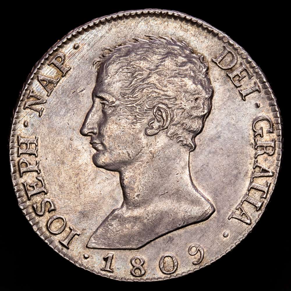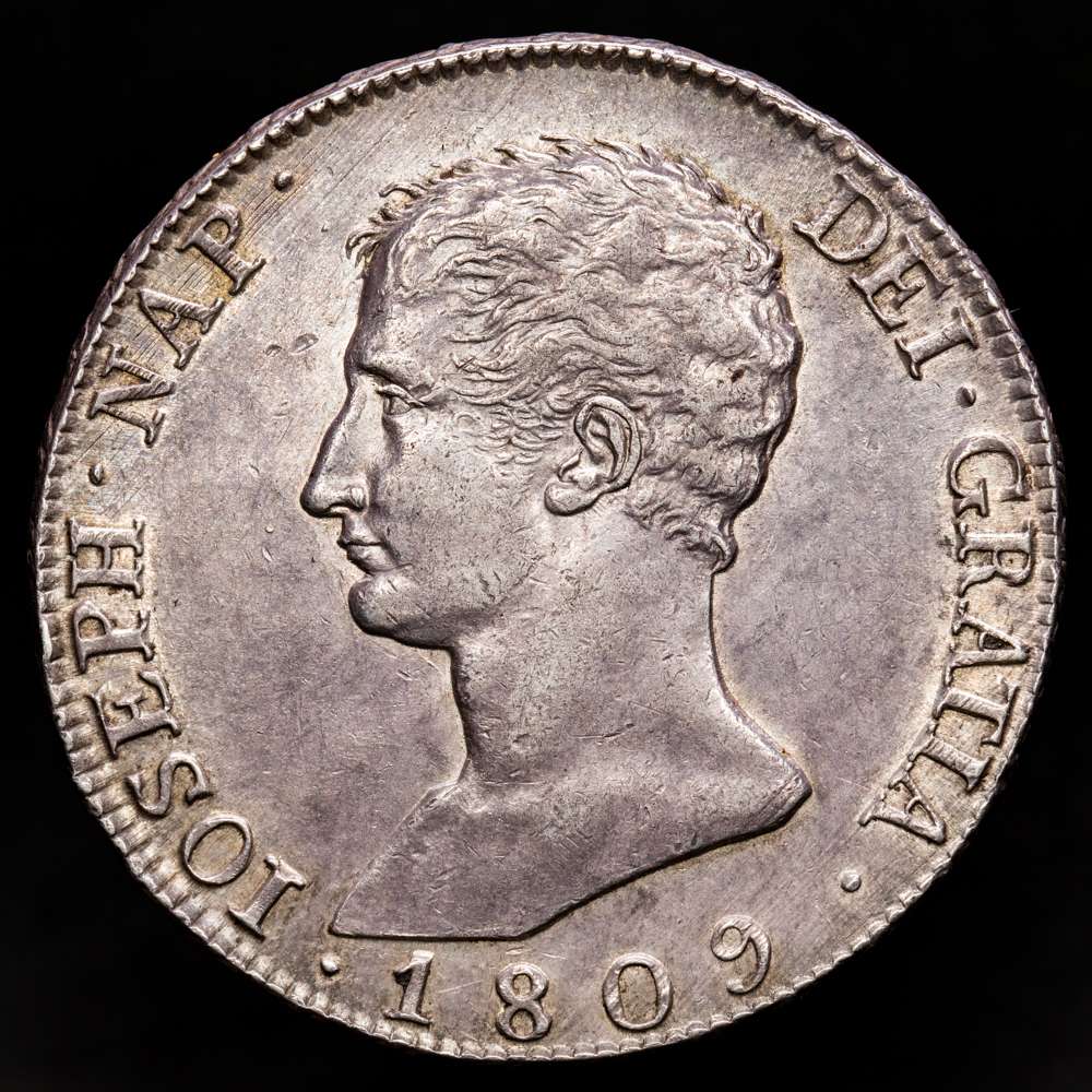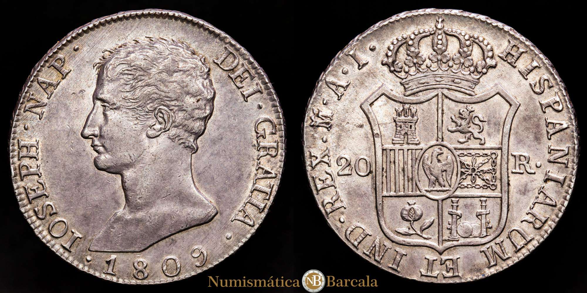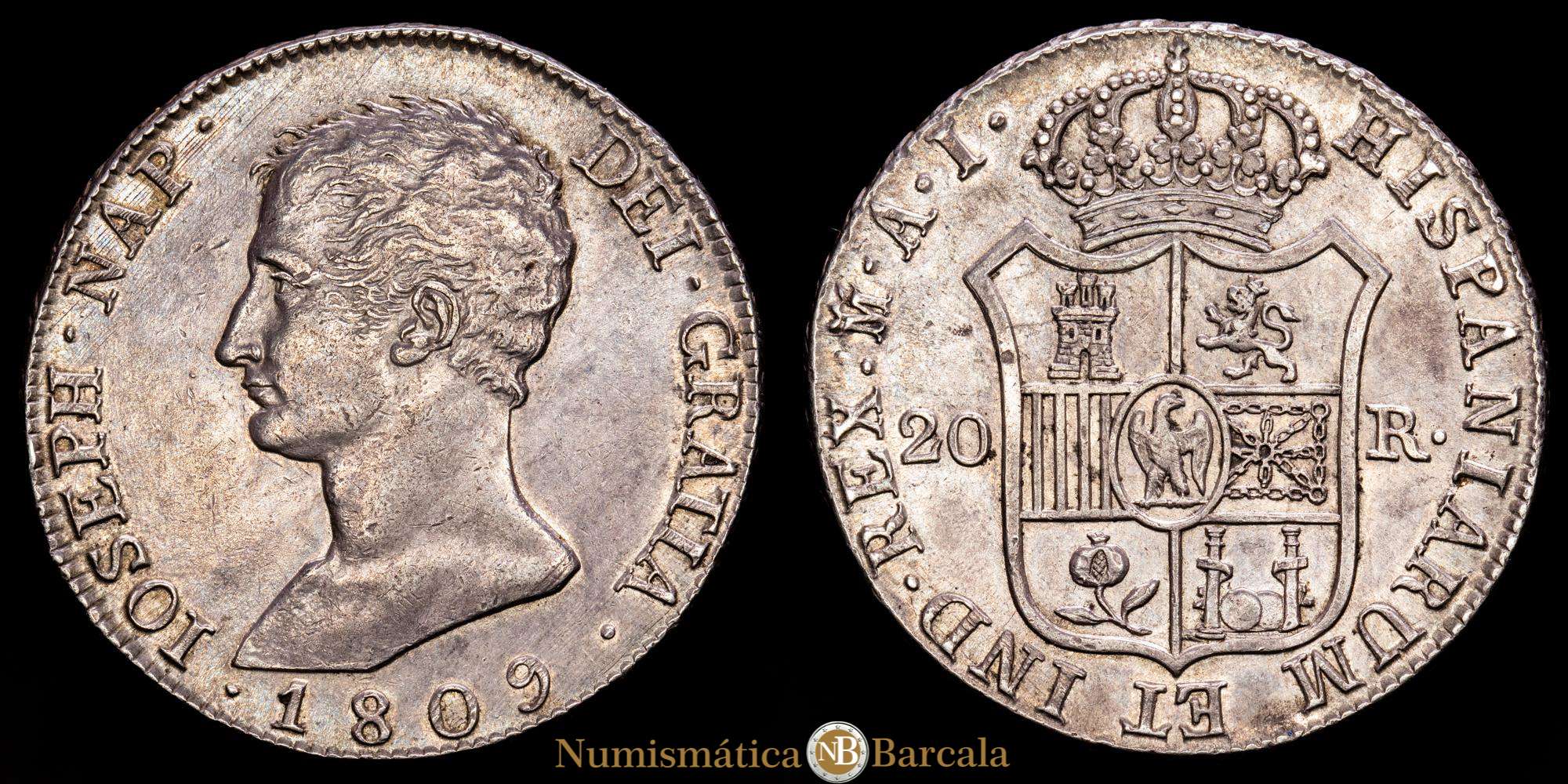Numismática Barcala > Productos > José Napoleón (1808-1814). 20 reales. 1809. Madrid. AI. (Cal 2019-36). Ag. 27,07 g. Águila grande. Bonita pátina de monetario. EBC+.