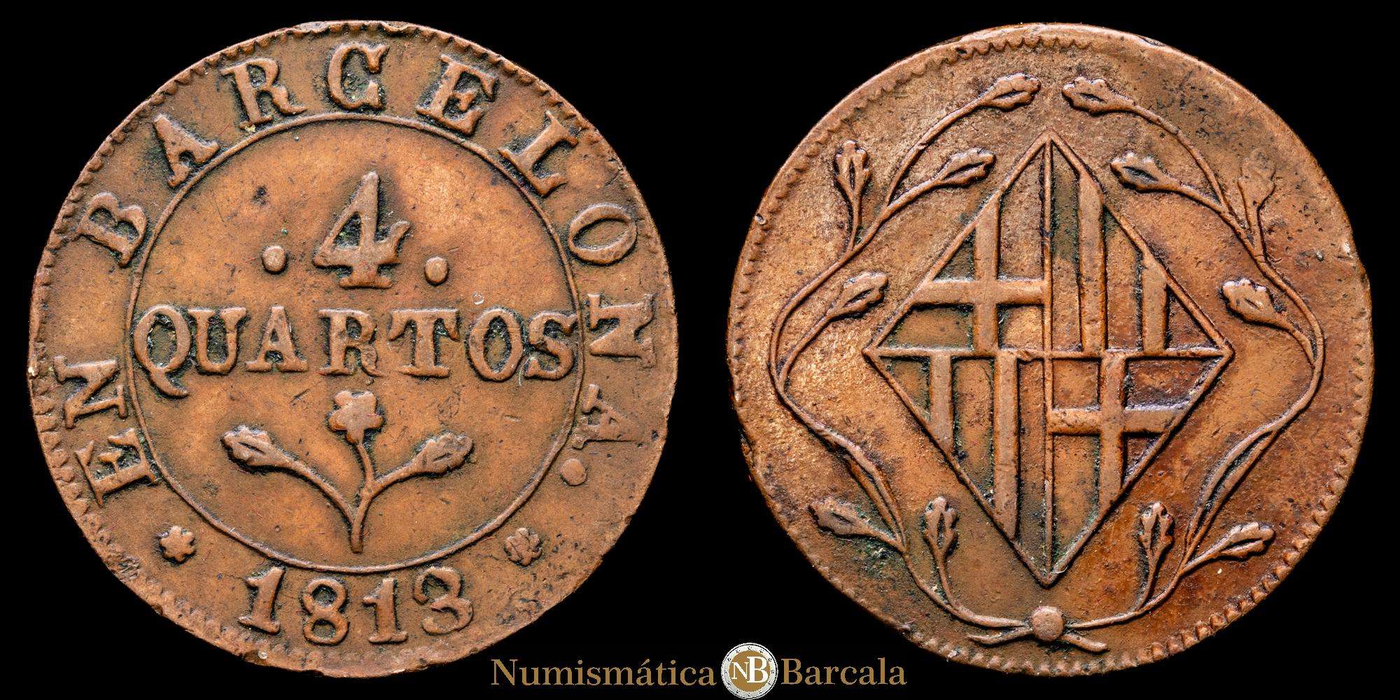 José Napoleón (1808-1814). 4 cuartos. 1813. Barcelona. (Cal-76). Ae. 8,35 gramos. Escasa. MBC+.