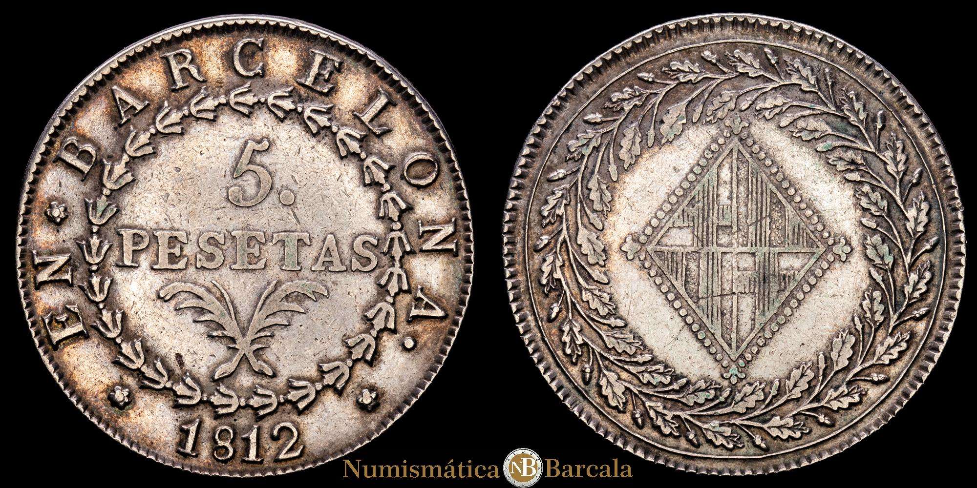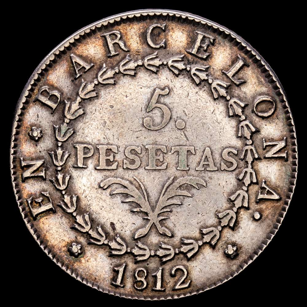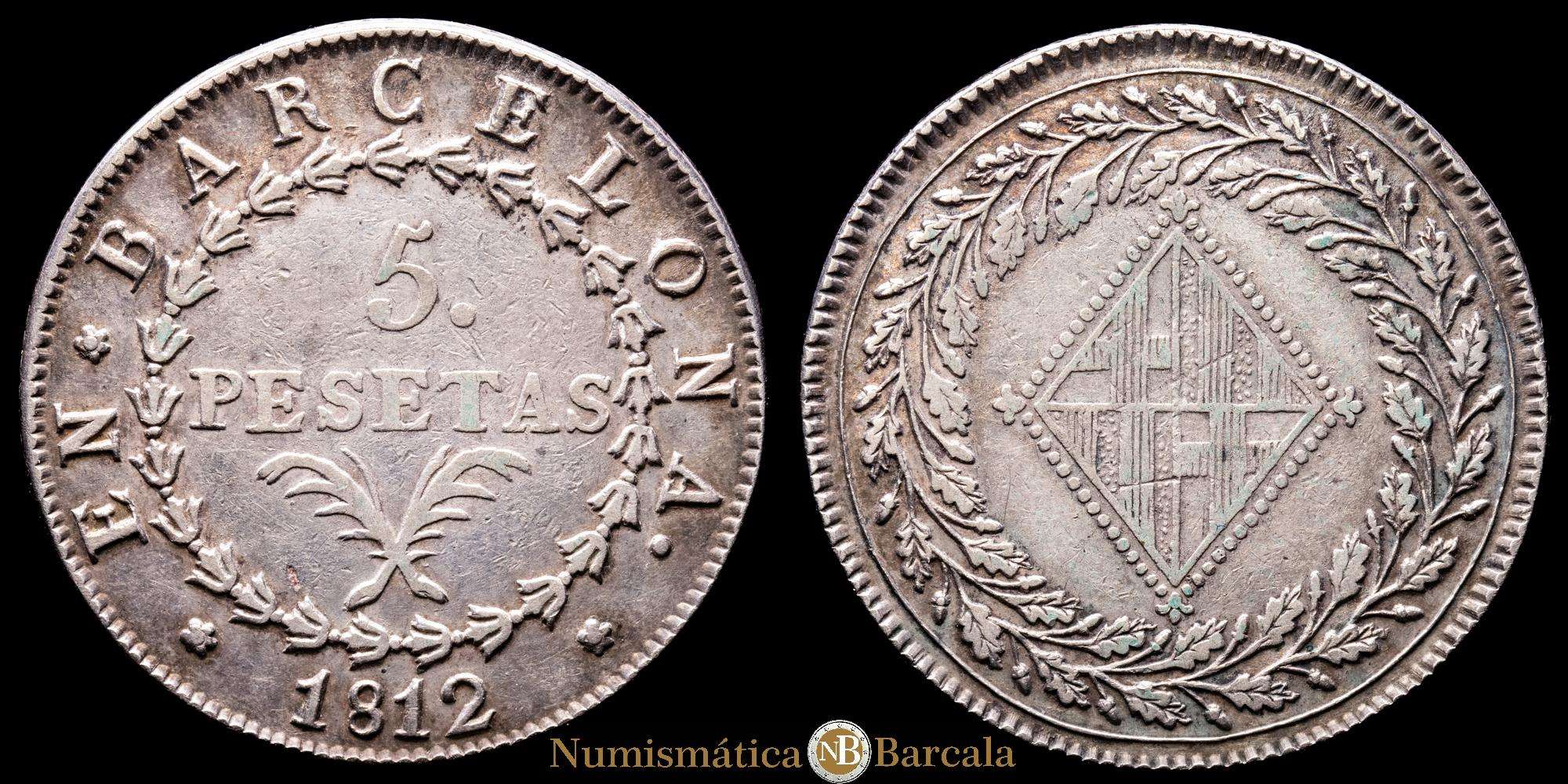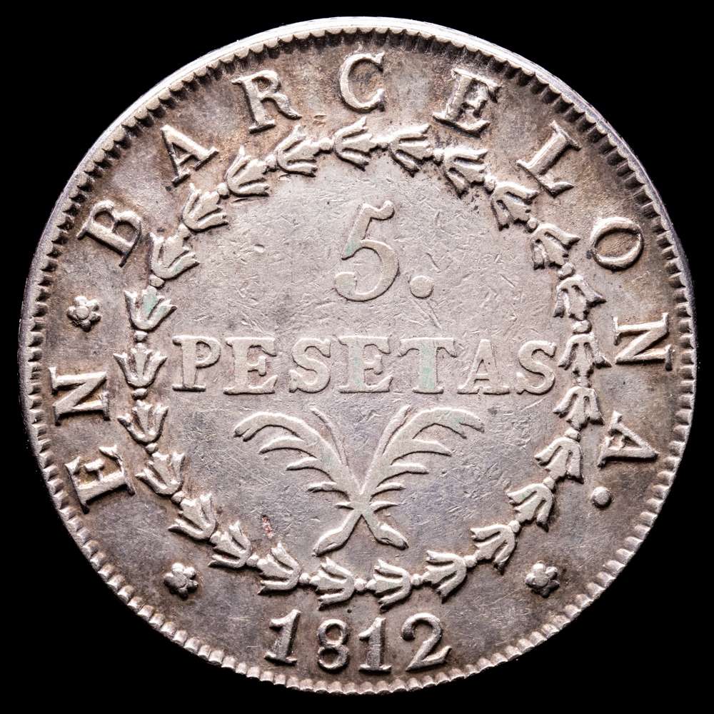 José Napoleón (1808-1814). 5 pesetas. 1812. Barcelona. (Cal-51). Ag. 26,79 g. Escasa. MBC+.