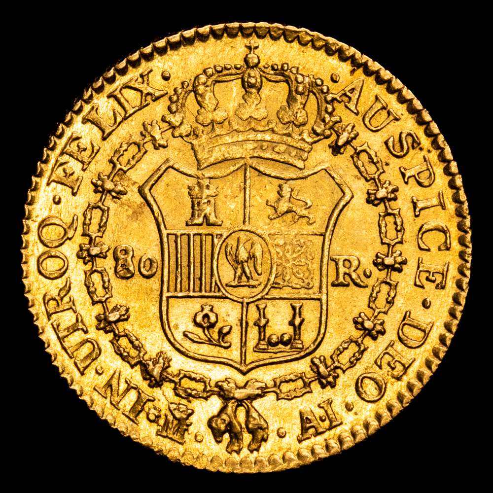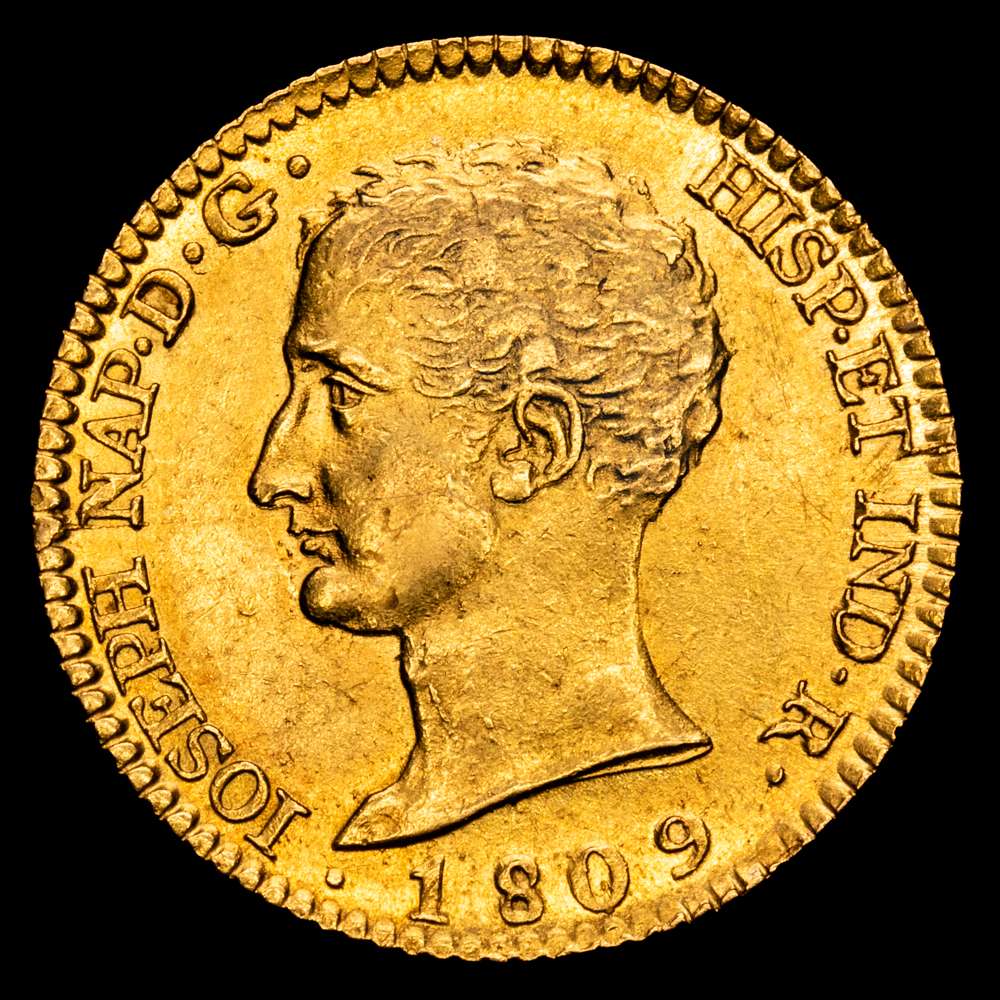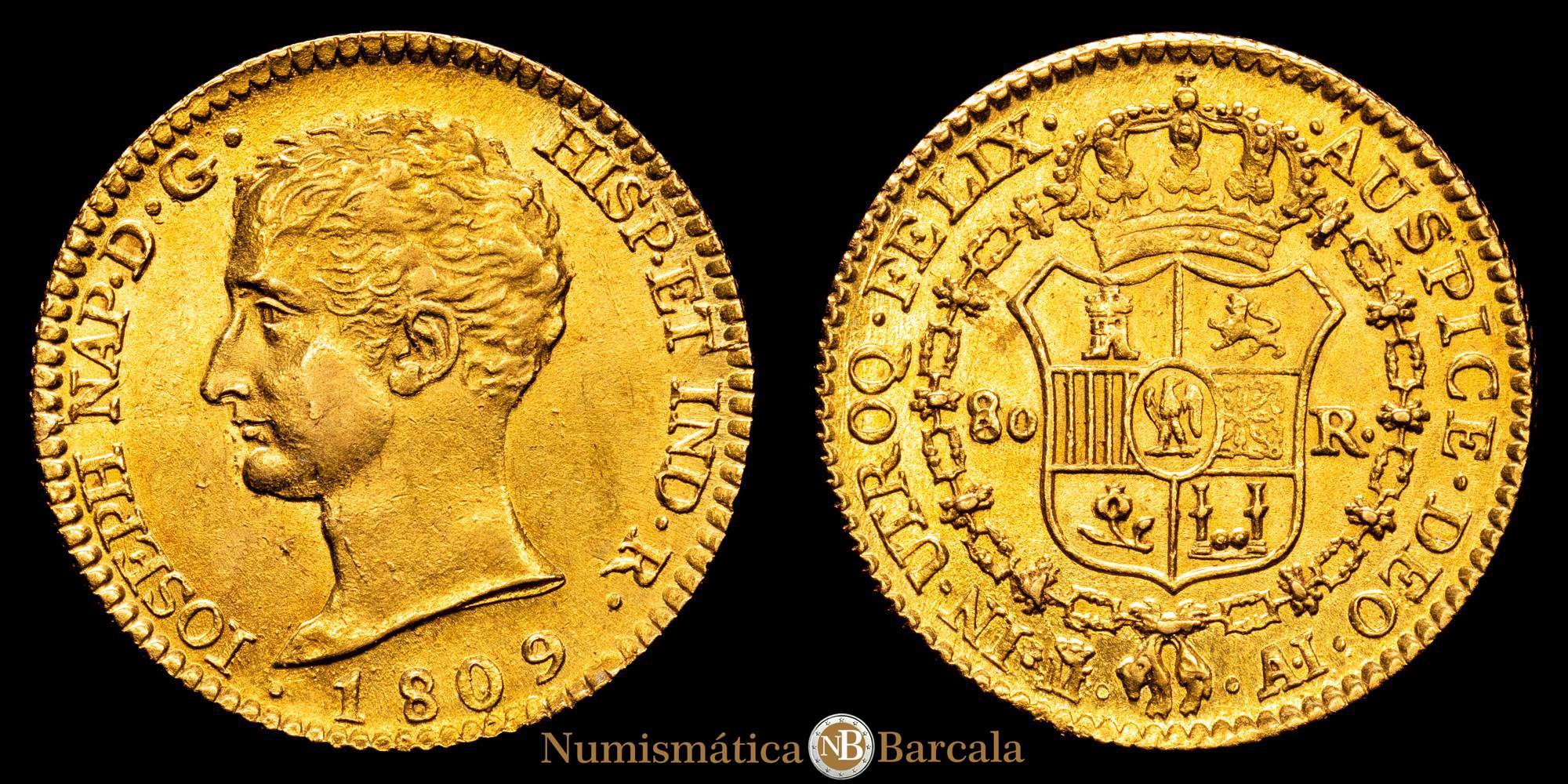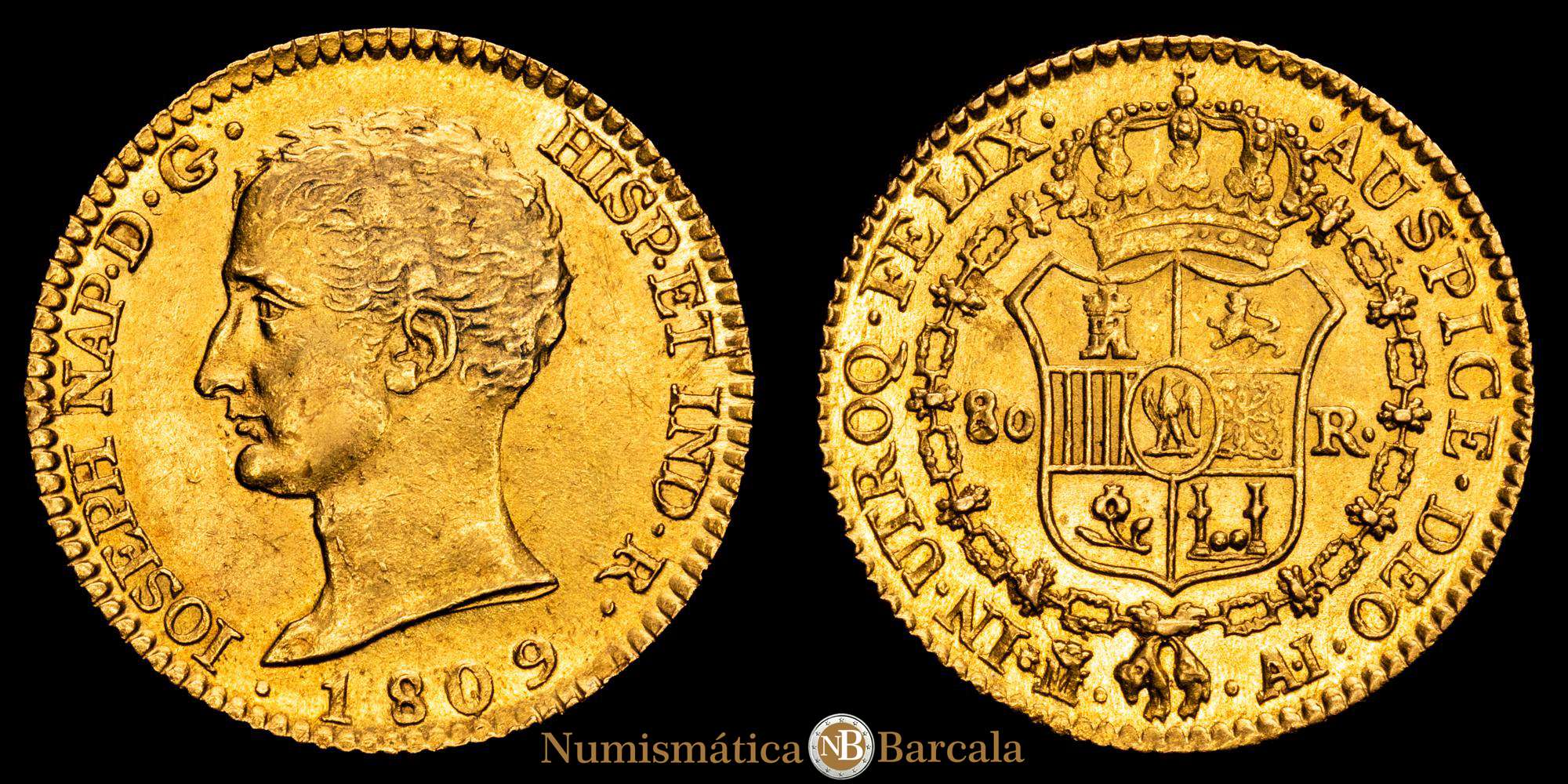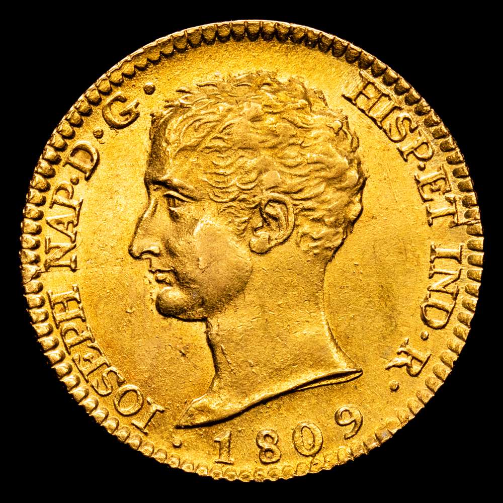 José Napoleón (1808-1814). 80 reales. 1809. Madrid. AI. (Cal-47). Au. 6,71 gramos. Busto desnudo. Primer año del tipo. Parte de brillo original. Rara. EBC+.