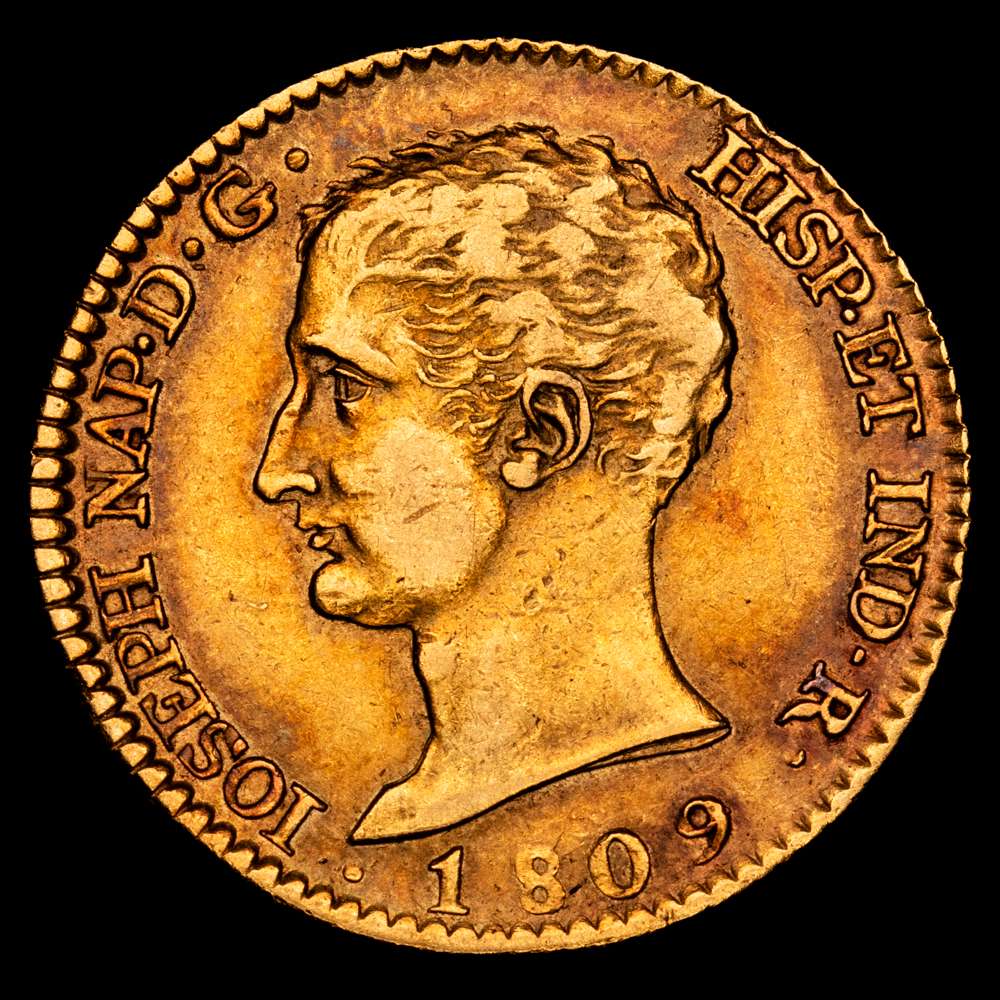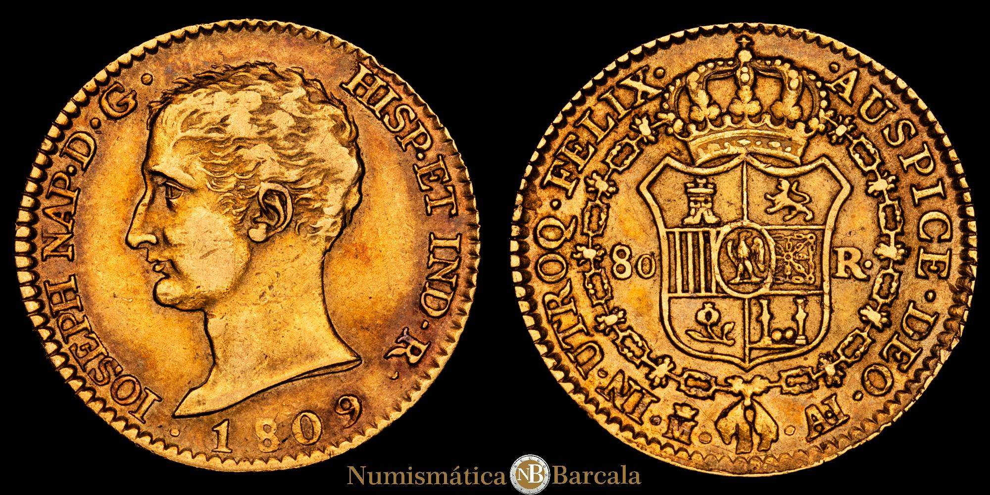 Numismática Barcala > Productos > José Napoleón (1808-1814). 80 reales. 1809. Madrid. AI. (Cal-47). Au. 6,76 gramos. Busto desnudo. Primer año del tipo. Bonita pátina. Rara. MBC+.