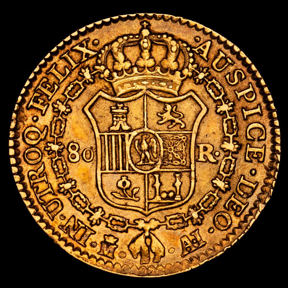 José Napoleón (1808-1814). 80 reales. 1809. Madrid. AI. (Cal-47). Au. 6,71 gramos. Busto desnudo. Primer año del tipo. Parte de brillo original. Rara. EBC+.