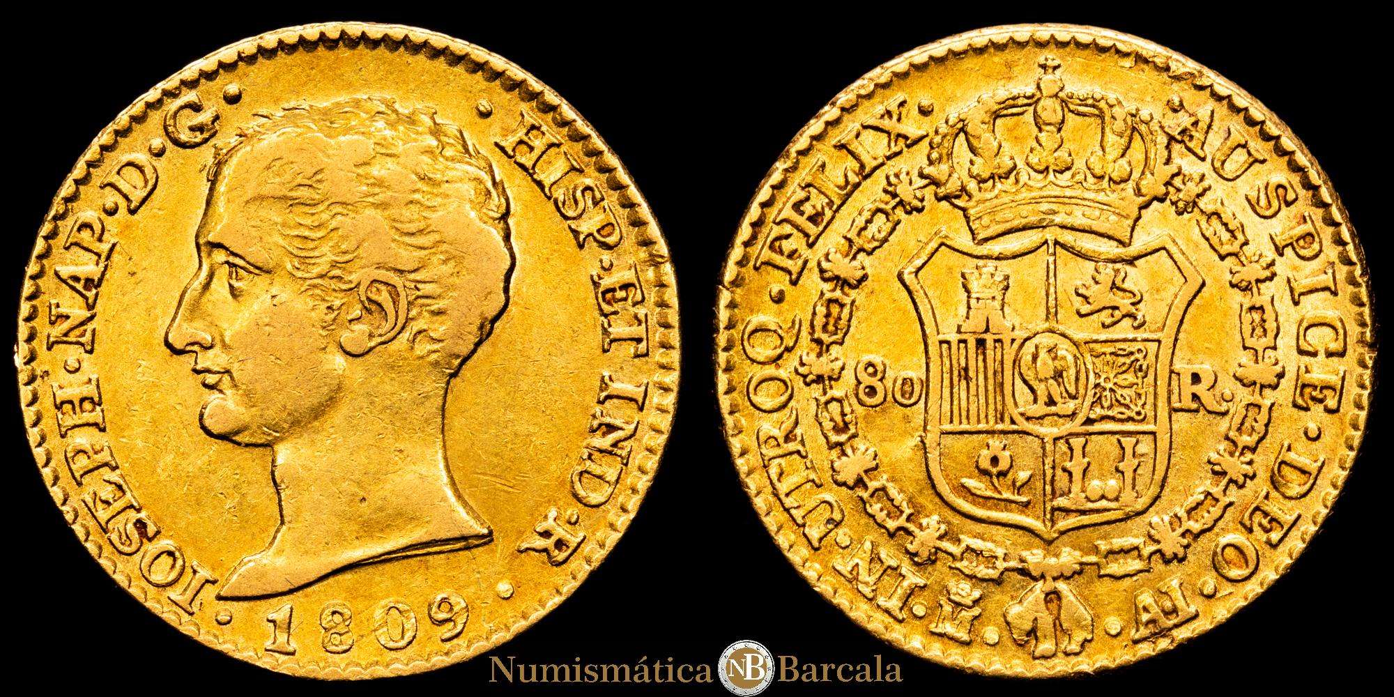 José Napoleón (1808-1814). 80 reales. 1809. Madrid. AI. (Cal-47). Au. 6,77 gramos. Busto con la cabeza descubierta. Primer año del tipo. Rara. MBC+.