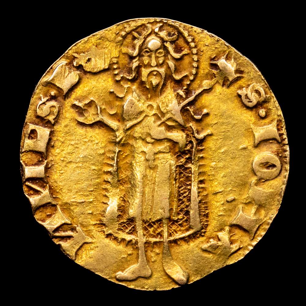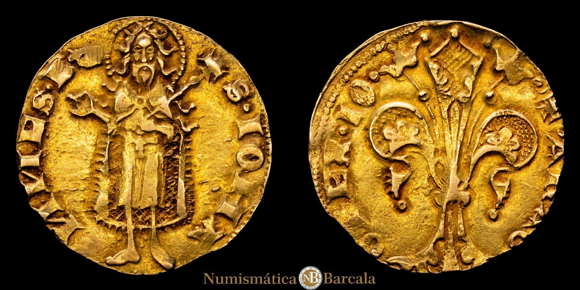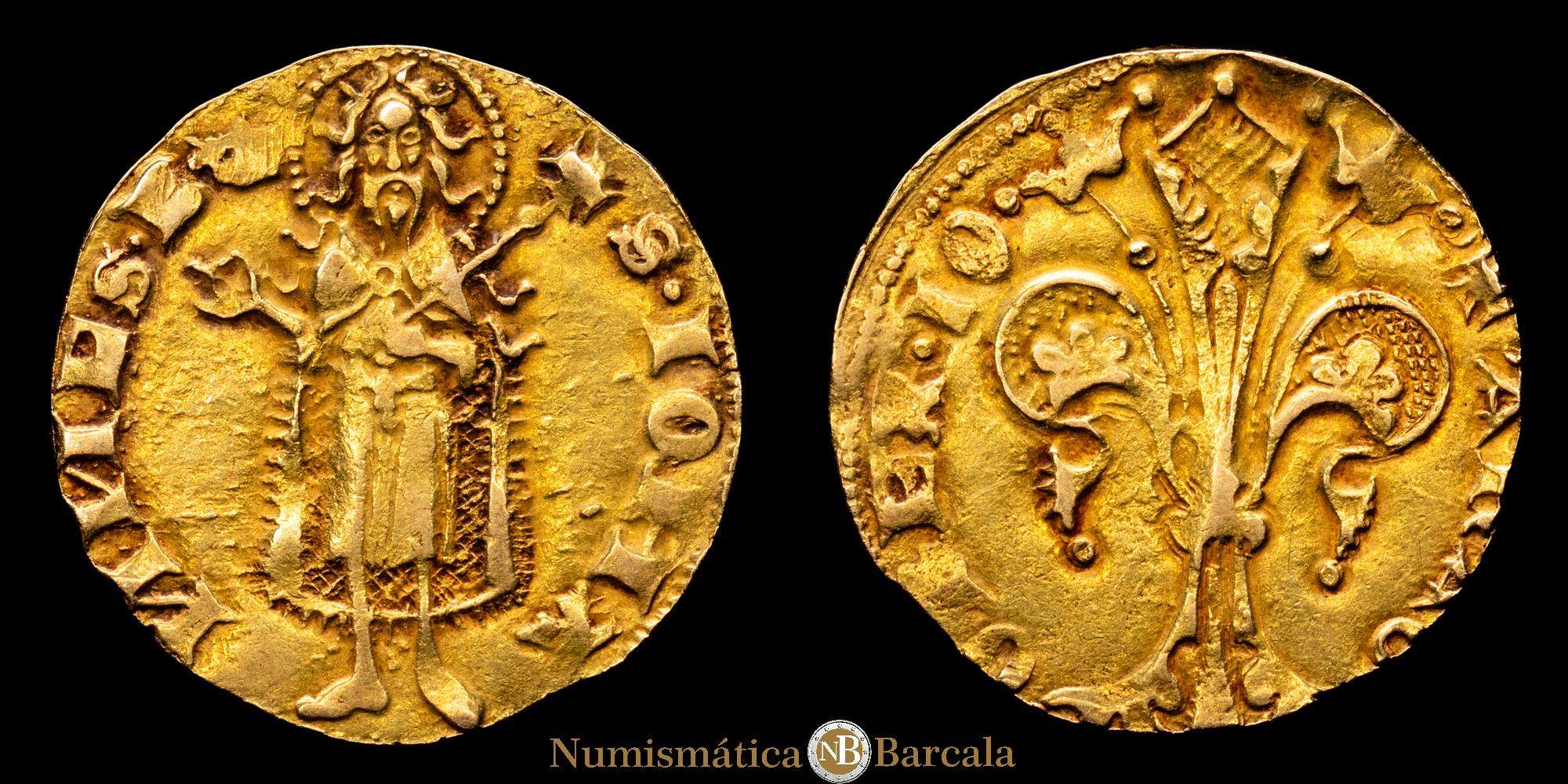 Numismática Barcala > Productos > Juan I (1387-1396). Valencia. Florí. (Cru.VS 471) (Cru.Comas 33) (Cru.CG 2280). Marca: corona. Anverso: SIOHA-NNESB. Rev.: ARAG-O REX IO.Atractiva. Escasa así. 3,45 gramos. MBC+.