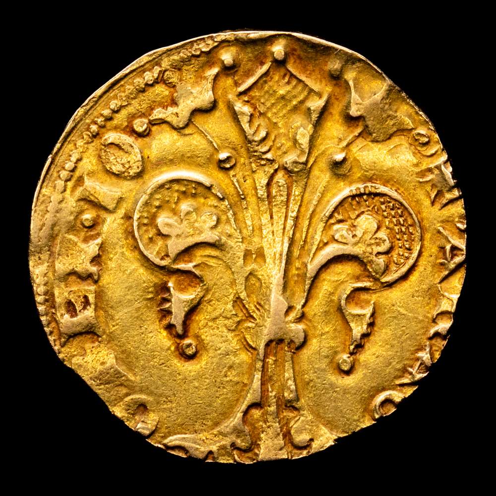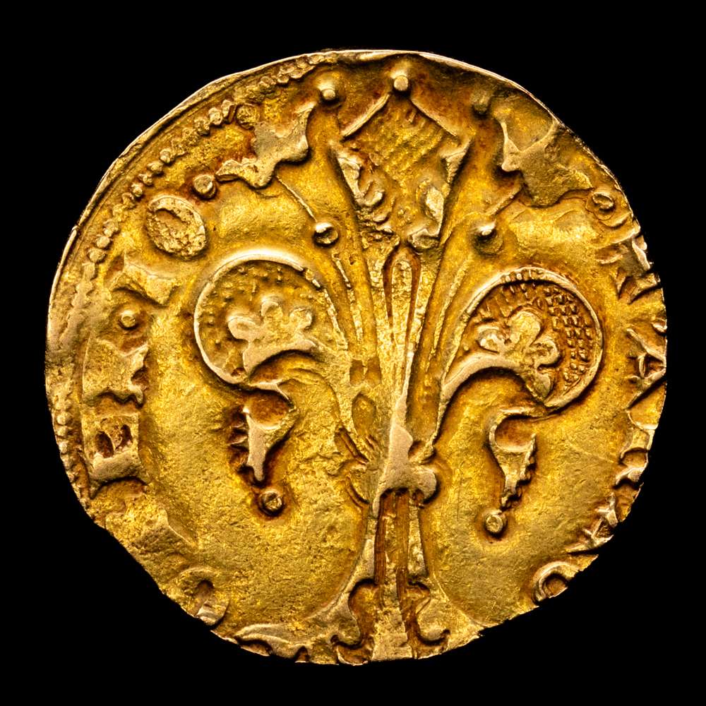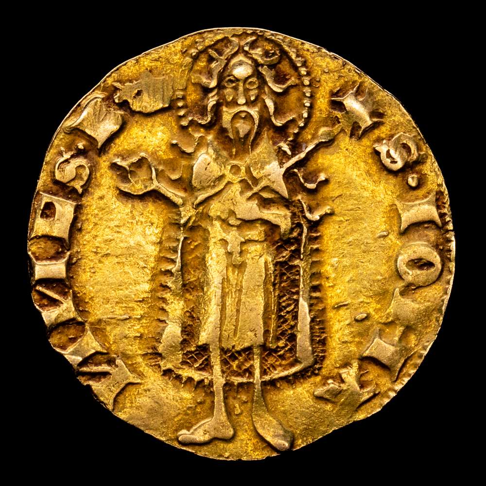 Numismática Barcala > Productos > Juan I (1387-1396). Valencia. Florí. (Cru.VS 471) (Cru.Comas 33) (Cru.CG 2280). Marca: corona. Anverso: SIOHA-NNESB. Rev.: ARAG-O REX IO.Atractiva. Escasa así. 3,45 gramos. MBC+.