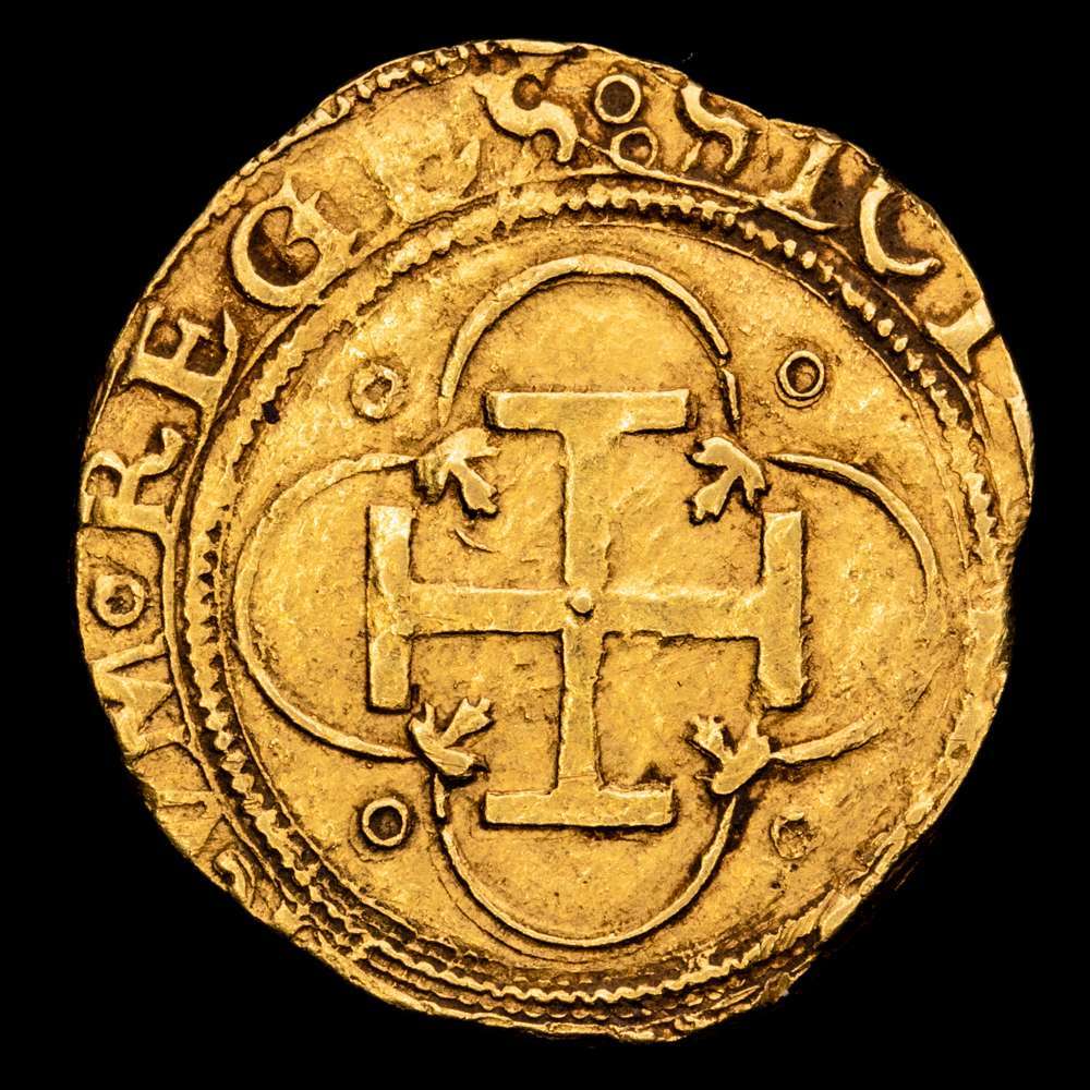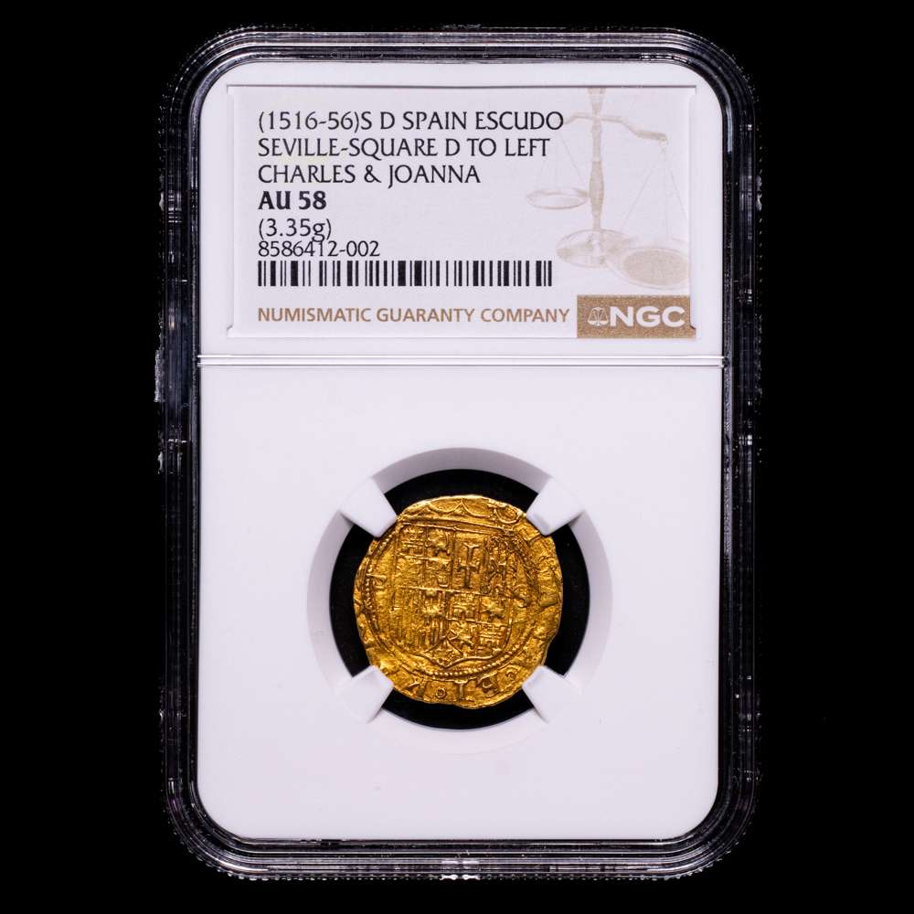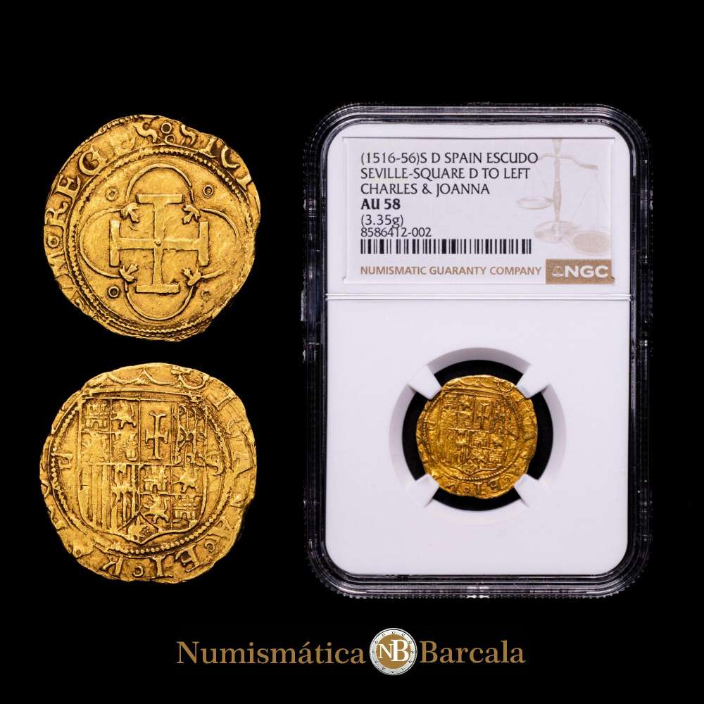 Numismática Barcala > Productos > Juana y Carlos (1504-1555). 1 escudo. ND (1516-56). Sevilla. (Cal-199).(Tauler-22c). Au. 3,35 g. Bonito color. Encapsulada por NGC como AU 58.
