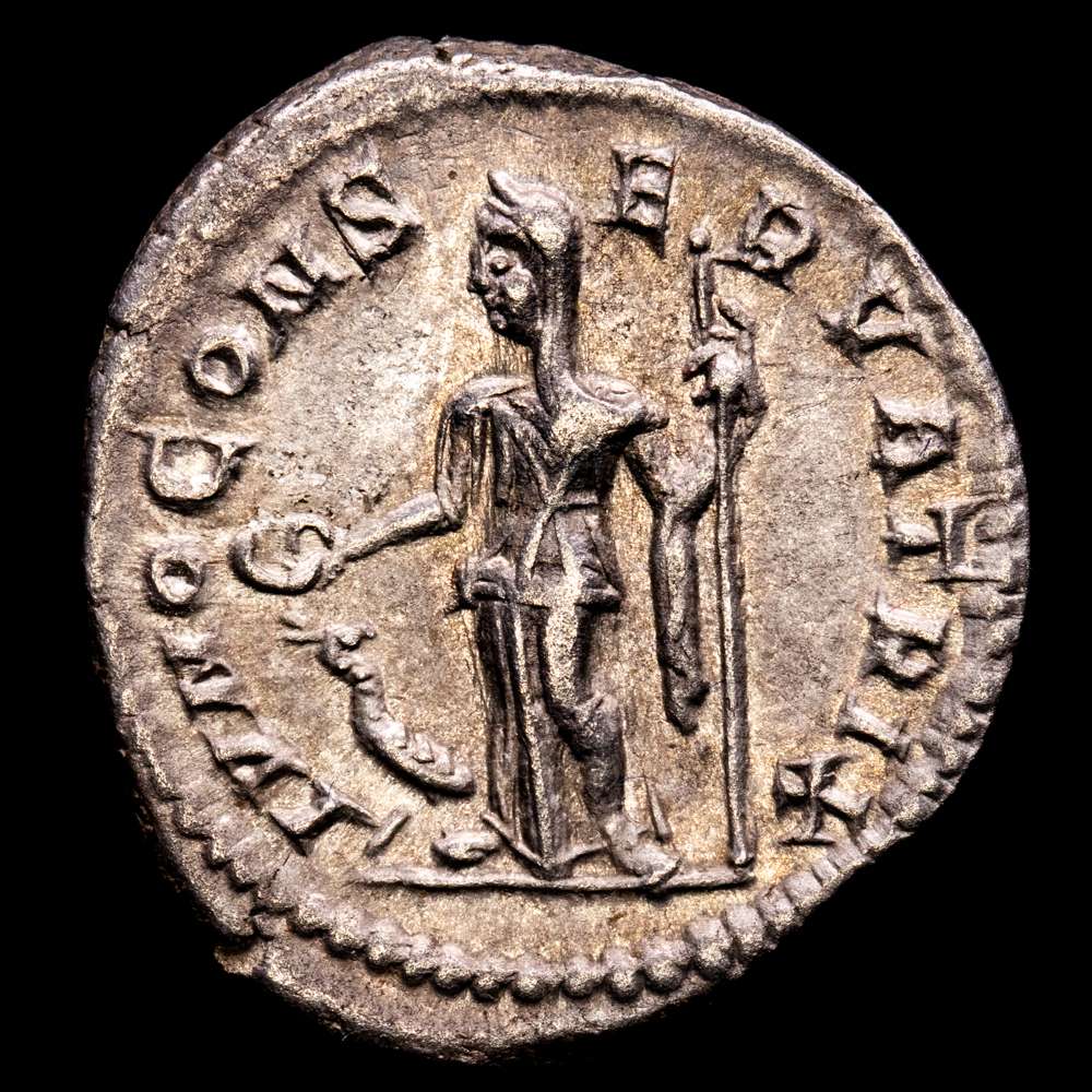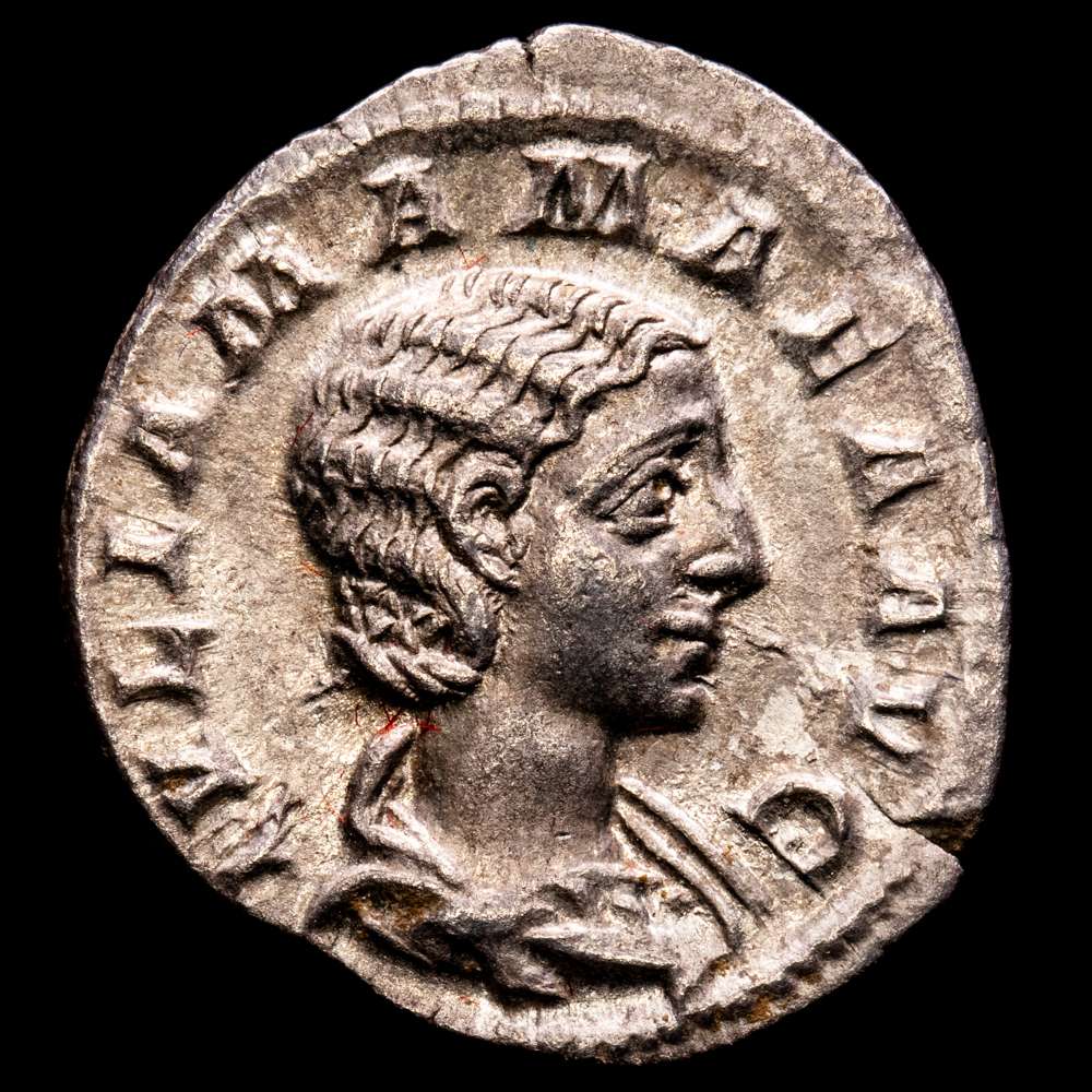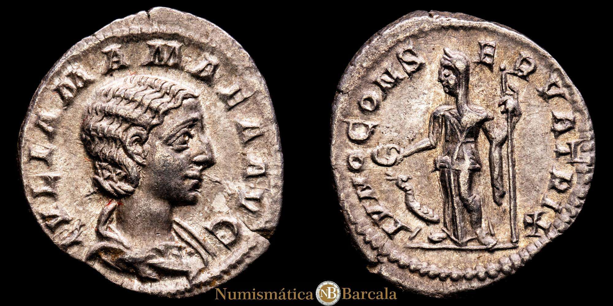 Julia Mamea. Denario. 222-235 d.C. Roma. (Ric-IV 343). (Seaby-35). Anv.: IVLIA MAMAEA AVG. Bustro drapeado a derecha. Rev.: IVNO CONSERVATRIX. Juno en pie a izquierda, portando patera y cetro, pavo real a sus pies a la izquierda. Ag. 2,42 g. Bello ejemplar. Parte del brillo original. Escasa así. EBC+.