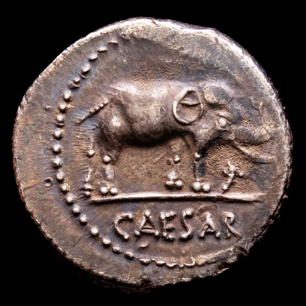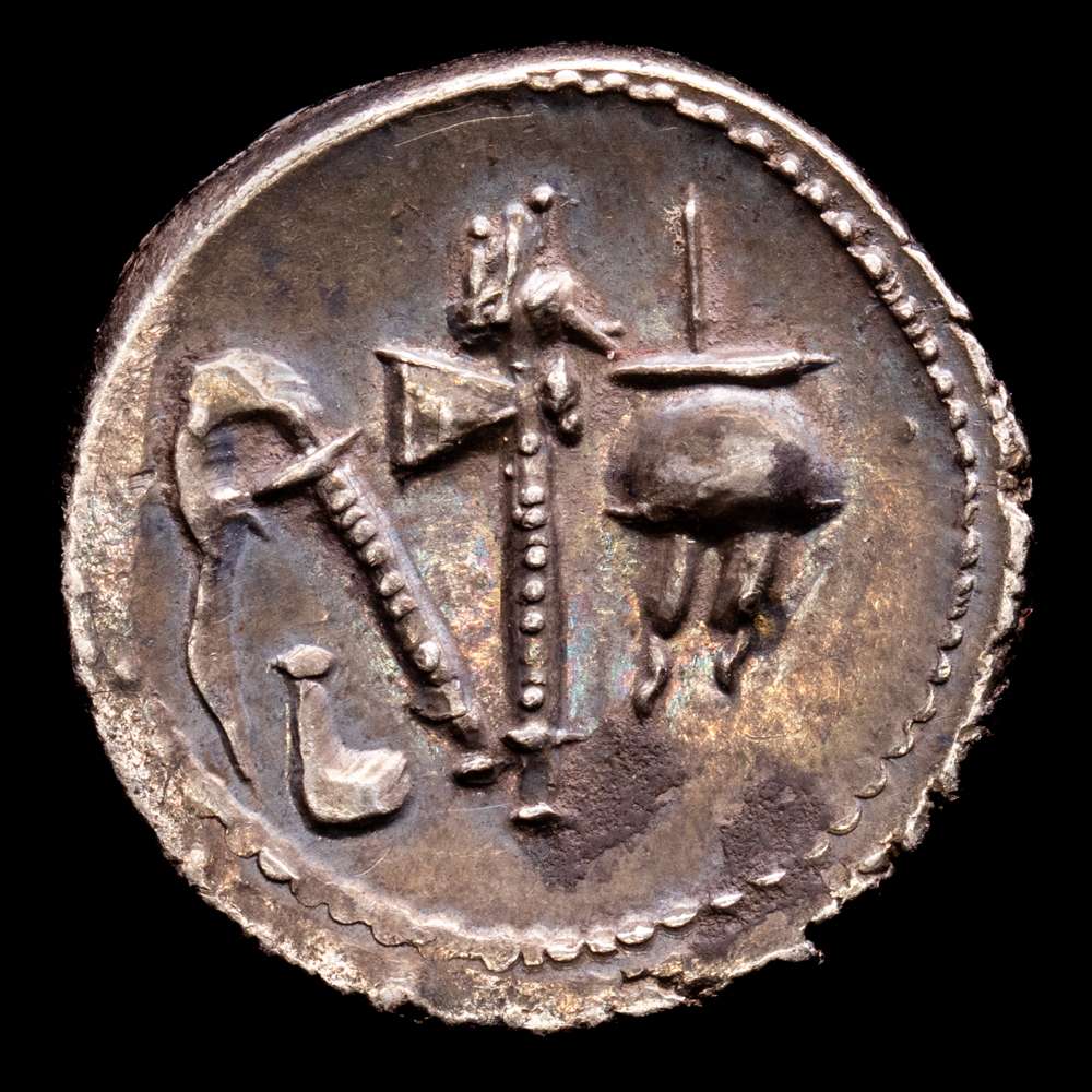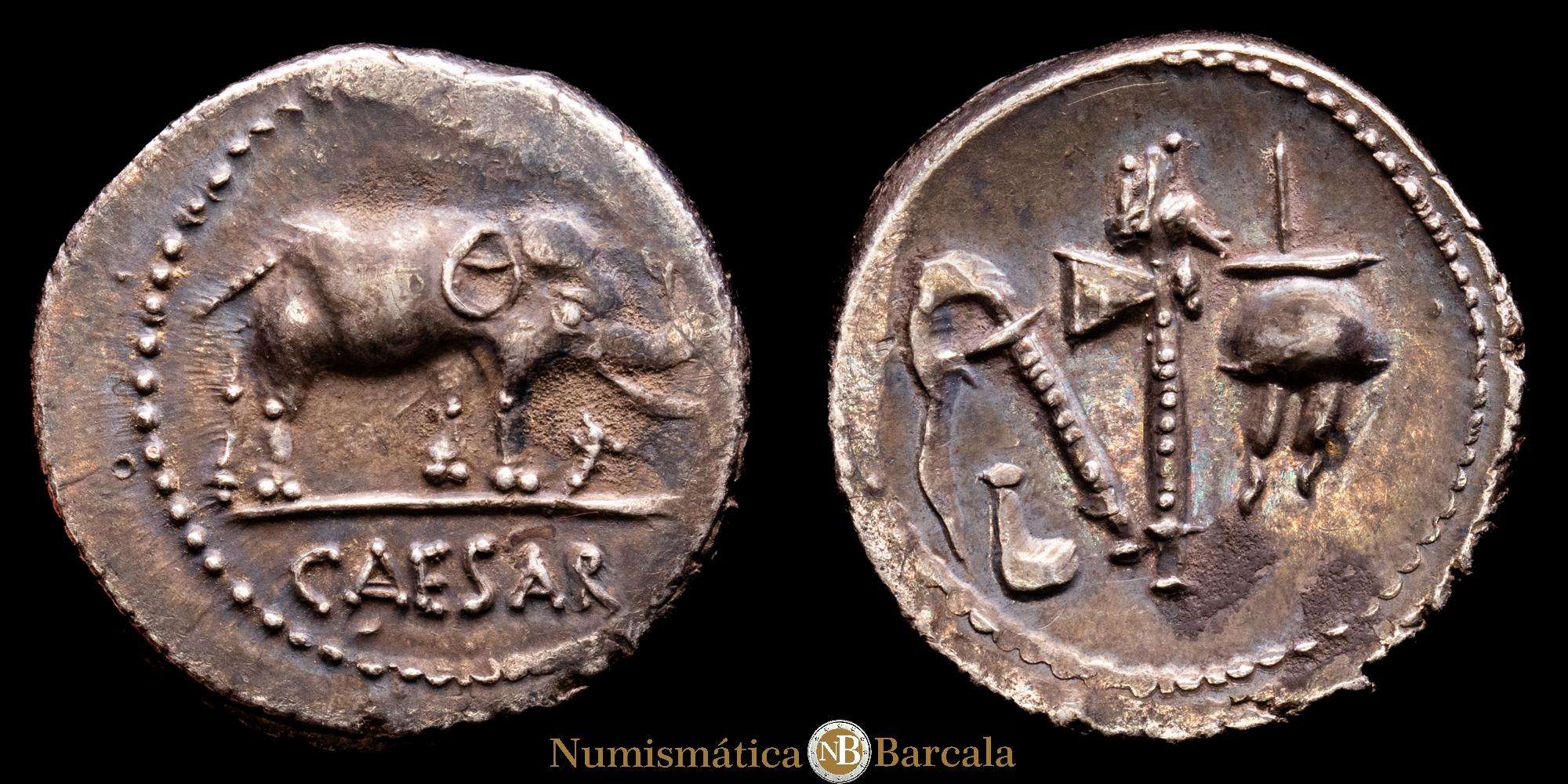 Julio César. Denario (49 a. C.). Ceca militar viajando con César. Anv.: César. Elefante avanzando a la derecha, pisoteando una serpiente cornuda. Rev.: Emblemas del pontificado: simpulum, aspergillum, securis y apex. Crawford 443/1; CRI 9. Una moneda importante, emitida durante uno de los períodos más intrigantes de la historia romana. Con el inicio de las Guerras Civiles, esta es la primera moneda emitida en abierto desafío al Senado, que lleva el nombre de un particular. No hay acuerdo sobre el lugar de emisión; Crawford la atribuye a una ceca itinerante. Según D. Van Meter (The Hanbook of Roman Imperial Coins), la moneda, acuñada entre los años 49 y 48 para financiar la invasión de Italia, se referiría a la salvación de la República (la serpiente/dragón), derrotada por Metelo Escipión (cuya gens tenía un elefante representado en sus monedas). Generalmente se cree que se trata de un dragón pisoteado; el elefante africano no solo aludiría a la victoria contra Ariovisto en el 58 a. C. (el dragón figuraba en el estandarte de los germanos), sino también al nombre de César, quien descubrió la existencia de una palabra homógrafa para elefante en la lengua mauri de Mauritania. Los emblemas religiosos aquí representados son símbolos de oficios sacerdotales: la jarra y el lituus representan las funciones asociadas con los pontífices y los augures. Ambos garantizan la legitimidad de toda acción política, asegurando la salvación del estado romano mediante el respeto a la voluntad divina. El propio César ostenta la mayoría de los cargos religiosos y los utiliza con fines propagandísticos en un nuevo tipo de moneda que enfatiza su suprema autoridad. Estado: Casi en perfecto estado; tonalidad de colección antigua. Peso: 4,00 g. Diámetro: 19 mm. Magnífico ejemplar. Muy rara.