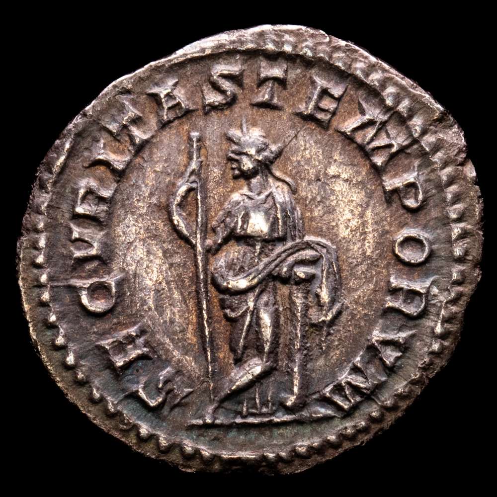 Macrino. Denario. 217 d.C. Roma. (Spink-7365). (Ric-91). Anv.: IMP C M OPEL SEV MACRINVS AVG. Busto laureado y acorazado de Macrino a derecha. Rev.: SECVRITAS TEMPORVM. Securitas en pie a izquierda con cetro y apoyada en columna. Ag. 3,00 g. Escasa. XF.