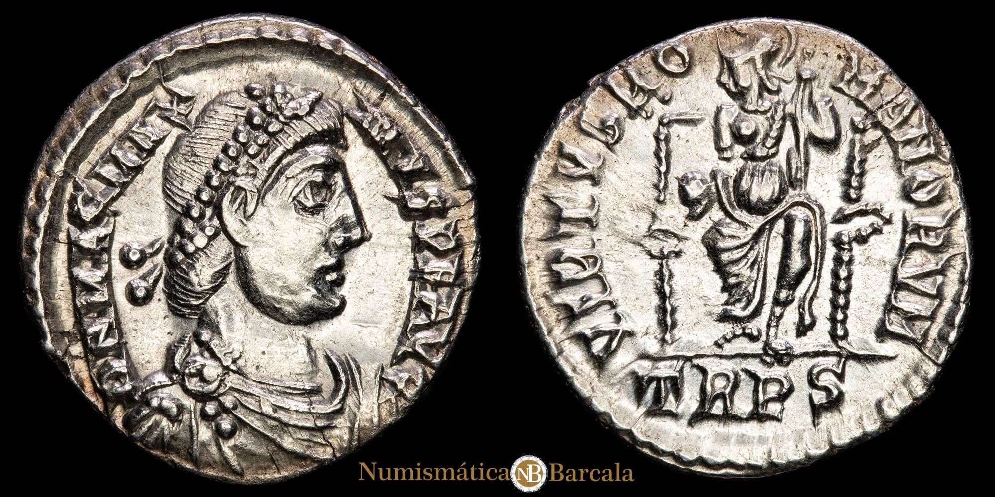 Magno Máximo. Silicua (1,81 g.). Treveri, 383-388 d.C. Busto alargado y de mayor tamaño diademado revestido a derecha. Roma -de menor tamaño- entronizada -brazos decorados- en majestad con cetro y globo -de menor tamaño-. VIRTVS ROMANORVM. TRPS (Treveri Pusulatum) en exergo. Giro moneda. Cy14. Ch20. RICTre84b. SC-. Brillo original.