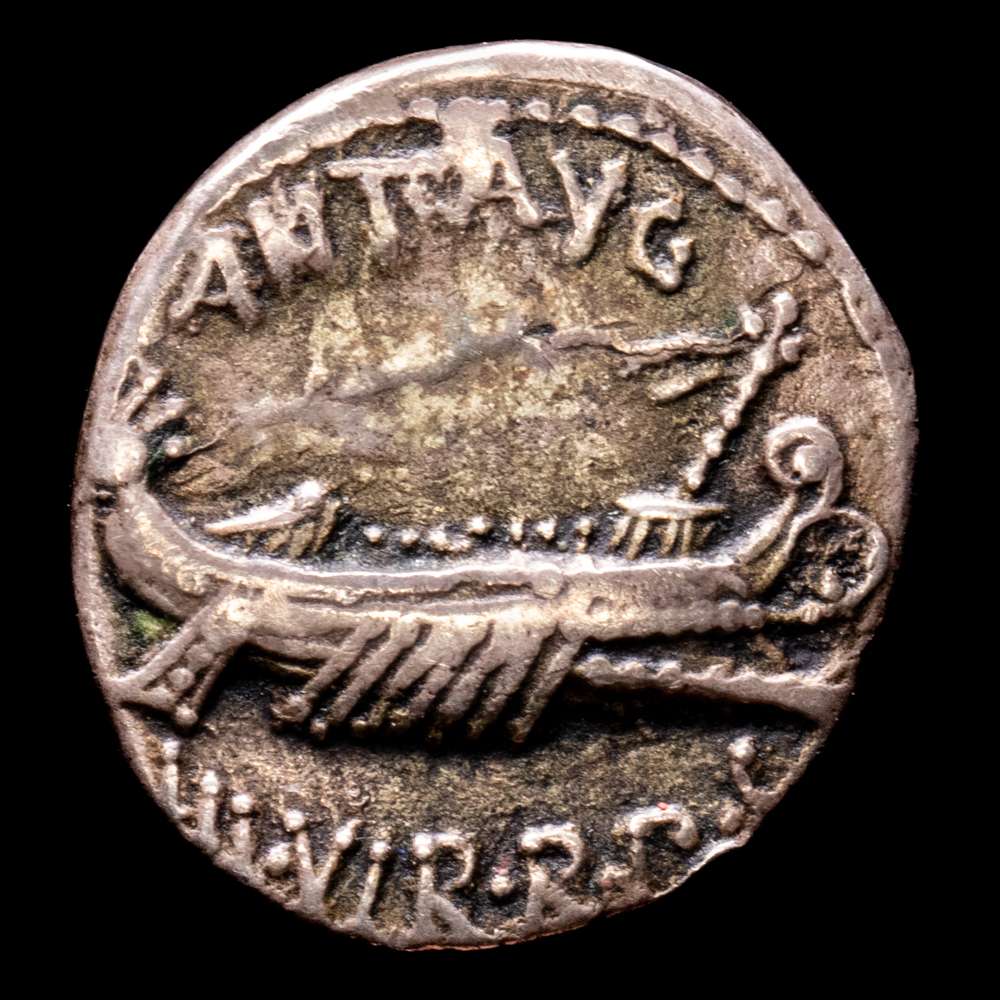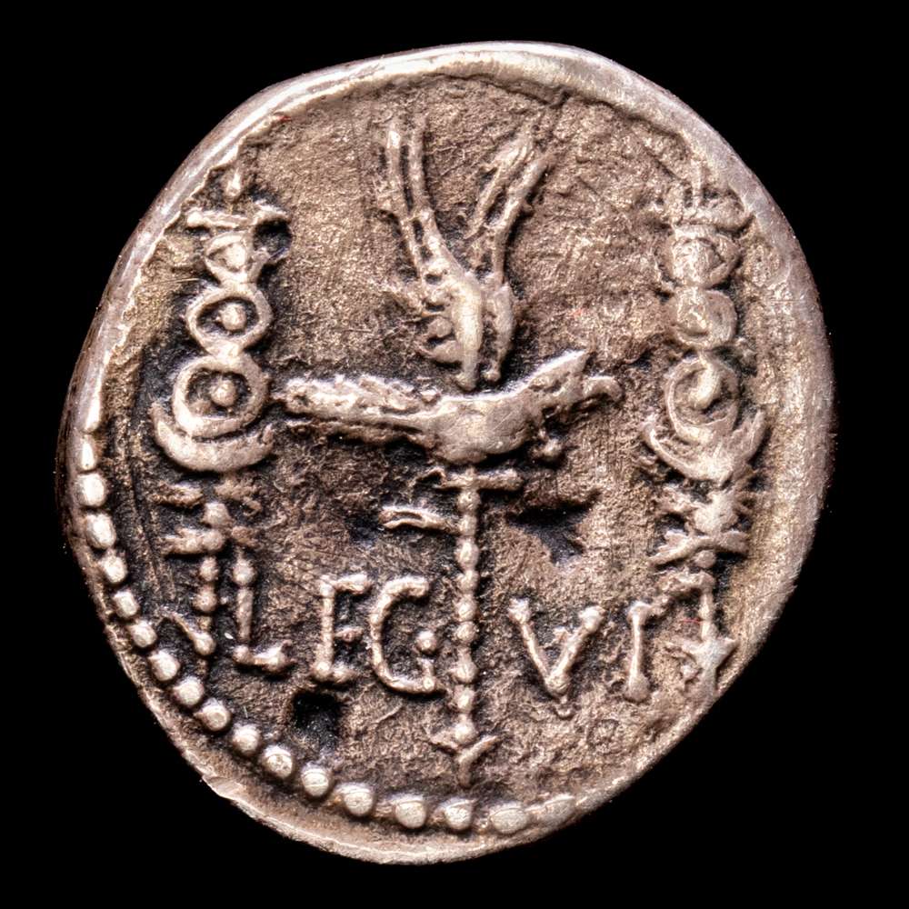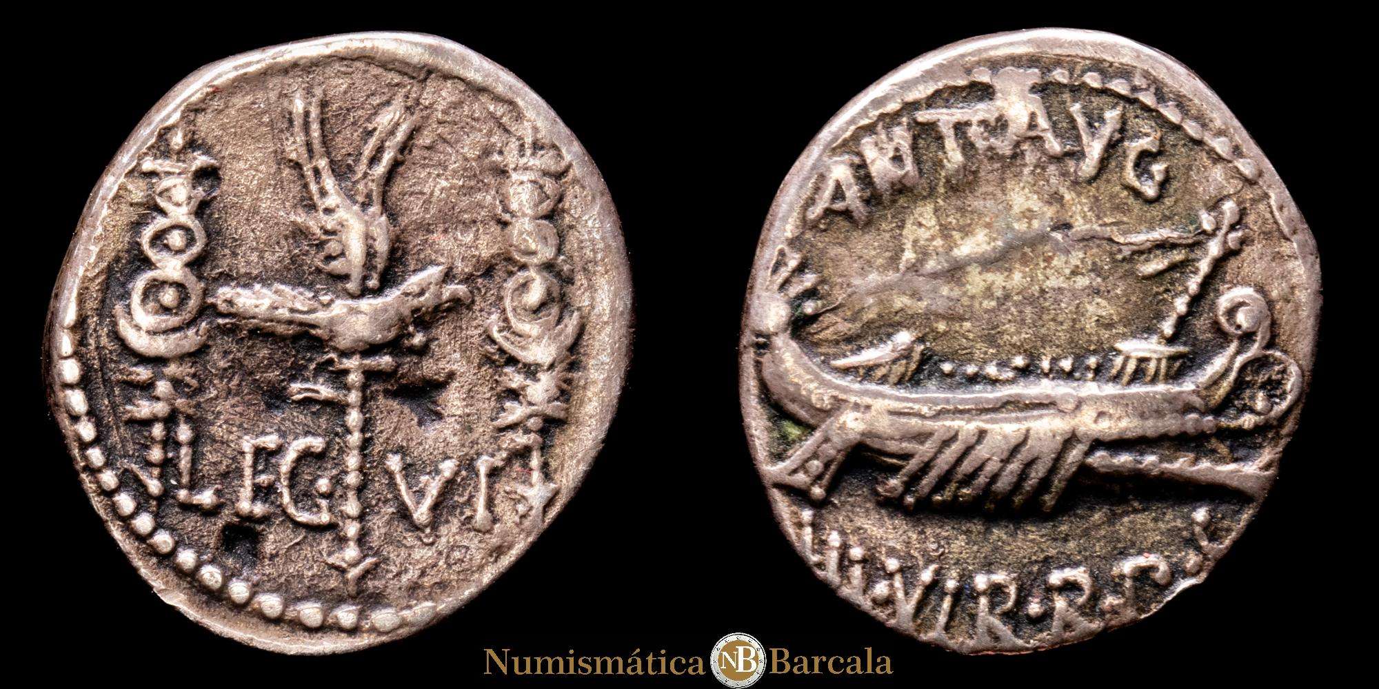 Marco Antonio. Denario. 32-31 aC Ceca volante. (Ffc-37). (Craw-544/19). (Cal-184). Anv.: Galera pretoriana a derecha, ANT. AVG. III. VIR. RPC Rev.: Águila legionaria entre dos insignias militares, LEG. VI. Ag. 3,34 gramos. VF+.