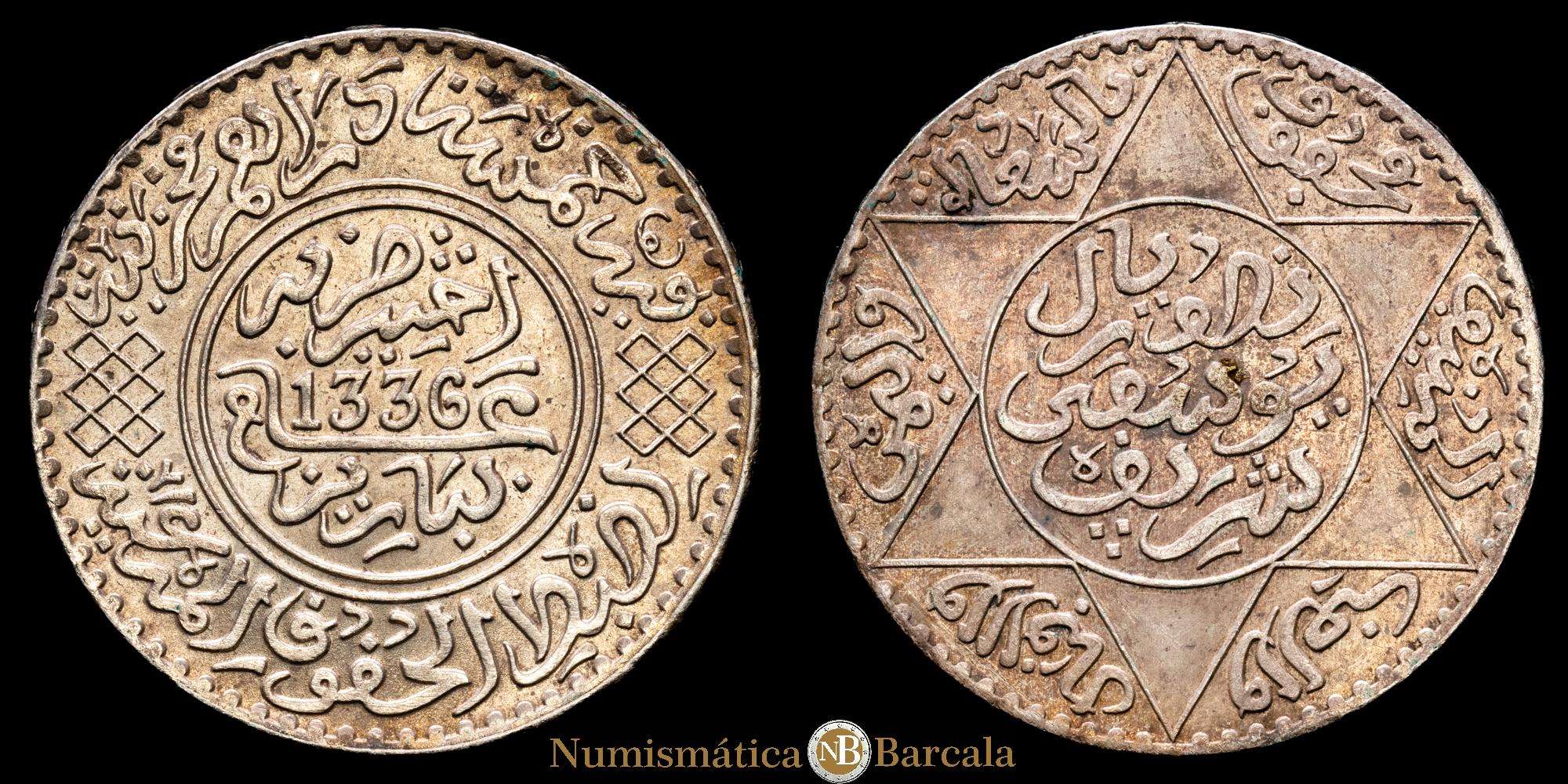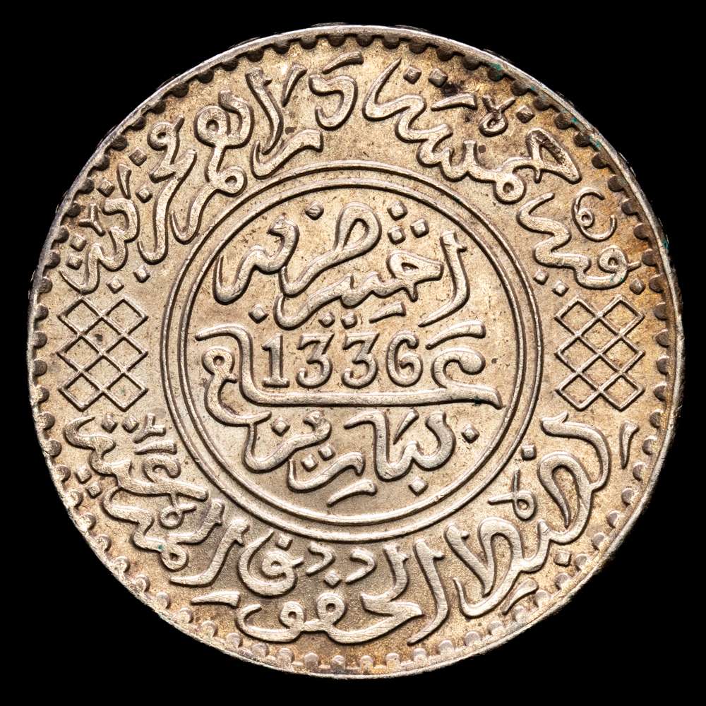 Numismática Barcala > Productos > Marruecos 1/2 Rial / 5 Dirhams 1918 AH 1336 Y32, N14242; Plata 12,5 g.; Yusuf; Casa de la Moneda de París; AU con brillo original.