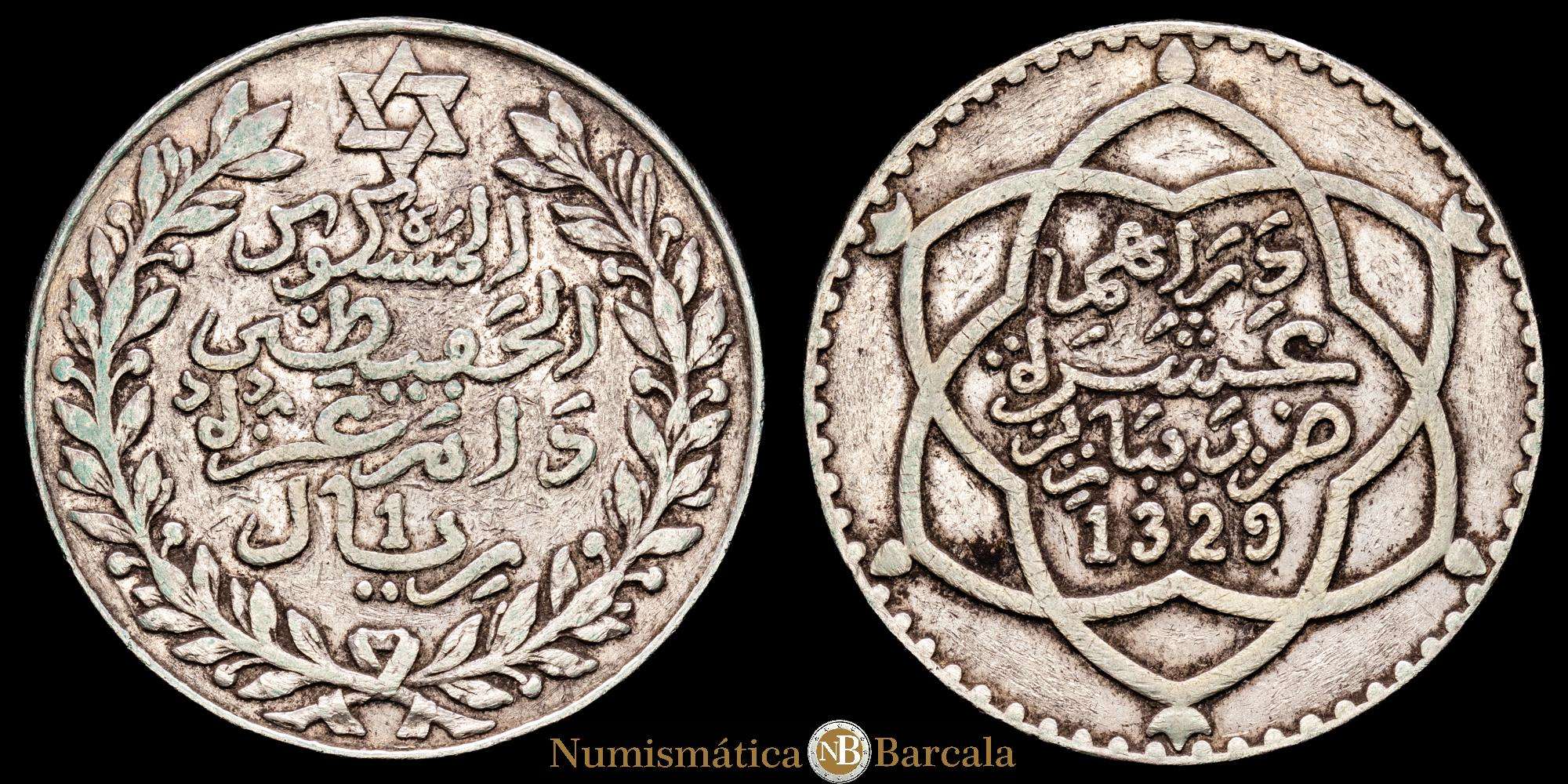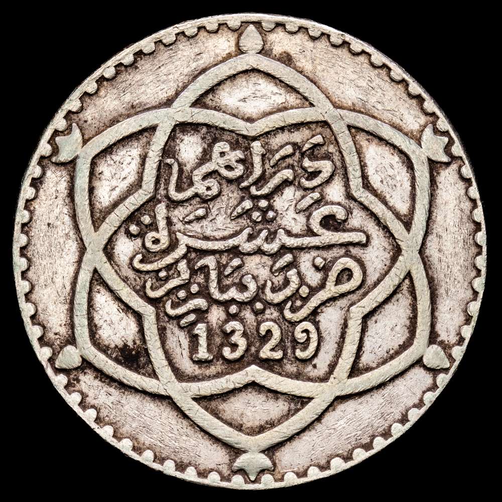 Marruecos. 1911, Hegira 1329. Abd Al-Aziz. 1 rial (10 dirhams). KM. 25. VF limpiada.