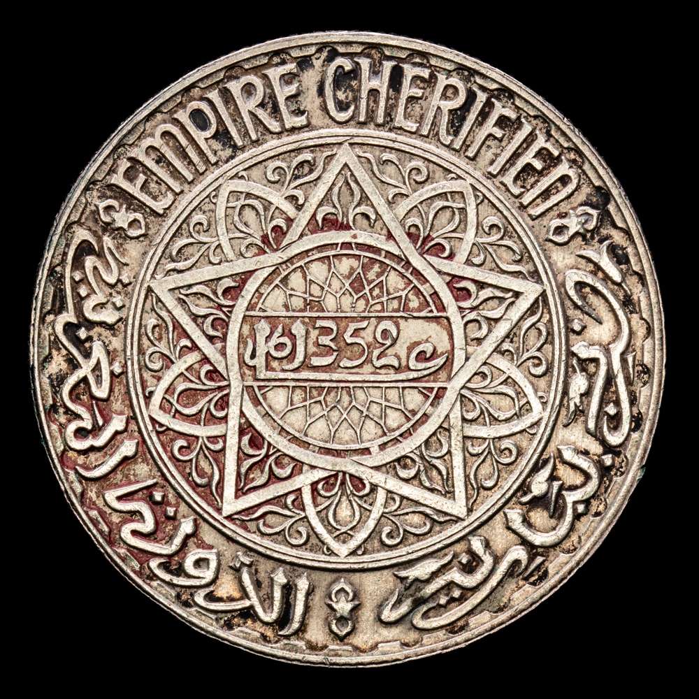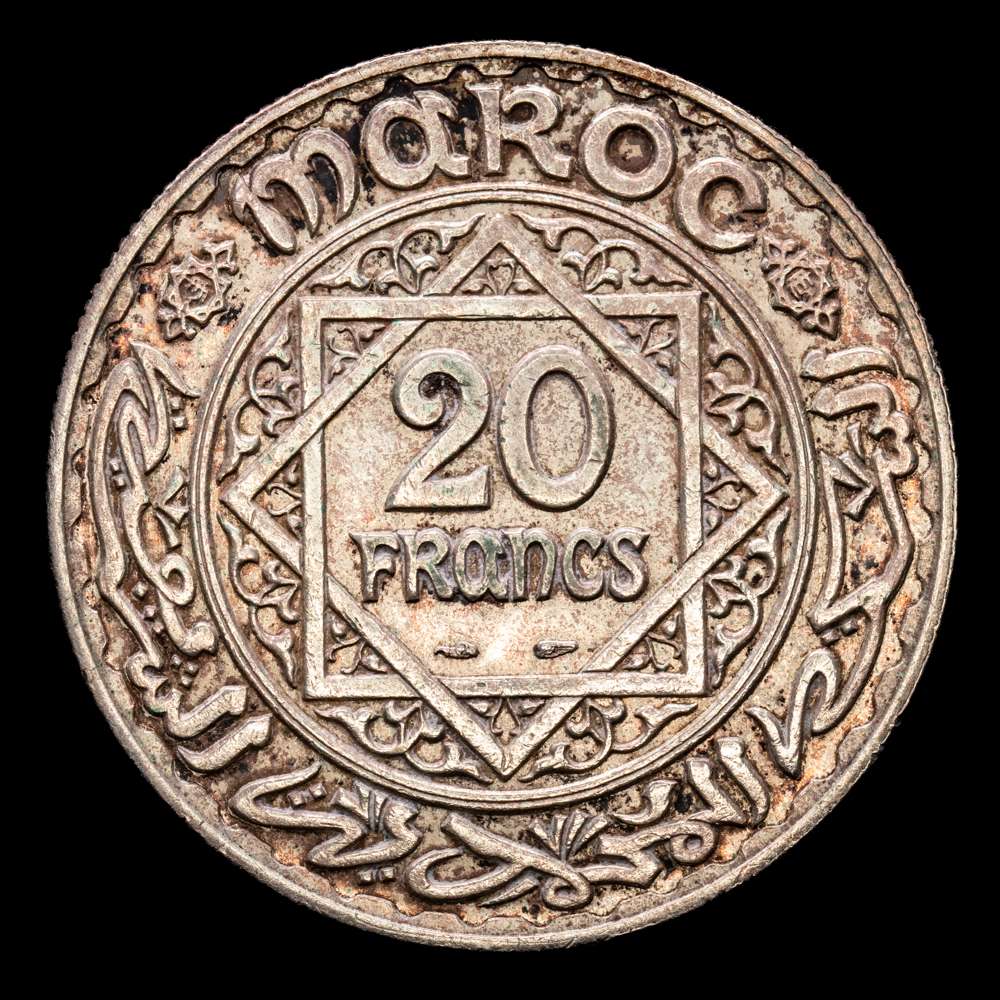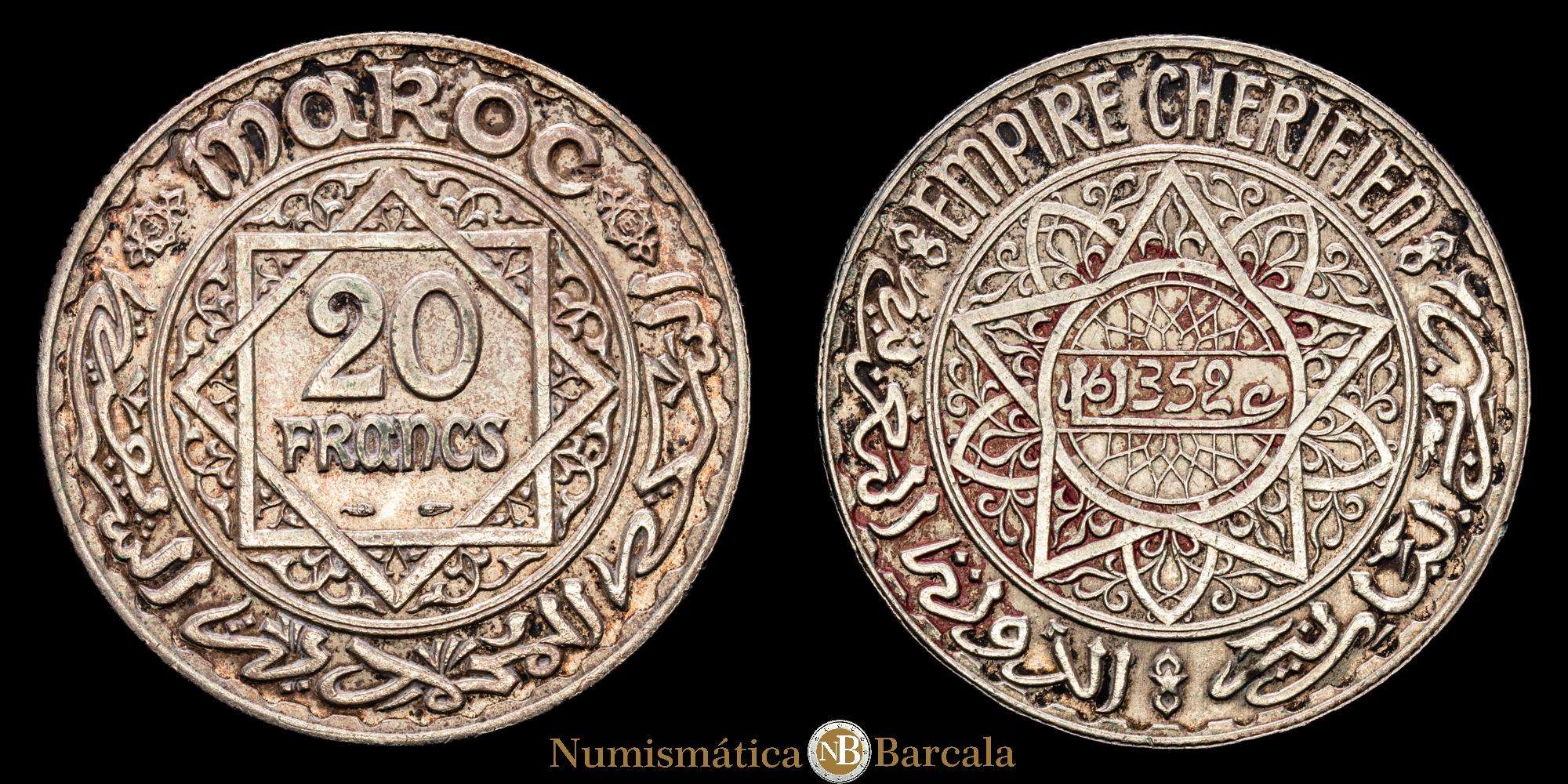 MARRUECOS. 20 francos. 1933, hegira 1352. París. Mohamed V. Km39. Plata 680, 20,03 g. VF/XF+.