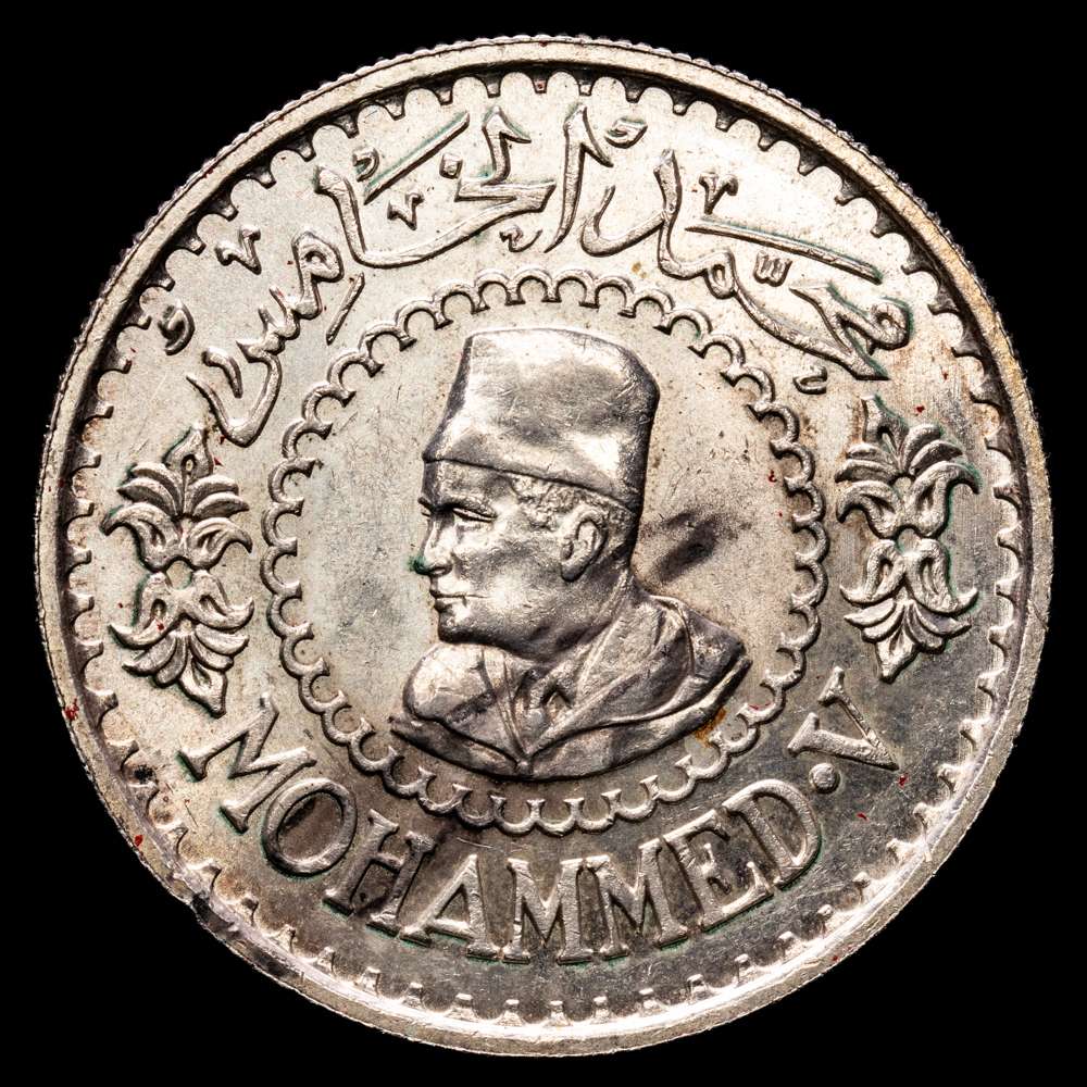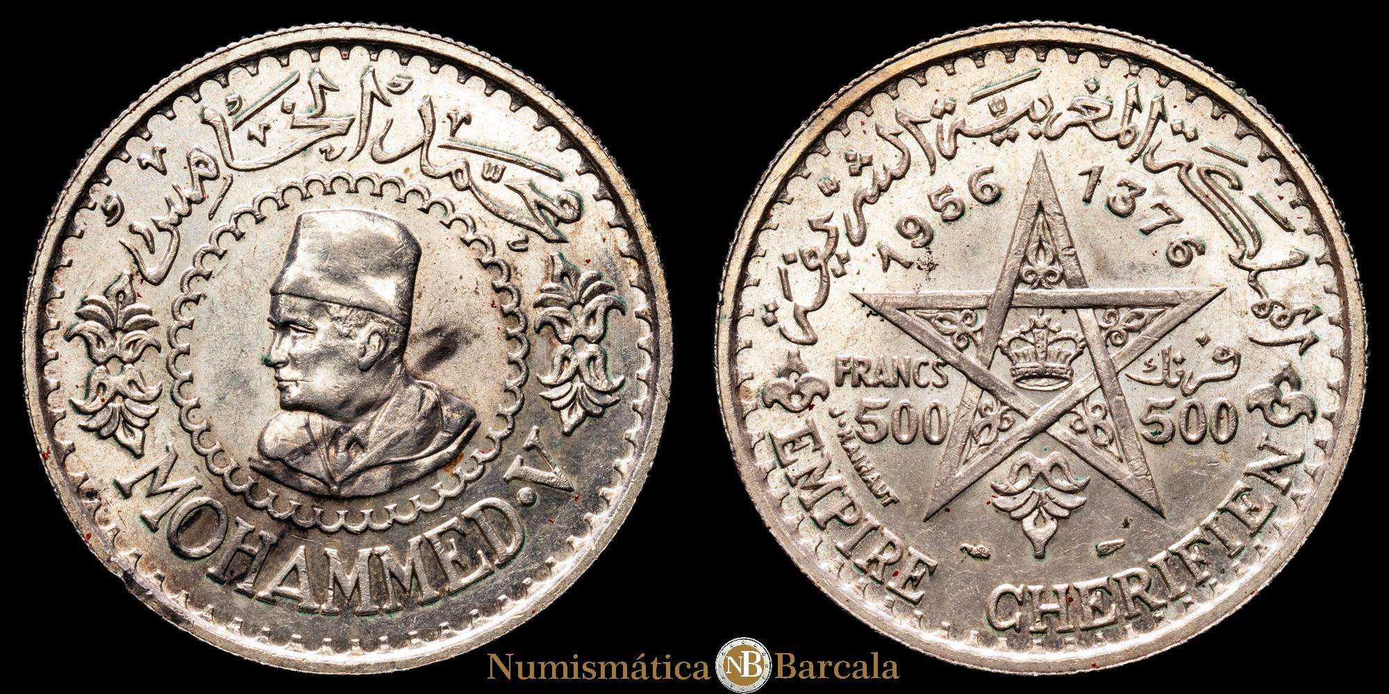 Numismática Barcala > Productos > Marruecos, 500 francos, 1956, Hegira 1376, Mohammed V, Paris, Plata 900, 22,57 g. Y54. XF.