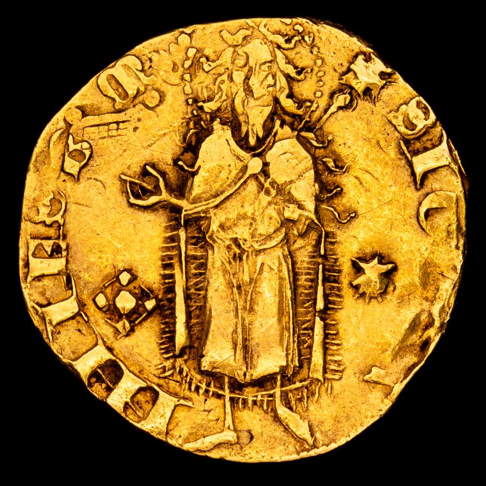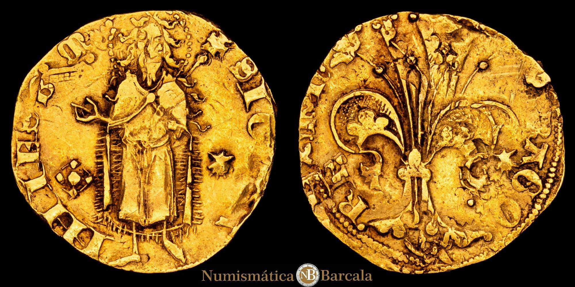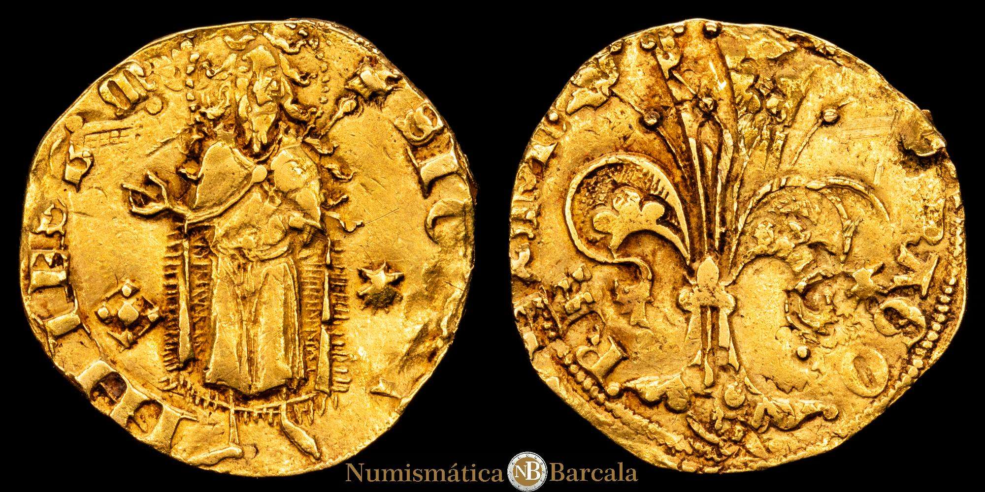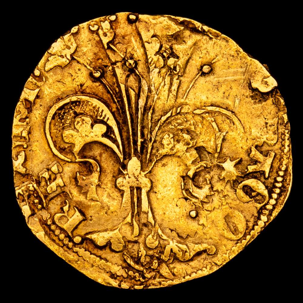Marti I (1396-1410). Mallorca. Florín. (Cru.VS 495) (Cru.CG 2301). Anverso: S IOH-NNIES B M. Reverso: ()RGO-REX MAR. Marcas: rombo ajedrezado – concha de vieira en el anverso y rombo partido – concha de vieira en el reverso. Doble acuñación curiosa. Pequeña laminación en el canto del reverso. 3,41 g. MBC. Ex Aureo Calicó 18/09/2014, n.º 871.