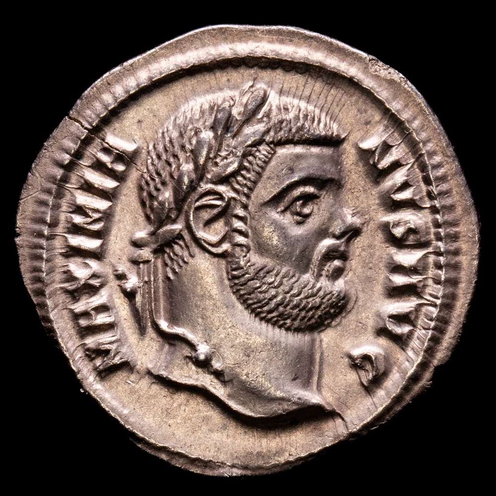 Maximiano, primer reinado, 286-305. Argenteus (Plata, 19 mm, 3,00 g, 6 h), Cícico, circa 295. MAXIMIA-NVS AVG Cabeza laureada de Maximiano a la derecha. Rvdo. VICTORI-A SARMATICA / CM Los cuatro tetrarcas sacrificando sobre un trípode frente a la puerta de un campamento con seis torretas. Gautier 8. RIC 5b corr. (rotura evidentemente incierta). Acuñada con troqueles algo desgastados y con una grieta en el flanco; por lo demás, en muy buen estado. De una colección europea, formada antes de 2005. Ex Leu Numismatik 2024.