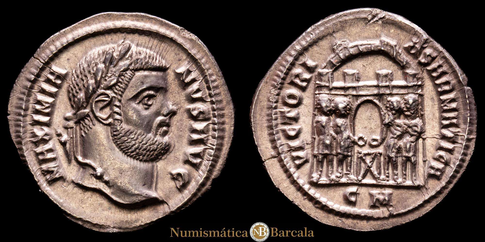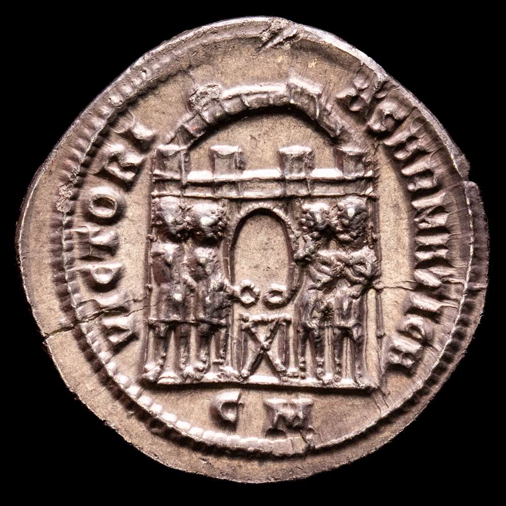Maximiano, primer reinado, 286-305. Argenteus (Plata, 19 mm, 3,00 g, 6 h), Cícico, circa 295. MAXIMIA-NVS AVG Cabeza laureada de Maximiano a la derecha. Rvdo. VICTORI-A SARMATICA / CM Los cuatro tetrarcas sacrificando sobre un trípode frente a la puerta de un campamento con seis torretas. Gautier 8. RIC 5b corr. (rotura evidentemente incierta). Acuñada con troqueles algo desgastados y con una grieta en el flanco; por lo demás, en muy buen estado. De una colección europea, formada antes de 2005. Ex Leu Numismatik 2024.
