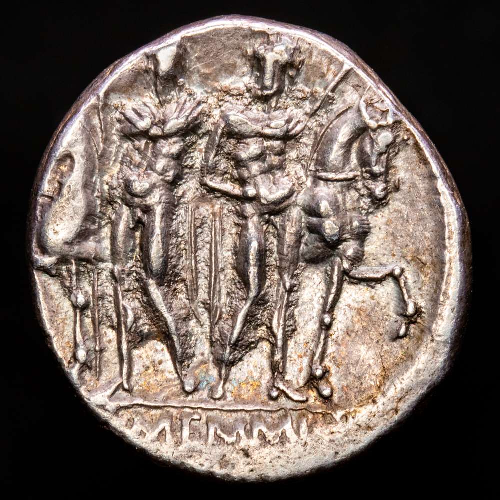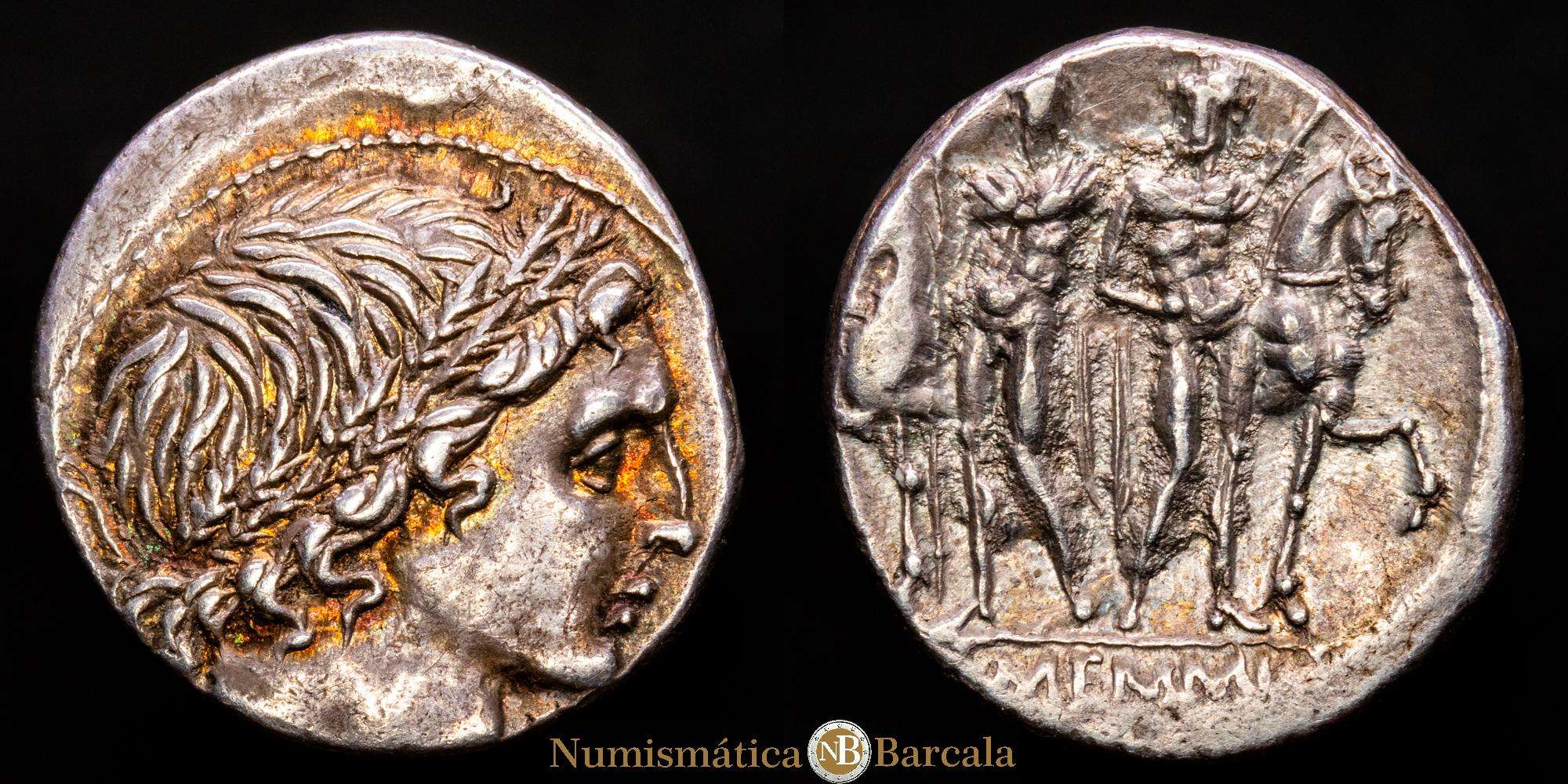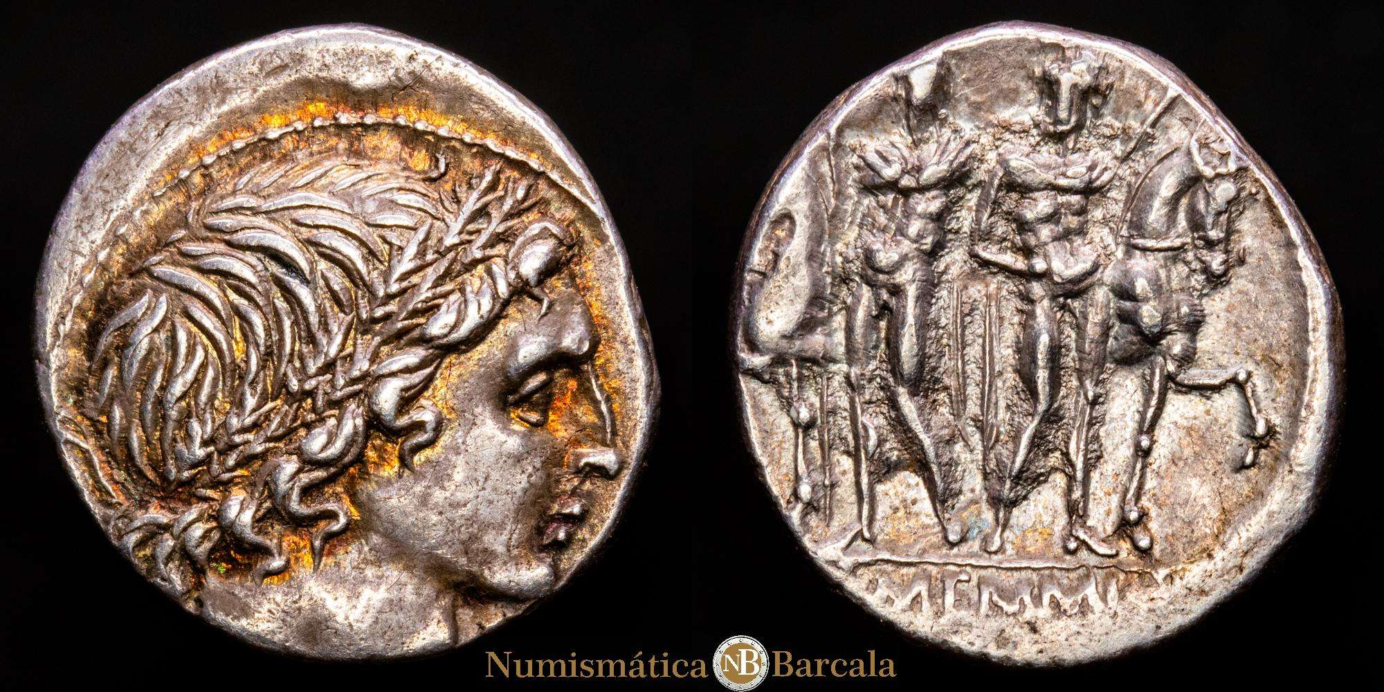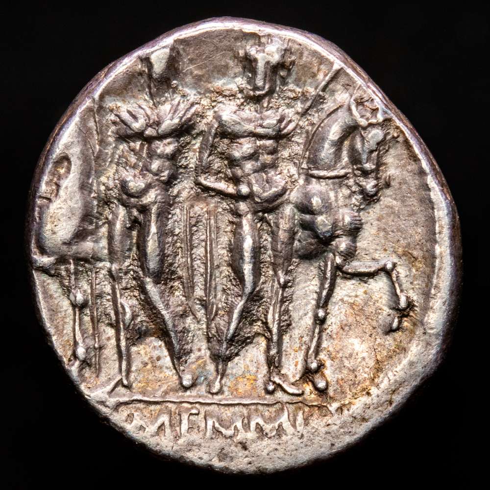Numismática Barcala > Productos > Memmia. L. Memmius. Denario. 109-108 a.C. Sureste de Italia. (Ffc-906). (Craw-304/1). Ag. 4,01 g. Suave pátina con un llamativo tono iridiscente. Atractivo ejemplar. EBC.