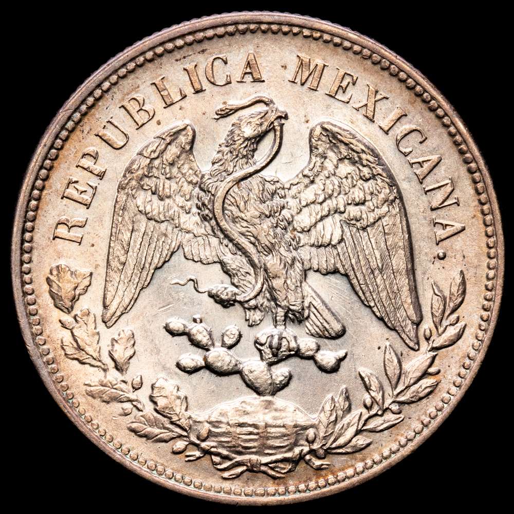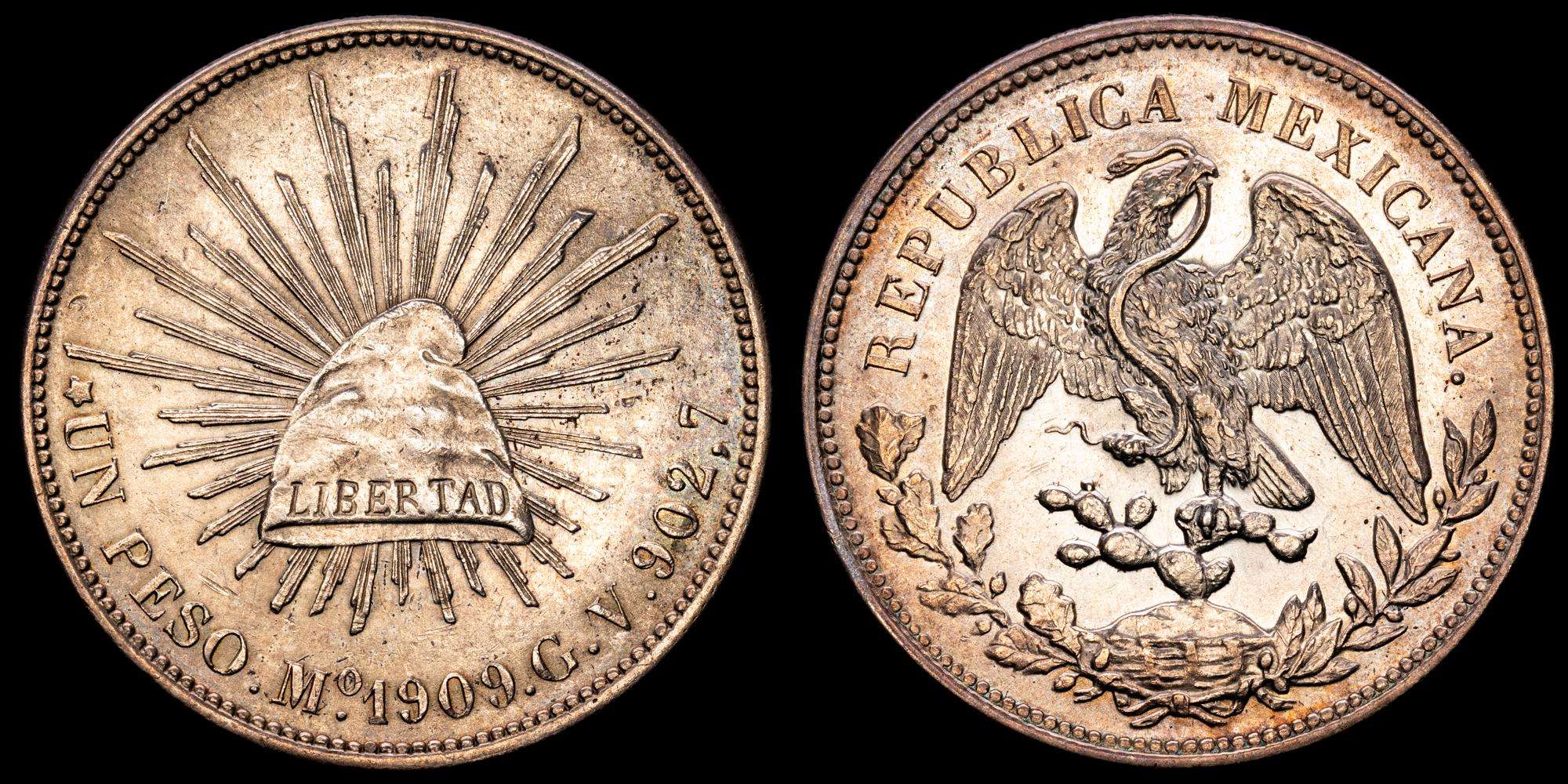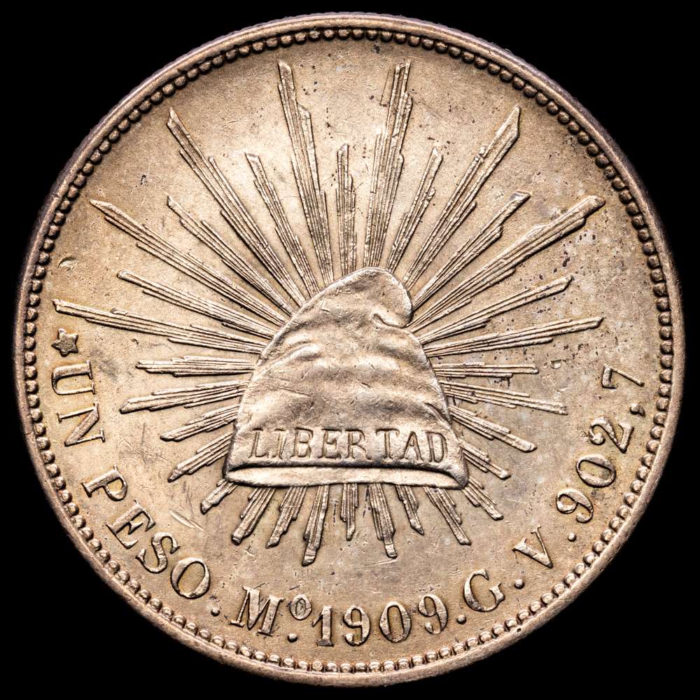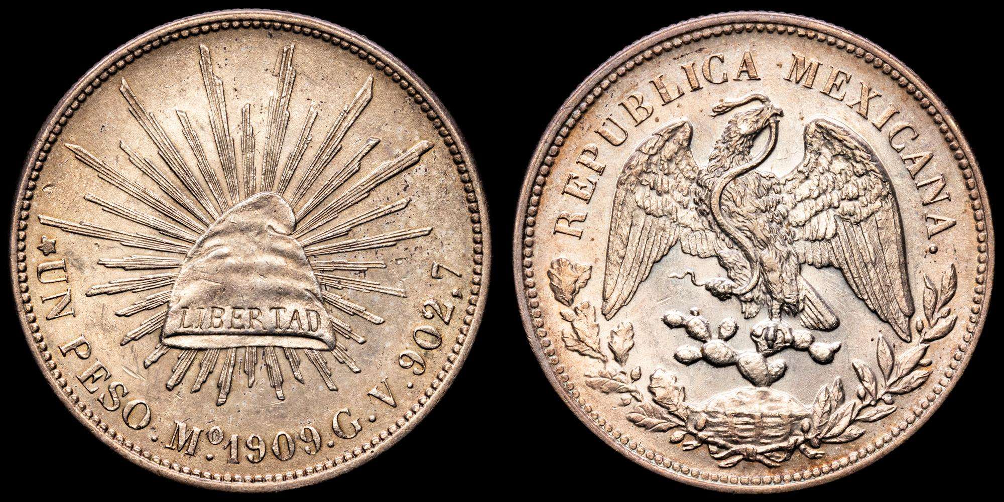 Numismática Barcala > Productos > México. 1 pesito. 1909. México. GV. (Km-409,2). Ag. 27,16 gramos. Restos de brillo original. Ligera pátina. UNC-.