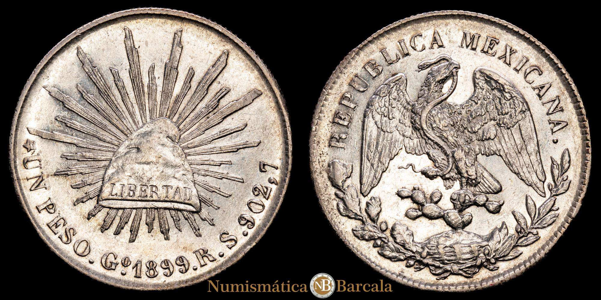 México. 1 Peso. 1899. Guanajuato. RS. (Km-409,1). Ag. 27,01 gramos. Parte de brillo original. EBC+.