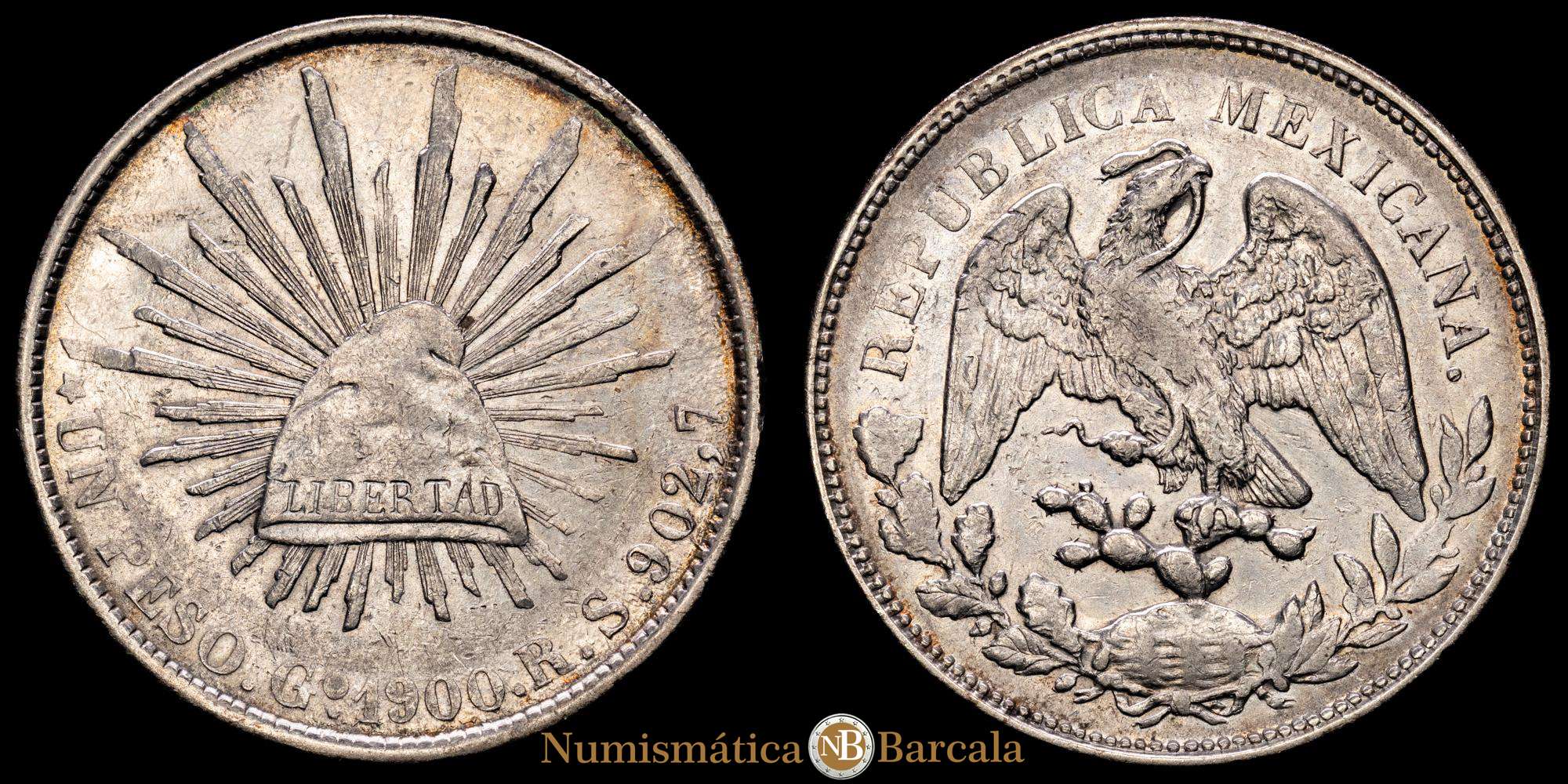 México. 1 Peso. 1900. Guanajuato. RS. (Km-409,1). Ag. 27,24 gramos. XF. Escasa.