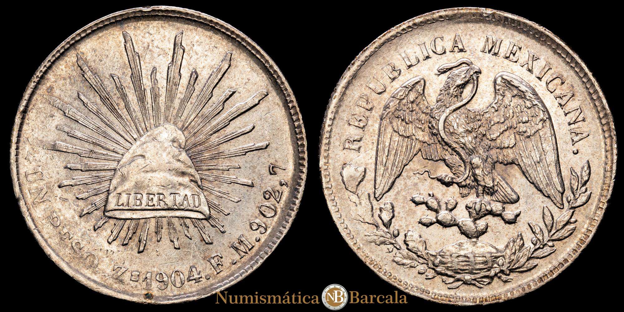 México. 1 Peso. 1904. Zacatecas. FM. (Km-409,3). Ag. 26,93 gramos. EBC. Tono.