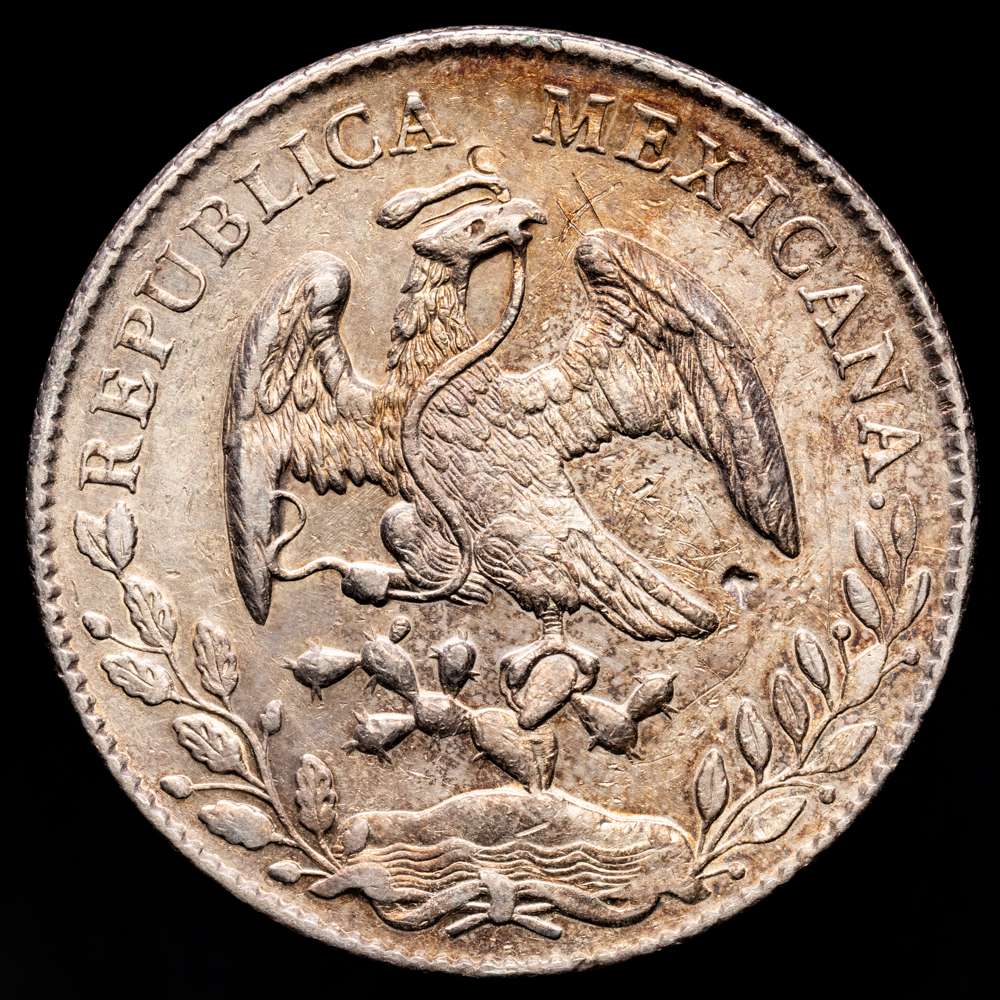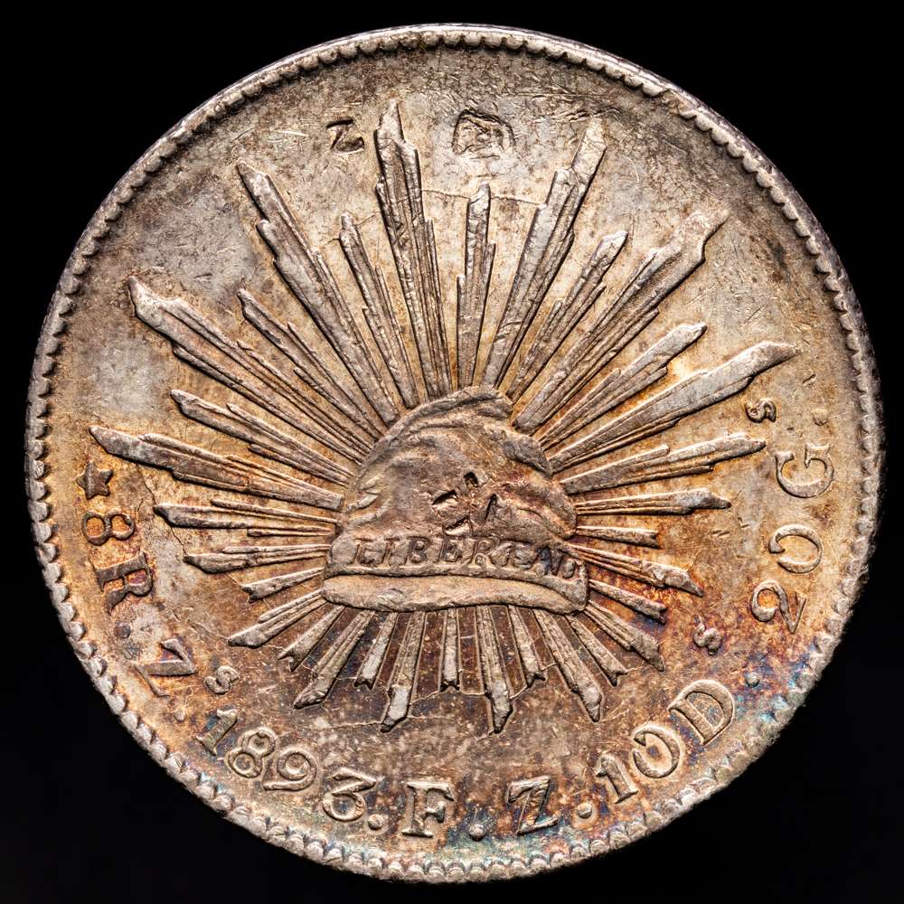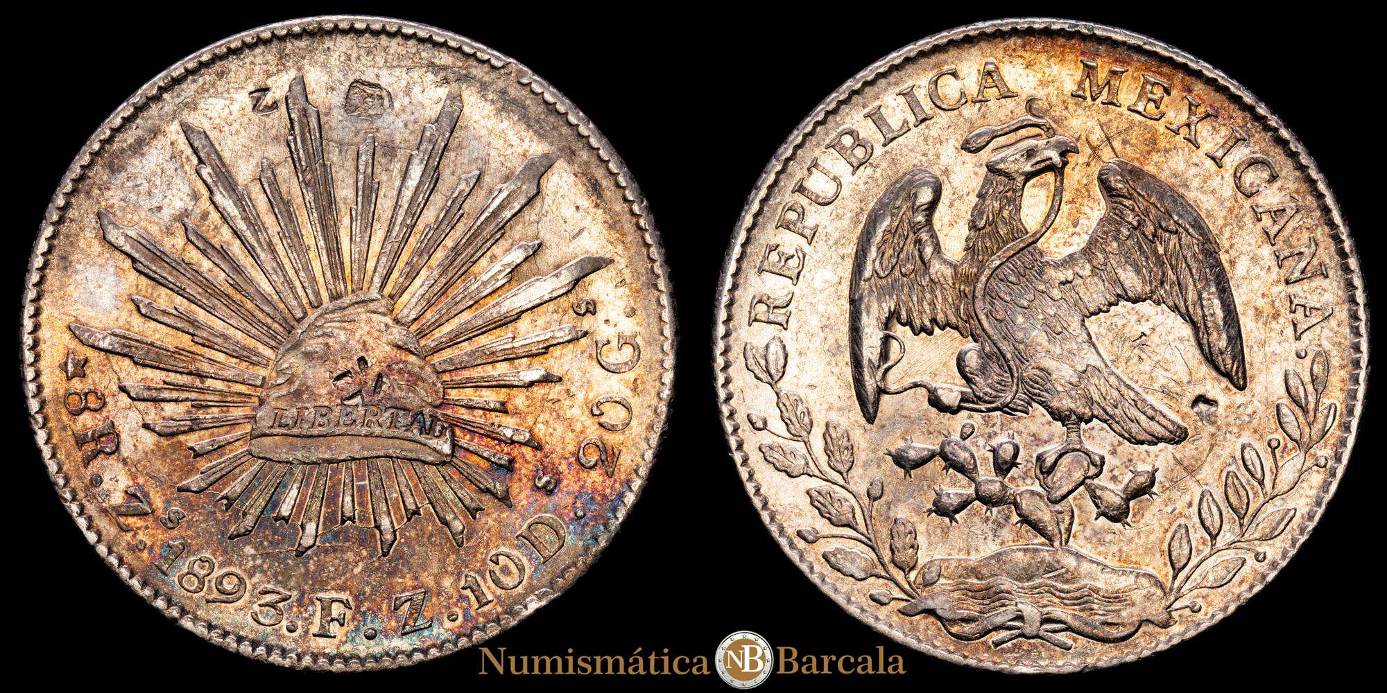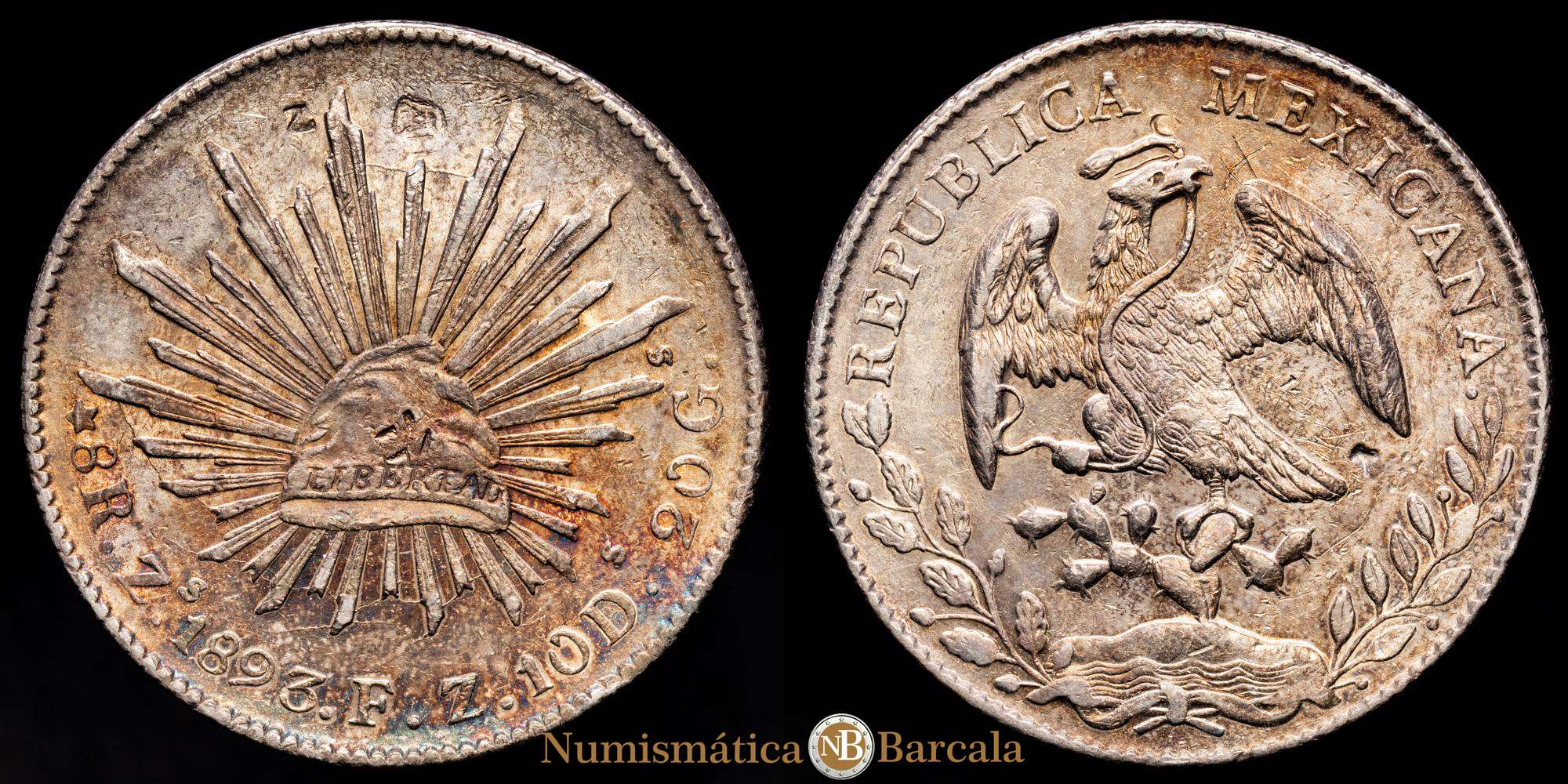 México. 1893. Zs (Zacatecas). FZ. 8 reales. (KM. 377.13). Golpecitos. Pequeños resellos orientales. AG. 26,91 g. Bonita pátina irisada. Precioso ejemplar. EBC-.