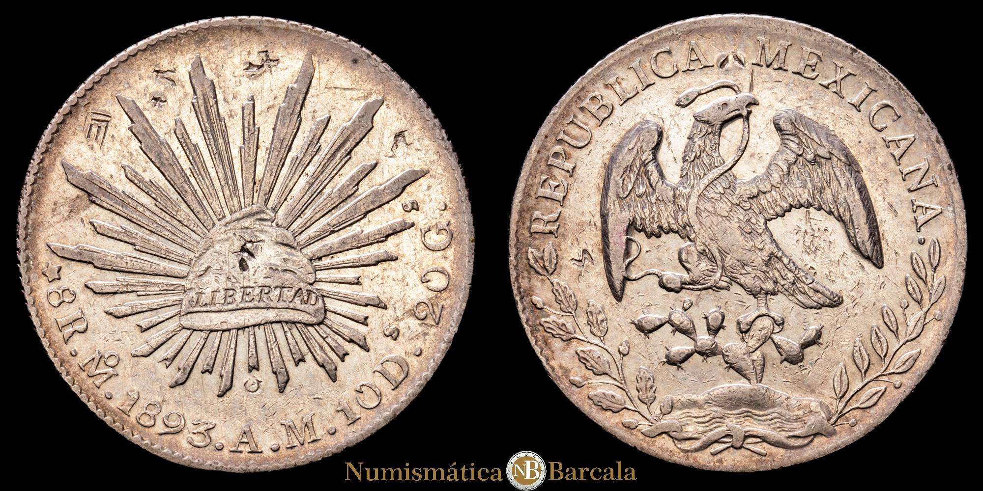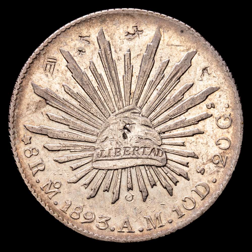 Numismática Barcala > Productos > México. 8 reales. 1893. Ciudad de México. AM. (Km-377.10). Ag. 26,86 g. Resellos orientales. Restos de brillo original. XF.